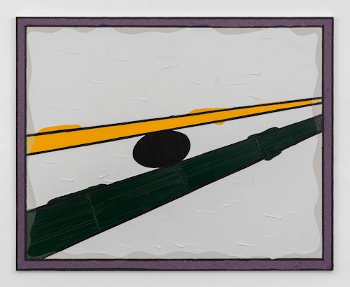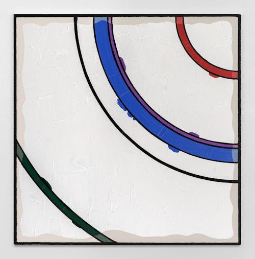 At the heart of the presentation is a new series of paintings that belong to one of Lavier’s most iconic bodies of work: Walt Disney Productions. The starting point for the project, which began in 1984, is to be found in a Walt Disney comic strip from 1977, in which Mickey and Minnie Mouse visit a modern art gallery. Here, they encounter an array of paintings and sculptures that ingeniously mimic genuine modern and contemporary art (the biomorphic sculptures in the story resemble the work of Jean Arp, for example). Fascinated by this, Lavier started to make life-size replicas of the Disney artworks. Hence his colourful, abstract canvases are directly inspired by the paintings that sprang from the cartoonist’s imagination but which, in their own humorous way, were undoubtedly based upon real works of art. By appropriating the fictitious paintings from the inaccessible, printed page and presenting them as autonomous objects within a real gallery space, Lavier recreates an equivalent viewing experience to that of Mickey and Minnie. This loop calls into question the link between fact and fiction – notably the point as which the simulacrum becomes reality – and the representation of modern art in society. Interestingly, the striking simplicity of Lavier’s compositions and the thick, painterly surfaces belie their technical complexity: each canvas incorporates a number of different materials and techniques, ranging from photography to laser-jet and silk-screen printing.