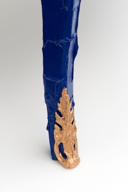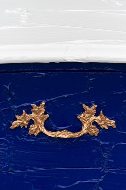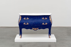 Walt Disney Productions is but one of several distinct bodies of work that Lavier has developed over the years, and which he refers to as chantiers. The term means ‘building site’ in English: a reference to the fact that each corpus is a work in progress, and therefore a mechanism through which to deal with constantly evolving issues about the nature of art, and the way that it is both appreciated and exhibited. Another famous chantier encompasses three-dimensional objects that have been covered in a thick layer of paint, one that is identical in colour to whatever lies beneath, right down to the smallest details. Except for the paint, Lavier’s objects look exactly like the original – which confuses the viewer’s visual perception. The cabinet in this exhibition is a typical example of this process. Lavier describes these works as being painted sur le motif, a 19th-century artistic term that means ‘the painting of objects’ or ‘what the eye actually sees’. In this chantier, the idea is taken to a literal extreme. Yet by playing with such ambiguous words and concepts, the artist is also inviting the viewer to consider the true nature of this cabinet: is it an ordinary object or an artwork? Thus Lavier questions our notions about the way in which works of art are perceived, valued and accepted.