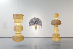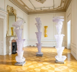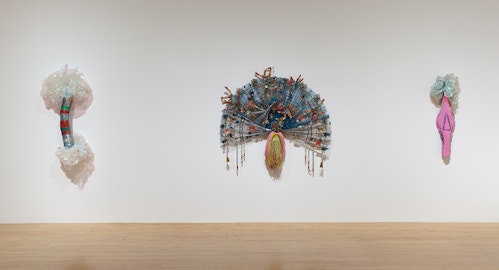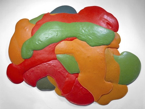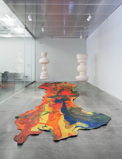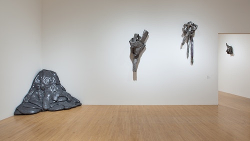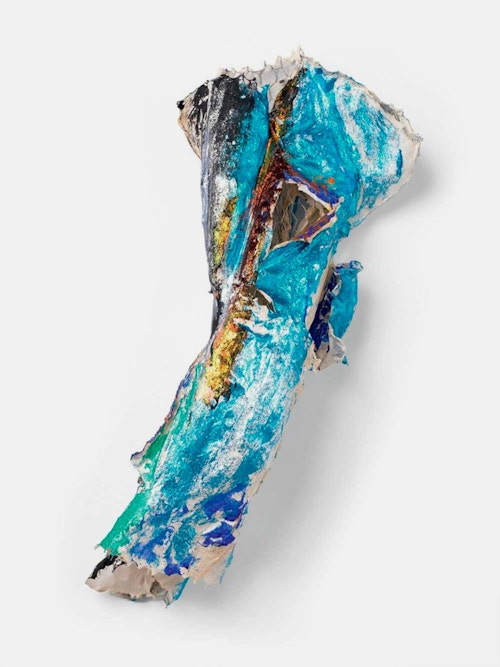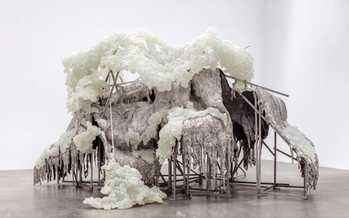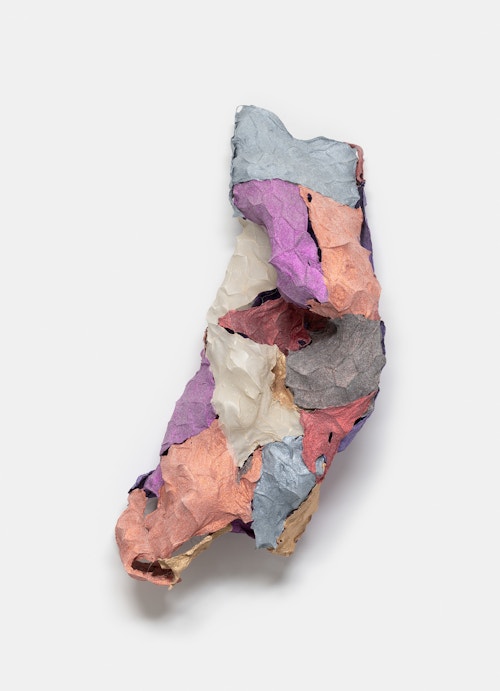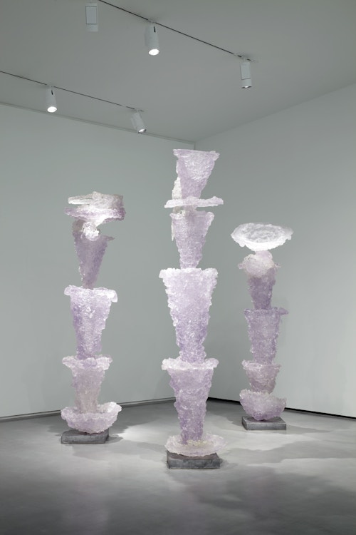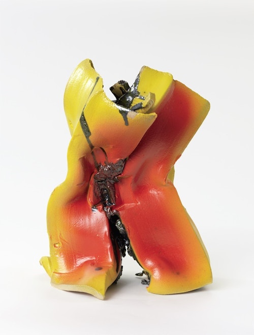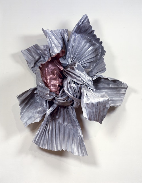 Lynda Benglis is recognised for an oeuvre that has consistently challenged art-historical and technical conventions while treading new and experimental ground. Driven by an inventive and interrogative approach to both the physical and aesthetic properties of her chosen materials, she works in a broad range of media including beeswax, latex, polyurethane, glitter, luminous paint, plaster, metal, glass, porcelain and paper. With sculpture as a primary focus, Benglis creates pure, abstract works that are typically inspired by natural and organic forms. She often combines an element of visual seductiveness—reflective or sparkling surfaces, transparency, vivid hues—with atypical shapes, challenging the relationship between painting and sculpture and their respective modes of presentation. As a young artist in the mid-1960s, Benglis explored such issues by throwing brightly-coloured liquid latex onto the floor to create large ‘poured’ works that expanded the prevailing discourse around minimalism and the legacy of abstract expressionism. Working in photography and video primarily in the 1970s, Benglis created radical images that sought to undermine gender stereotypes and discrimination against women artists within male-dominated artistic circles. More recently, she has harnessed technology to arrest waves of polyurethane foam in mid-air, thereby transforming them into solid, three-dimensional objects and continuing her exploration of the ‘frozen gesture’.