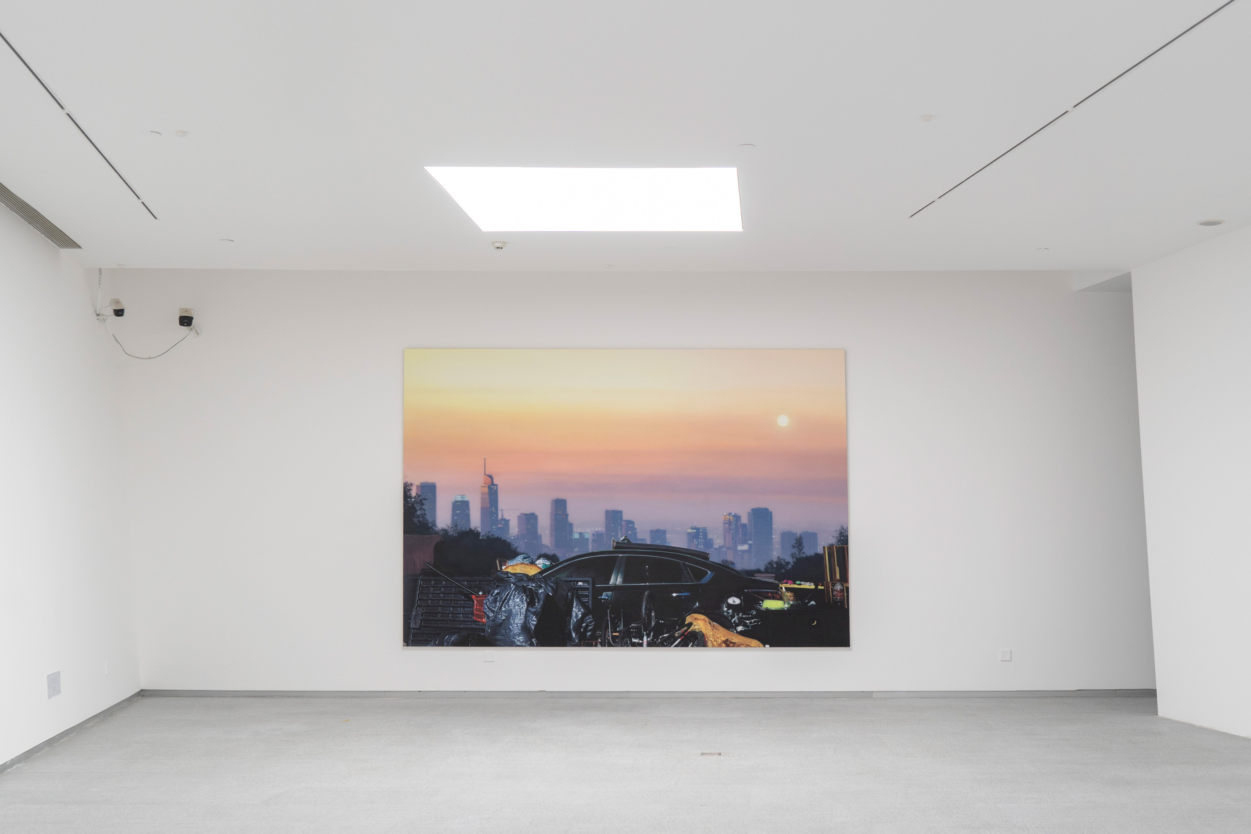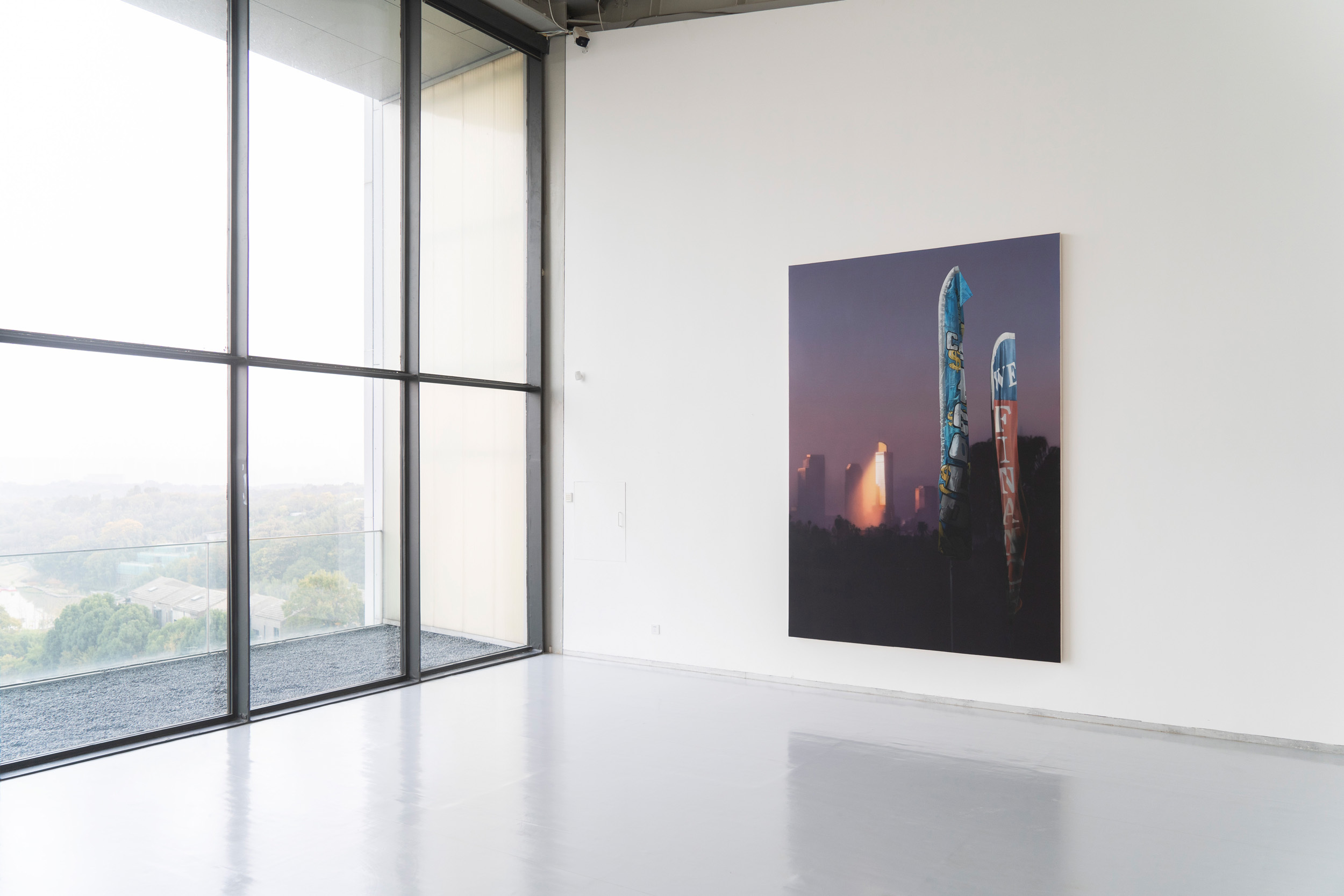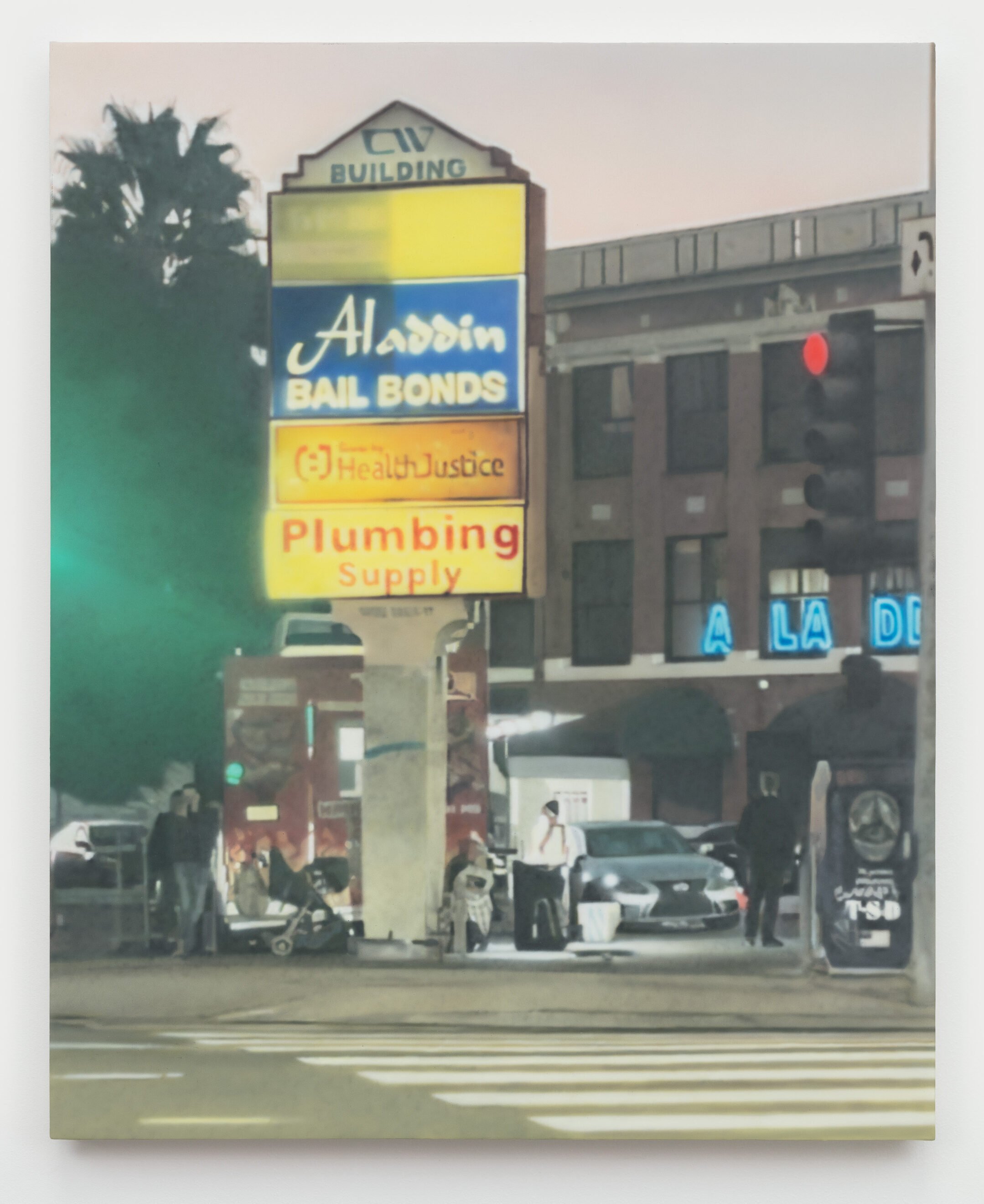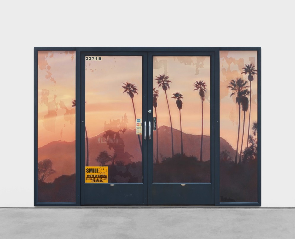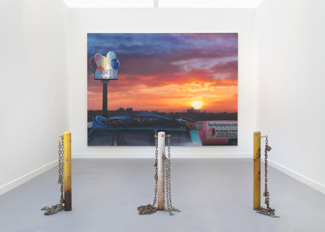 Sayre Gomez has risen to prominence in recent years with his semi-fictionalised and photorealistic paintings known as X-scapes. Executed in a wide range of techniques, including trompe l’oeil, airbrushing, stencilling and those used to paint Hollywood sets, his work is inspired by the urban landscape of Los Angeles. Many of his paintings feature the housing, road signs, billboards and landmarks that form the backdrop to long car rides around the city. His paintings can simultaneously touch on the beauty of nature (vivid sunsets, sumptuous palms), the passage of time, urban decay and commercial nostalgia (signs, colours and lettering often evoke bygone days) and contemporary life (graffiti, cell phone masts). Gomez synthesises his observations into hyperreal images that challenge our ability to differentiate between authenticity and simulation: a cityscape that feels true-to-life might just as easily be an artificial construction. In this way, he explores the increasingly tenuous link between our everyday surroundings and a digital culture that is relentlessly driven by enhanced and manipulated images. The flawless execution and even luminescence of Gomez’ canvases, as well as the shifts between hard and sharp focus, can be seen as painterly reflections on the digital flattening and blurring of life and culture through screen-based technology. Openings and barriers, such as windows, doors, gates, shutters, walls and fences, are recurrent metaphors in his oeuvre that suggest Los Angeles is a city of promise and freedom, but also one of broken dreams and destitution. Gomez also explores these themes through other mediums, including sculpture, installation and video.