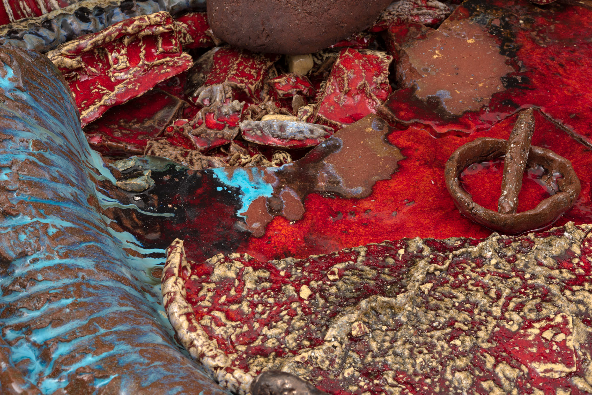 Sterling Ruby is known for the multifaceted nature of his practice, which encompasses painting, ceramics, collage, video and photography, textiles, sculpture and installations. Working in a wide range of media, from the traditional to the unconventional, Ruby has created an oeuvre that, while remarkably diverse, is firmly rooted within a complex and coherent artistic strategy. Often drawing upon autobiographical, art historical or sociological sources, the seemingly ‘incomprehensible’ visual range of Ruby’s practice embodies a schizophrenic, ‘post-everything’ state of perpetual fragmentation and synthesis. His practice involves a combination of philosophical enquiry and material investigation, the latter involving the seemingly endless repurposing, combining and recombining of different techniques and media. This too mirrors a shifting condition of constant deconstruction and reconfiguration, and the idea of a non-hierarchical, boundary-less universe.