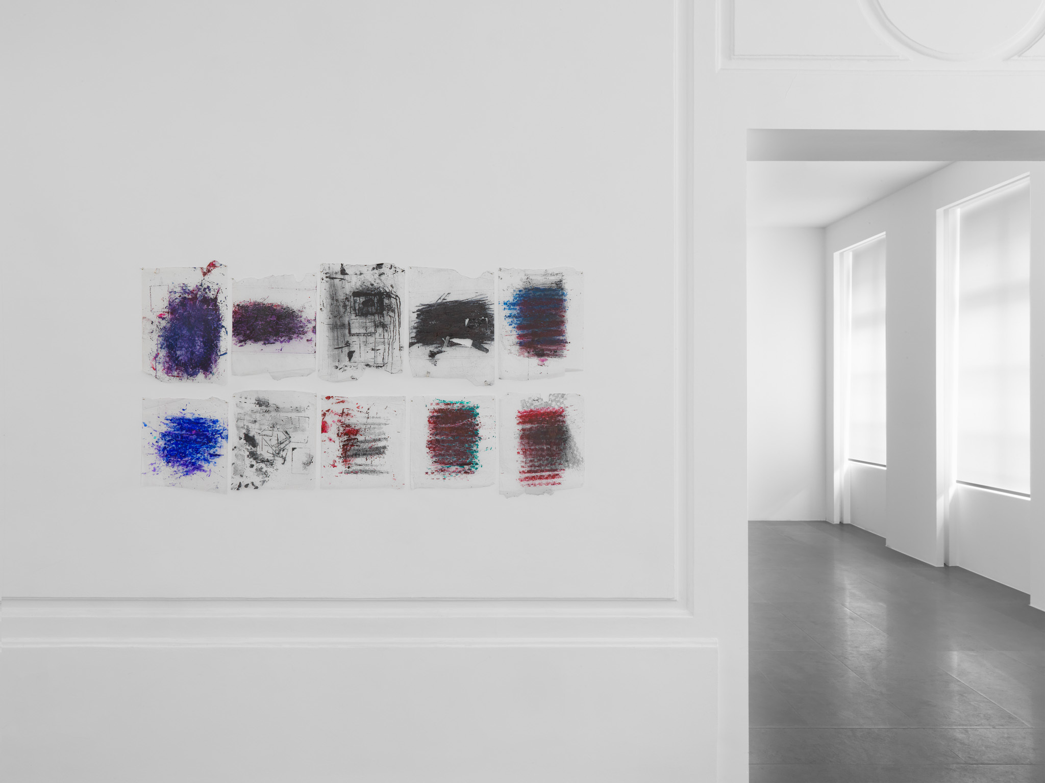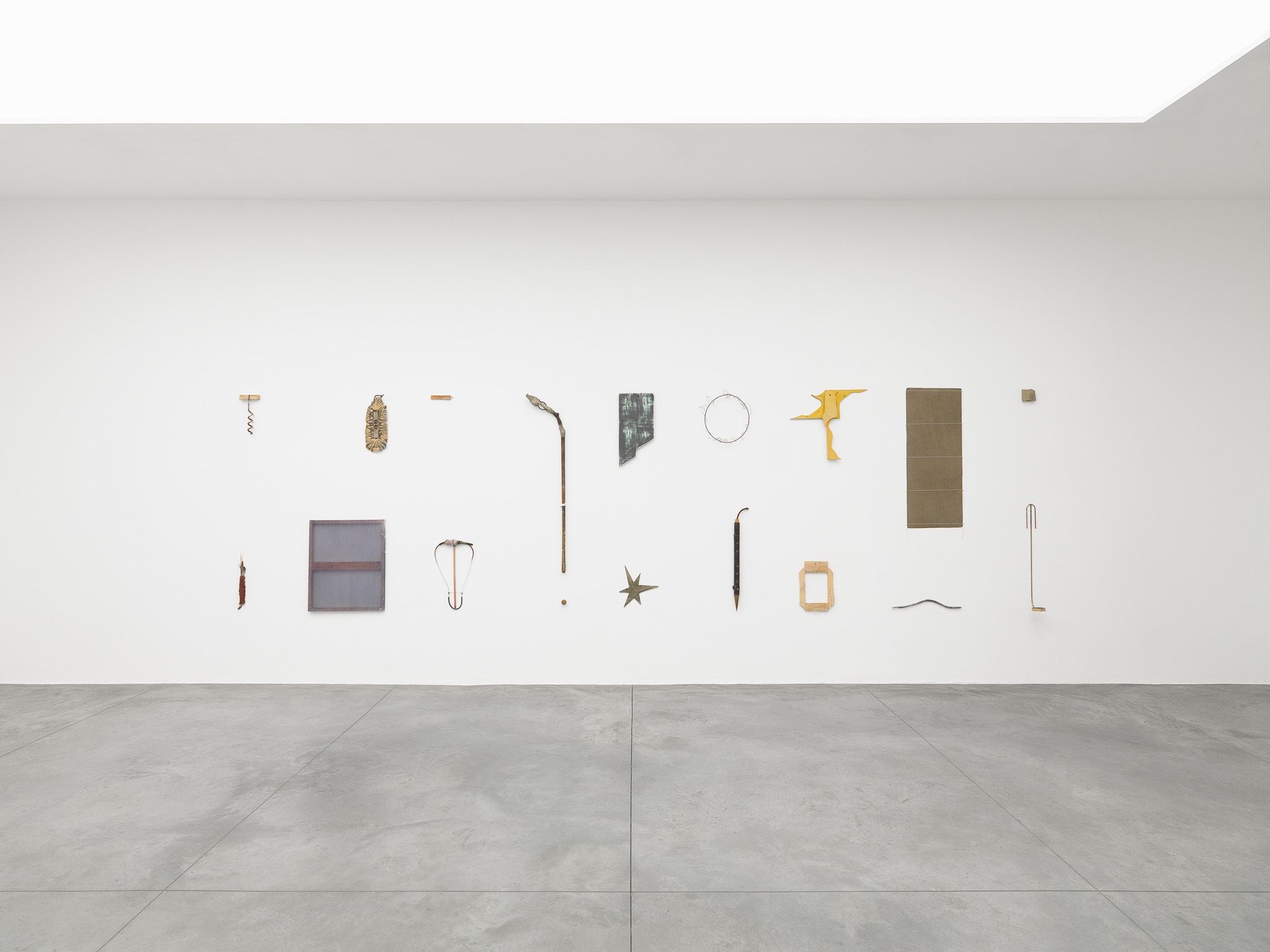 ‘Fields is a sculpture that came to me by accident in 2011. Originally I placed four rocks in the corners of a large piece of paper to make a drawing. I was working on the floor and it instantly dawned on me that it was complete. It represented a moment of alchemy in which magic was possible and what was to happen between the rocks was limitless. I could feel a field of energy being created in the center of the paper. From there I changed the materials to two hand-dyed pieces of linen soaked in Purpurissum (a combination of Murex, Indigo and Madder originally used in the ceramics of Pompeii) in place of the paper and each rock was replaced by an aluminum sulfate crystal. At the time I was living in Rome and I was researching the history of Murex and its symbolic relationship to royalty. Murex is a dye (now an available pigment) more expensive than gold by the gram and is extracted through the fermentation of a gland from a rare mollusk in the Mediterranean. The resulting dye can be used to treat fabric by a delicate process of dyeing/staining in which the dye oxidizes in the sun going from yellow to green and finally to a light purple. It was originally recorded and used in the times of Pliny the Elder to signify royalty by dyeing textiles with thin stripes. It is said to take over 10,000 mollusks to make one gram of the Murex pigment. I wanted the historic narrative of the ingredients to be a part of the process while creating a portal in which anything you mentally put on to the ground in front of you would metaphorically materialize. It became like a new age wishing well related to the cult of painting and led to my current interest in a certain kind of tool that precedes language. Drawn & Quartered is an indexical display of these ‘tools’. Consisting of 18 parts, the index works like an alphabet for a newly conceived manifesto in which, like all manifestos, the tools of the present have become inadequate. My hope is that through the material investigations with elements like Bismuth (the heaviest metal that is not radioactive and often used in shotgun shells instead of lead for its non-toxicity) and processes such as wrapping and sharpening I am setting the stage for an abstract space that as the Gutai artists spoke of can be a “subjective shape of space, one which really deserves the name creation”.’