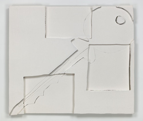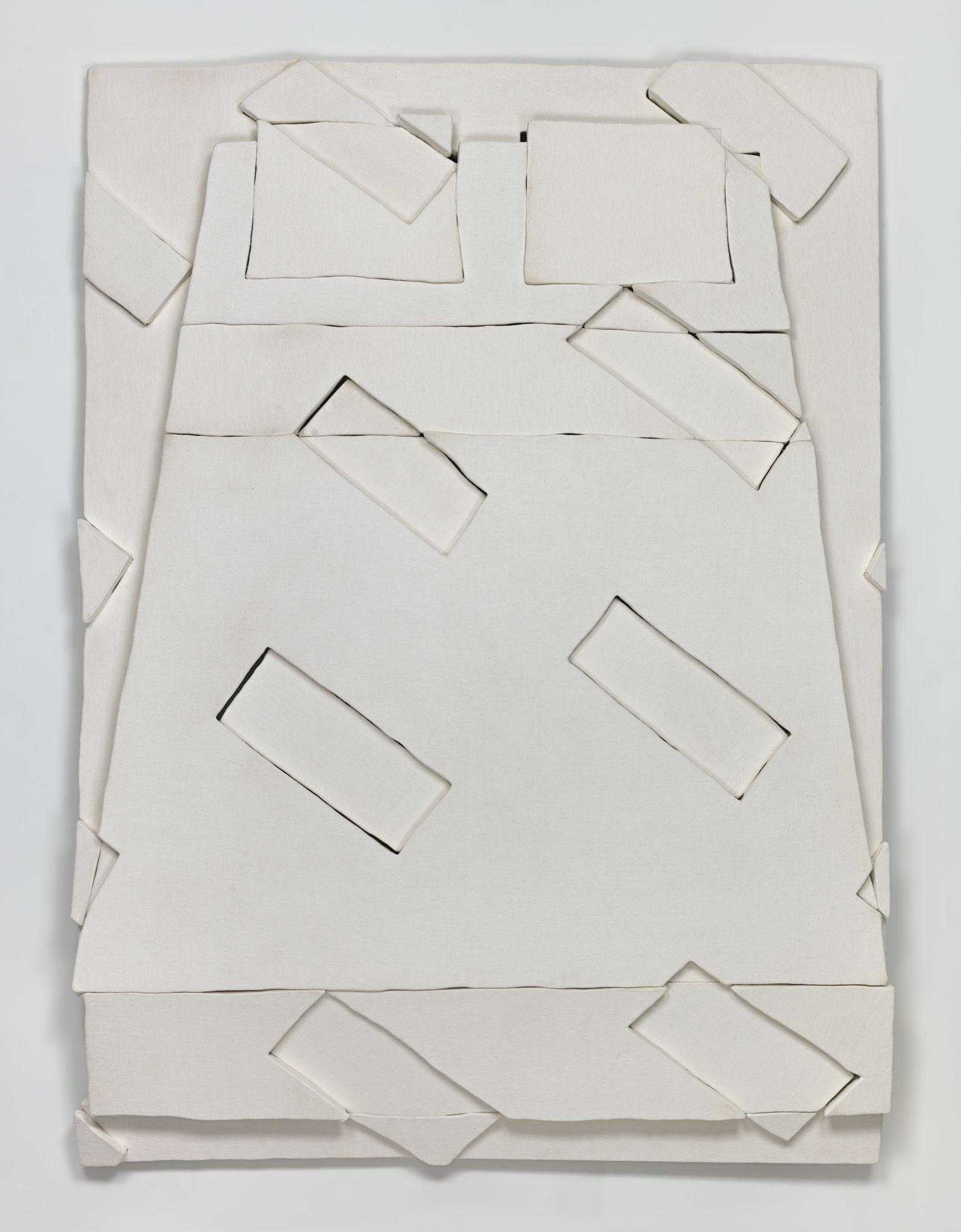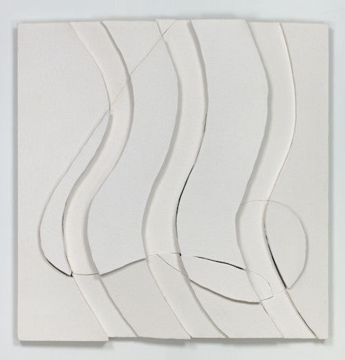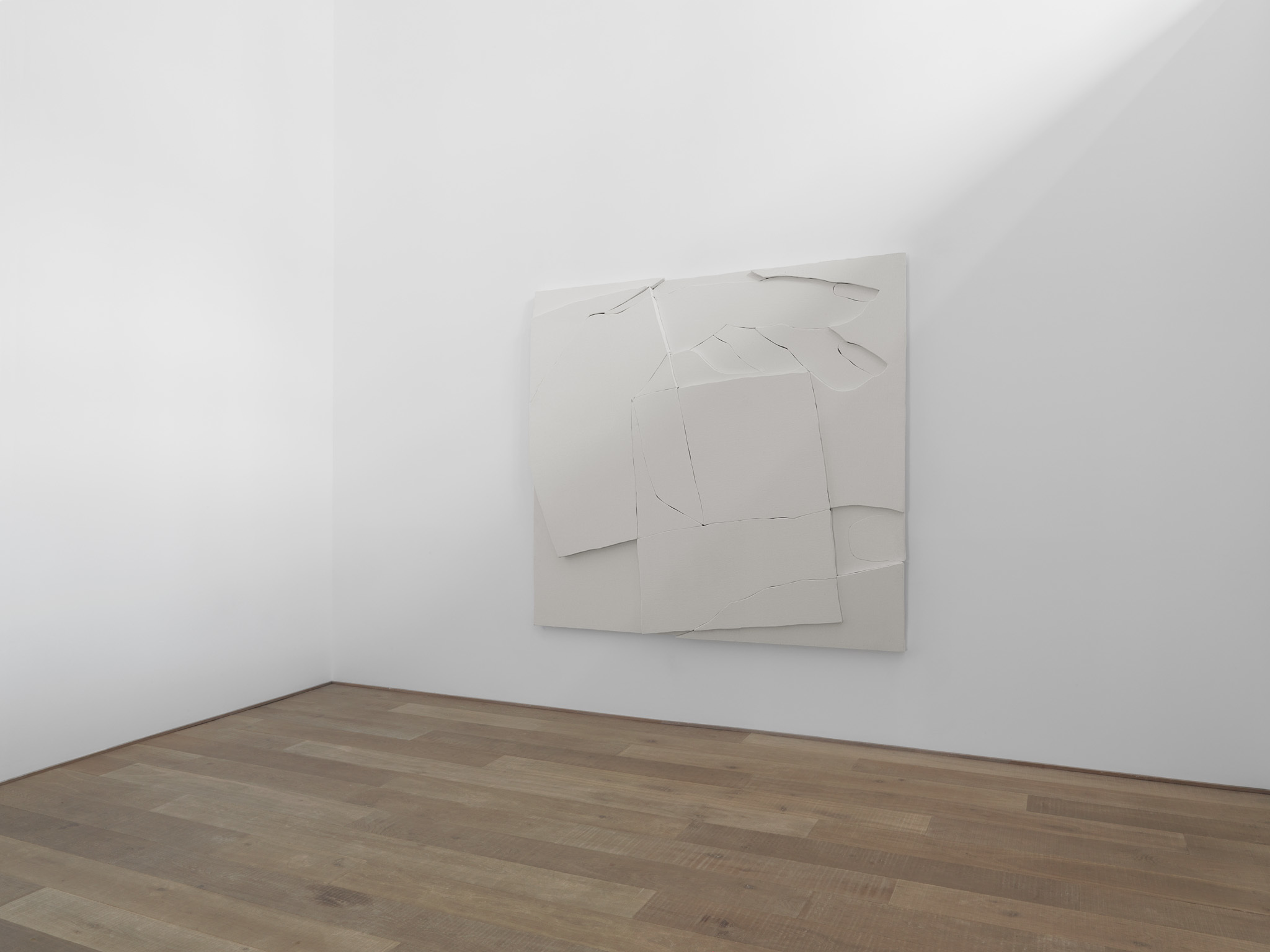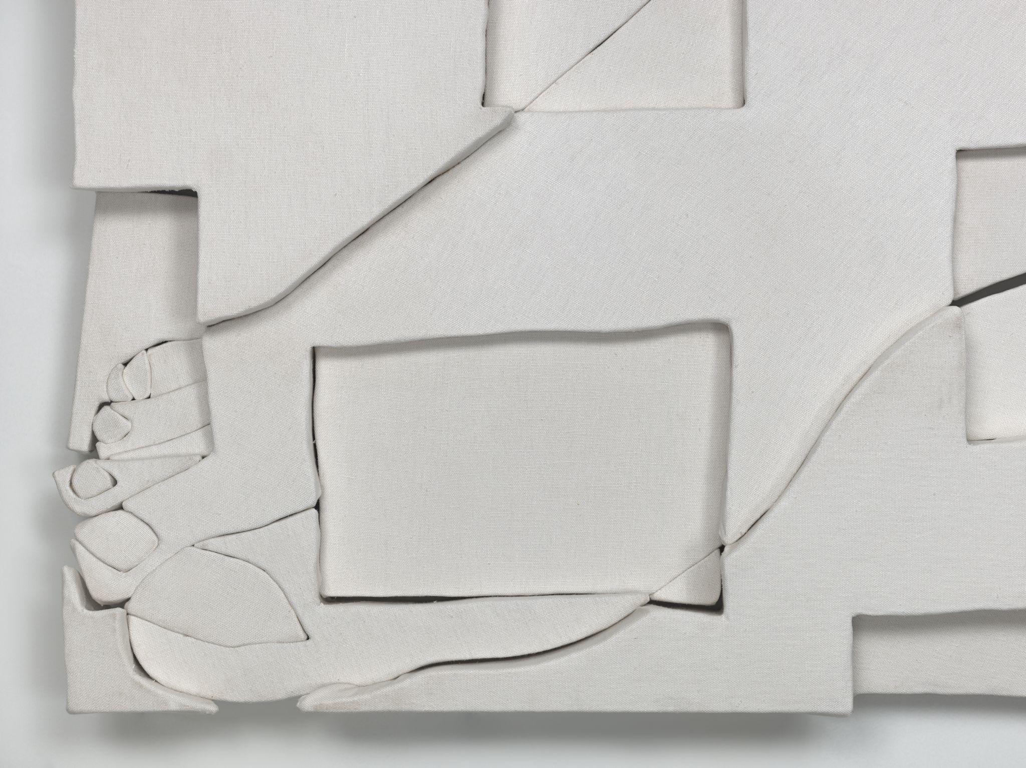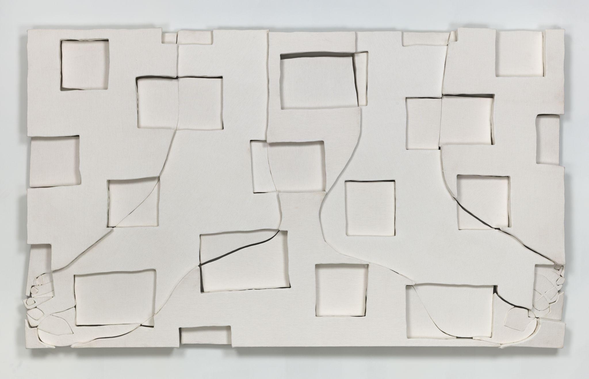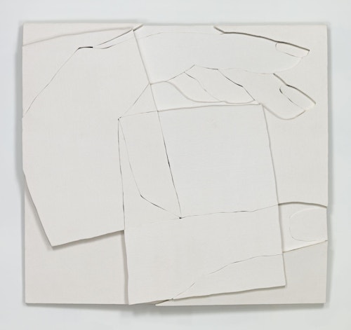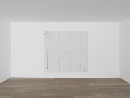 Wyatt Kahn is known for a striking body of work that investigates the boundaries between painting, sculpture and drawing. Comprised of unprimed layers of linen stretched across wooden frames, Kahn assembles complex wall-mounted works in which the gaps between the individual panels form abstract or pictorial compositions. An initial way of approaching his oeuvre is to consider the way in which it is created: each new series typically begins with sketches in pencil and pen, which are slowly refined into definitive drawings. These are transferred onto wood and cut apart. Kahn then stretches two layers of linen or canvas over the panels, typically the same heavyweight material that would be used for stretching paintings.