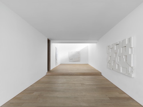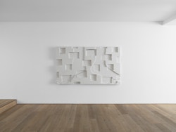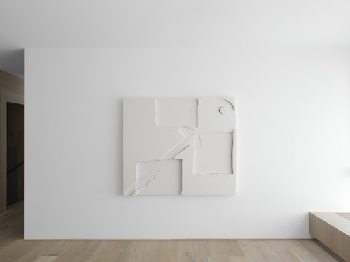 While Kahn’s constructions might resemble paintings, and are made of similar materials, they are completely devoid of paint. Rather, they are three-dimensional, semi-sculptural objects in which negative space (the gaps between the panels) not only establishes structure and depth, but also line. In this sense, the works are akin to spatial drawings or, in other words, they are the three-dimensional iterations of two-dimensional, linear compositions. Dispensing with the arbitrary constraint of the rectangle, Kahn allows the formations to extend across the wall-space, sometimes leaving voids that capture the architectural support within the piece. Speaking of this facet of his work, Kahn has said: ‘I see them as drawings, where the wall is the paper. The whole object is the drawing on the wall.’