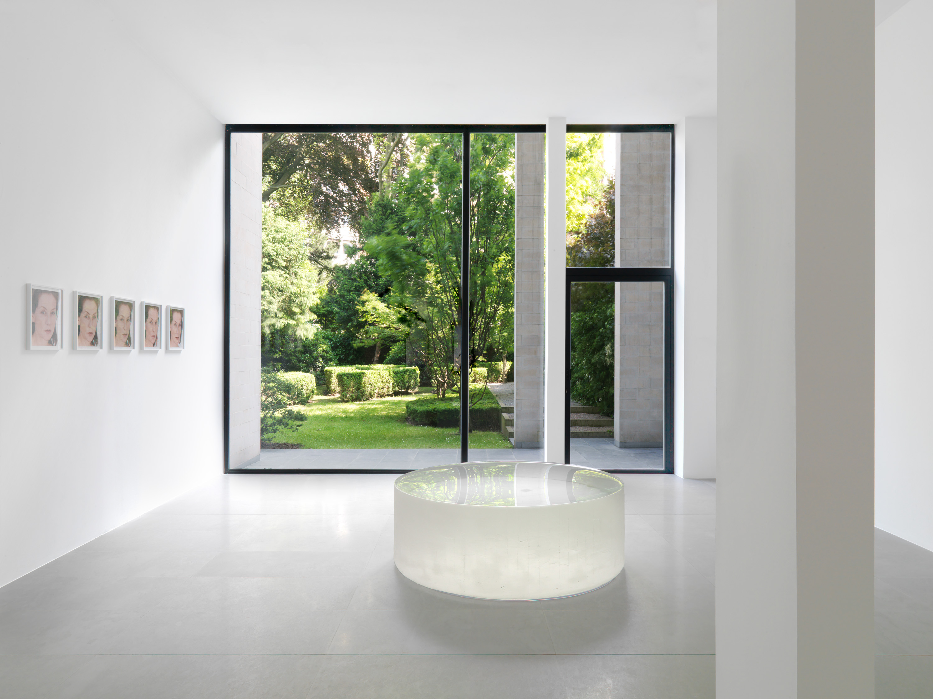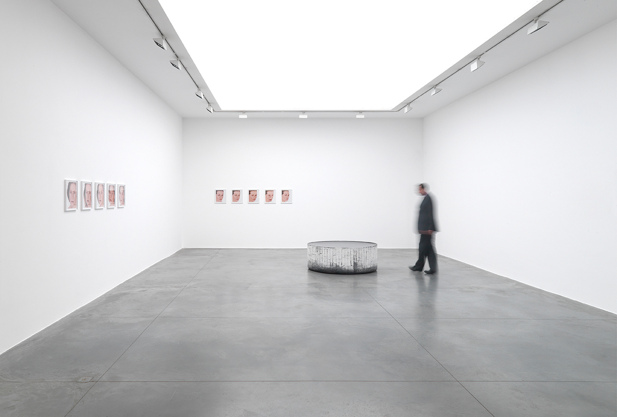‘Opposite of White – v.1’ and ‘Opposite of White – v.2’ are two circular, almost identical, white- and blackcoloured glass blocks of 142 cm diameter and 51 cm high that each weigh more than 2000 kgs. While their frosted sides, still slightly gritty, bear the minute imperfection with which they have emerged from the moulds, their tops are polished to a perfect, limpid gloss. Despite their massive forms and their interiors that can only be intuited, the blocks continuously interact with their environment. Circumstantial differences like the changes of light and weather, the varying experiences by the individual visitors inscribe the sculptures with a fundamental sense of motility. By installing both sculptures in separate exhibition rooms, Horn crafts a complex relationship between the sculptures as well as between the viewer and the work. The sculptures further denote Horn’s preoccupation with pairs as a favoured format.
