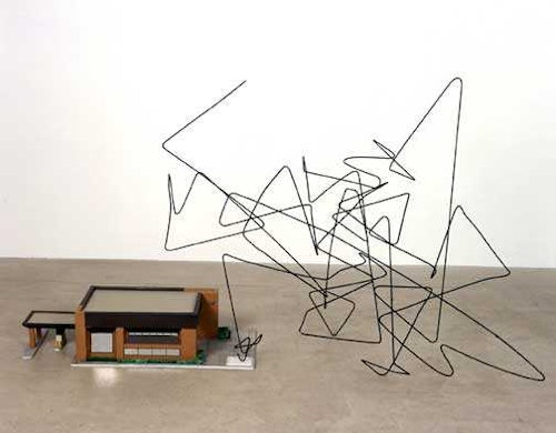 Red, White & Blue Sculpture est construite sur base d’une seule branche d’arbre. Suivant un système volontairement imposé, Holloway casse chaque branche précisément en son milieu jusqu’à la branche suivante pour ensuite la rattacher dans un angle droit. La linéarité explicite de la sculpture finale contrarie l’origine naturelle de la branche pendant que les branches fragiles semblent contester, à leur tour, la rigidité du principe sous-jasent. La peinture acrylique en couleurs blanche, rouge et bleu dont la sculpture est systématiquement couverte affirme ce contraste entre l’artificiel et organique, la culture et la nature, mais suggère aussitôt, par sa présence tricolore, l’idée d’un monument national fragile.