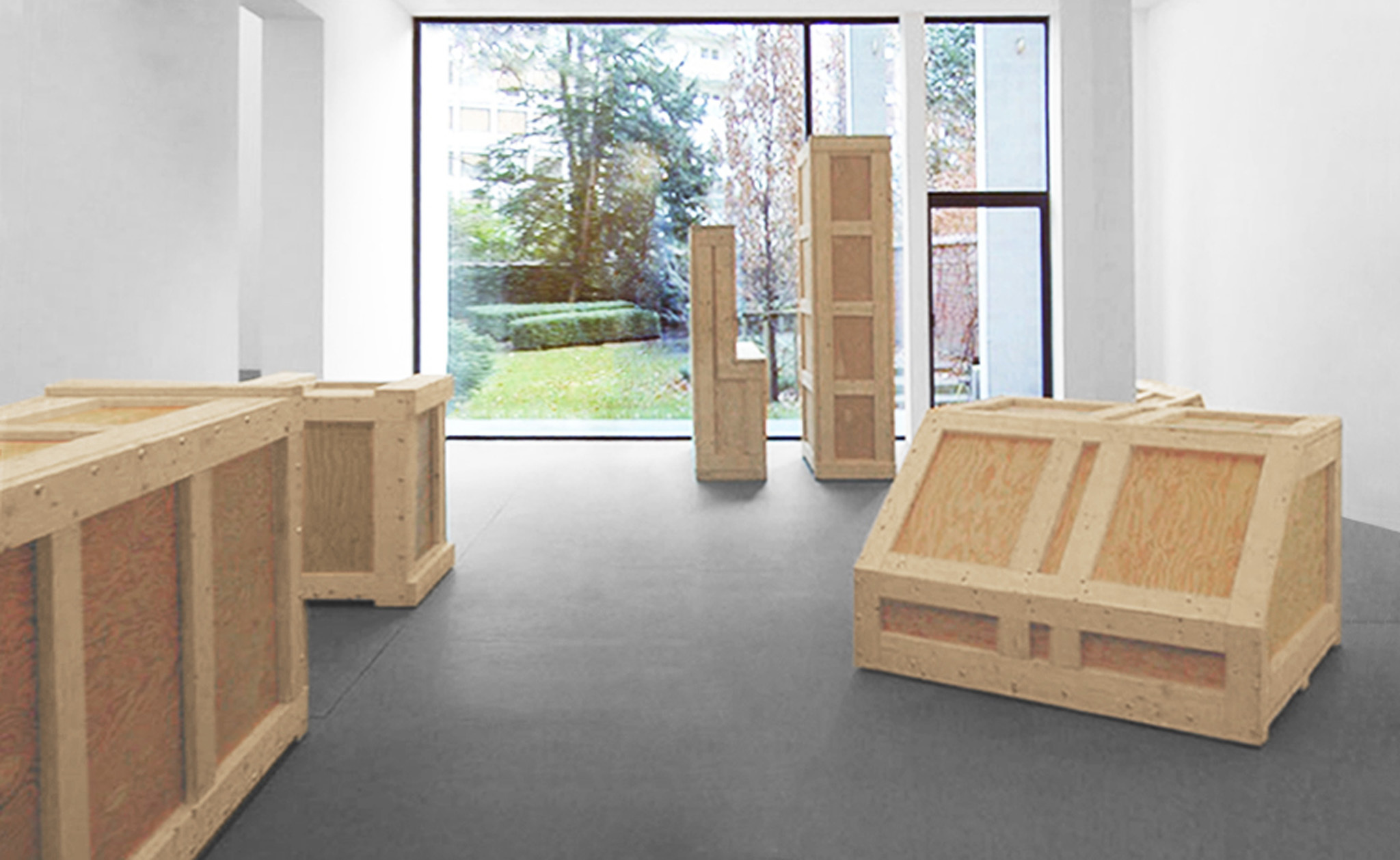 Le « mobilier » que Richard Artschwager expose à la galerie, sont des caisses qui sont normalement utilisées pour transporter les oeuvres d’art. Bien que par leur aspect robuste et brut, elles ne diffèrent guère des caisses standard, nous reconnaissons dans leurs formes, les volumes de ses sculptures précédentes : une table, un piano, une chaise, un bureau... Ces caisses sont-elles vides ou contiennent-elles quelque chose? Sont-elles des sculptures, font elles parties d’une architecture ou sont-elles des métaphores pour le marché de l’Art?