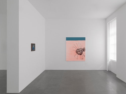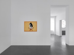 Often lacking perspective, depth, shading or shadows, the simplicity of Swennen’s work belies its conceptual significance. Interested in deconstructing the nature of painting, the artist builds his pictures up in layers. Often working on supports made from found objects, such as sheets of old plastic, scrap metal or salvaged wood, Swennen allows his chosen imagery to float loosely atop a background made up of more allusive elements, such as blocks of colour, dripped paint or unusual textures. The images he deploys are often derived from popular culture, such as Mickey Mouse, advertising and magazines, or comprise recognisable forms, such as wine bottles and bicycles or, as here, spiders and a cigarette. Sometimes the subjects are boldly and exuberantly rendered and, at other times, they almost disappear into the background. The way that Swennen handles his motifs – he takes them as he finds them, high or low, and manipulates them at will – is akin to a kind of visual poetry that harks back to his early career as a writer. Freely associative, and above all humorous, Swennen’s paintings explore the relationship between symbols, legibility, meaning and pictorial treatment.