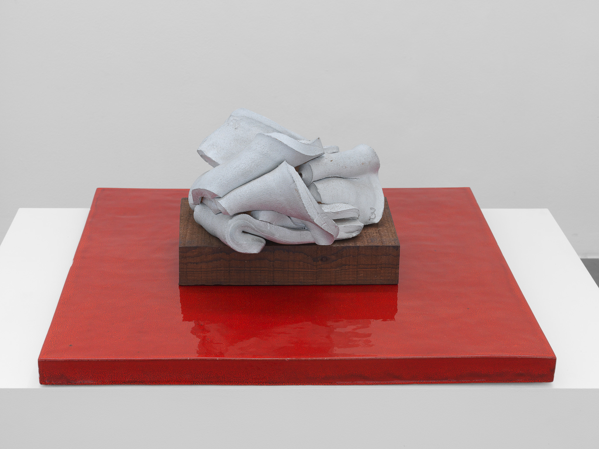 Solide plastique #4 is part of a series of works that was created in the late 1990s and which marked an important shift in Vermeiren’s oeuvre. In these works, Vermeiren explored ‘anti-form’: slabs of clay thrown on a plinth, with only gravity exerting some kind of impact on the material before firing. Highly sensual, these works have been described as ‘sculptural flesh’. The title, Solide plastique, refers to the transformation of clay – from soft and pliable during handling to hard and solid after firing. Clay, an essential yet ultimately invisible element of the classical sculptural production process, now becomes sculpture in its own right. In the Solide plastique series, Vermeiren illuminates the various relationships between body and mass, sculpture and plinth, form and mould, immobility and movement, as well as the position of the sculpture in space and its relationship with the spectator. Vermeiren: ‘But my subject is really about presence. The presence of what? The presence of my work, of my sculpture. Nature? It does not feature in my work. What could be there, what is actually present in my work, and what becomes visible in it, is the human body. Consequently, the sculpture has the measure of the body that has worked on it and made it. The body, yes, the human body.’