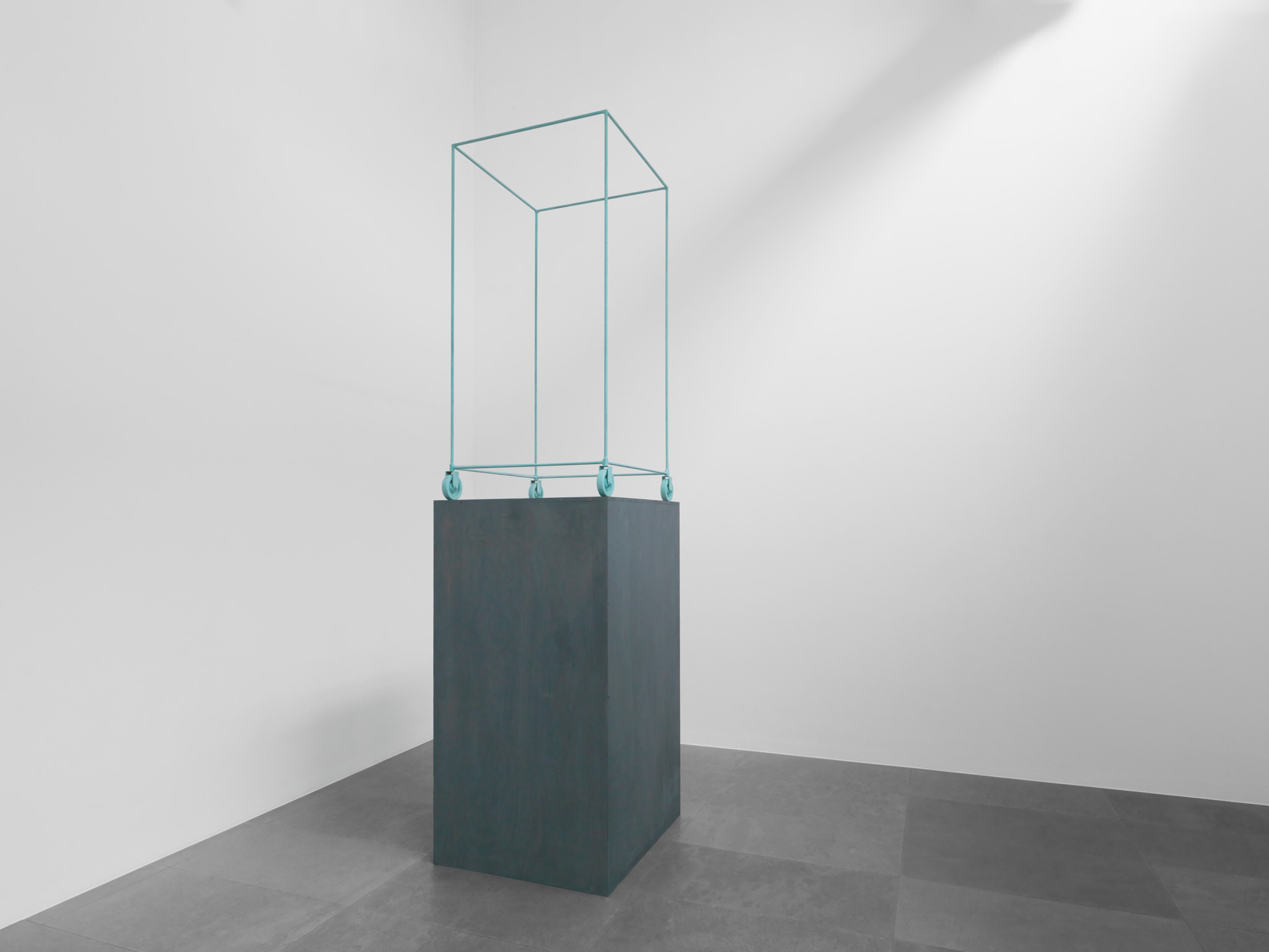Didier Vermeiren belongs to a generation of artists who, since the 1970s, has been drawing on the legacy of conceptual art and minimalism. While Roni Horn’s Two Pink Tons rests directly upon the gallery floor, Place is both plinth and sculpture. Vermeiren has been occupied with the history and specific nature of sculpture since the 1970s, more specifically the plinth. The fraught relationship between sculpture and pedestal is often viewed as a metaphor for the correlation of sculpture and reality – with Vermeiren subscribing to Brancusi’s belief that the plinth is integral to the work. Placeis from a series of sculptures by Vermeiren that feature metal ‘cages’ on wheels. In this case, although the sculpture has wheels it does not stand on them. Rather, it balances on a plinth of equal proportions. Vermeiren: ‘If you stand in front of these works you can see that they do not completely conceal the floor underneath them. For me, it was always clear that a sculpture has a front, a back and various sides. The wheels give the work a forward and backward orientation and in this way they at once define and limit its sideways extension. The wheels are there and they indicate a movement, but the movement does not actually have to occur.’ While Vermeiren has often cited Rodin as a key modernist sculptor, his ‘wagon’ or ‘cage’ works refer explicitly to Giacometti’s idea that a sculpture is defined not just by the object, but also by the surrounding space.