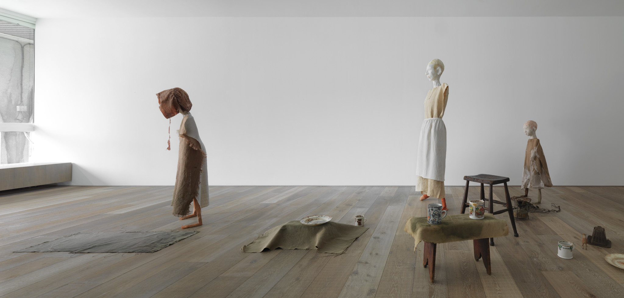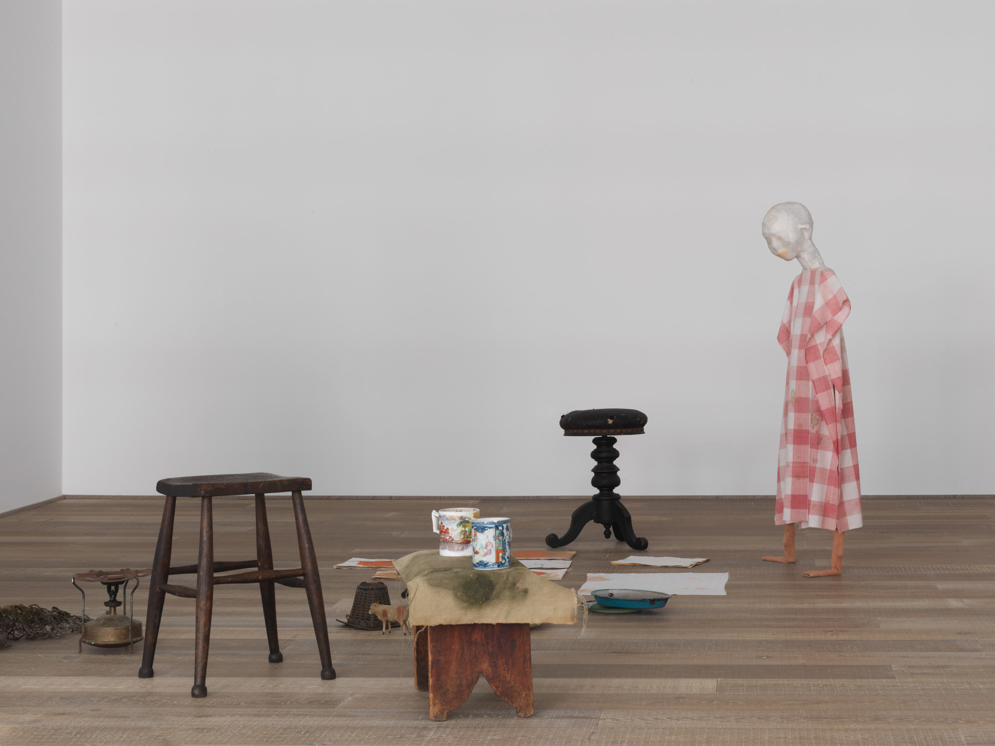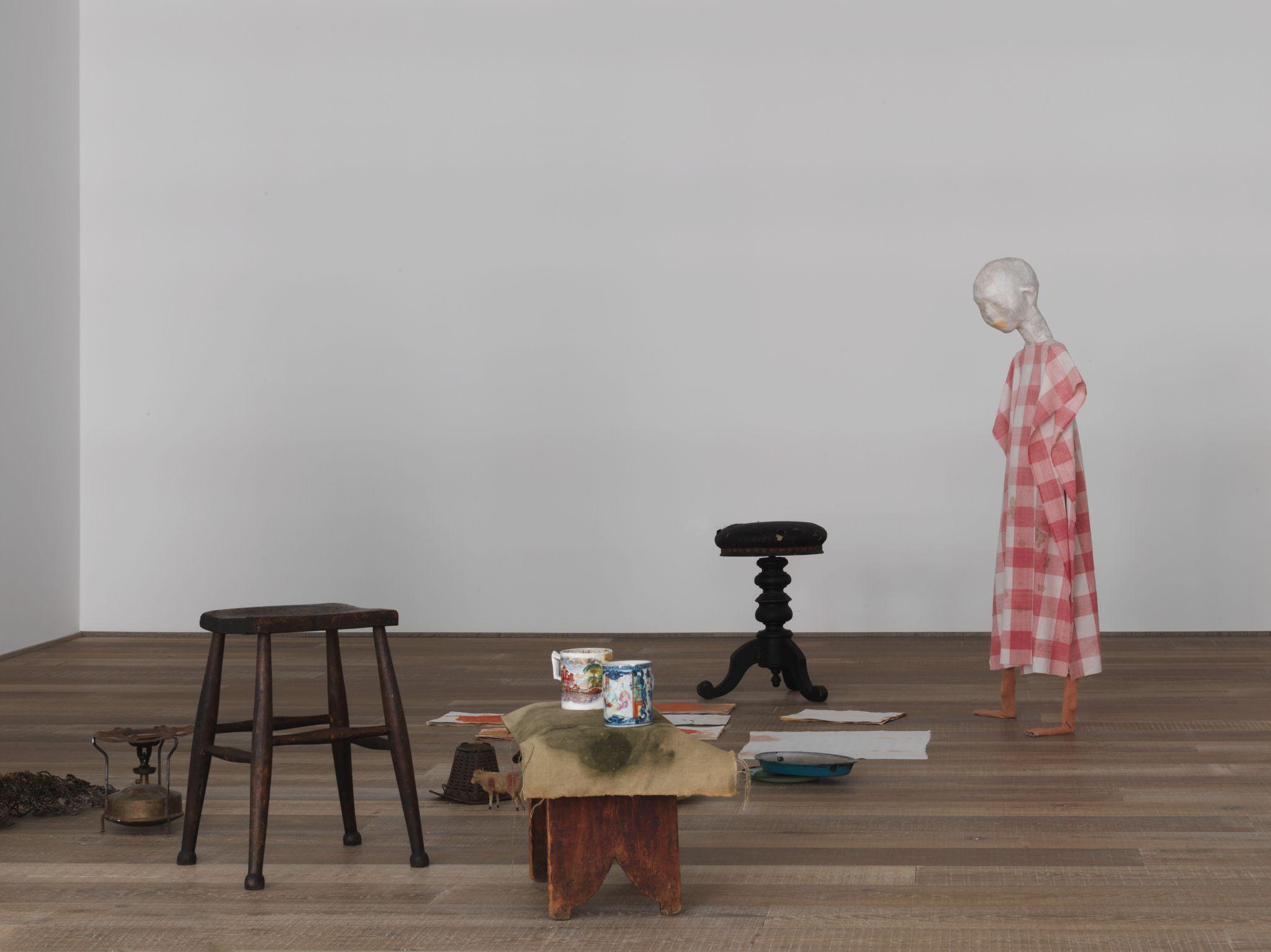 Born and raised in Belfast, Northern Ireland, Cathy Wilkes trained at Glasgow School of Art and is part of the generation of artists who emerged in the mid-1990s. Wilkes is primarily known for her large-scale, expressive installations of seemingly disparate objects, many of which are distressed, damaged, altered or adapted. Her ensembles slowly evolve out of a working method that begins with the meticulous collection and selection of materials and ends with the measured task of arrangement, re-arrangement, making and re-making. The refined, physical manifestations of a continual process of intellectual introspection and existential questioning, Wilkes’s installations explore the multiplicity of meanings, both personal and universal, that objects are capable of evoking, or representing. Each object or grouping in an installation references a small, inexpressible fragment of the artist’s inner world; but when transferred to the artwork, and separated from her private experience, they gain a new range of individual and associative meanings. That elusive tipping point – the critical moment at which the meaning of an object changes, the ‘how’ and the ‘why’ – fascinates Wilkes. Her installations also draw heavily on the materialisation of absence: the lost associations between objects, for example, or feelings of self-alienation.