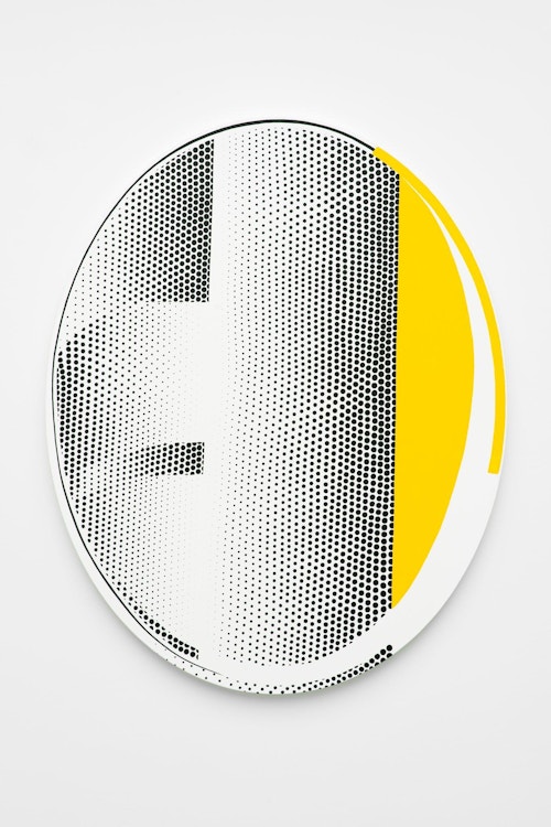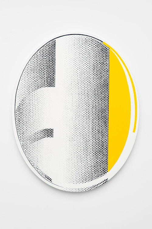 Horowitz uses as a vehicle Pop Art aesthetics – and the related production techniques that triggered far-reaching debates on what it means to be an artist – in a series of works based on Roy Lichtenstein’s painting Mirror #2 (once owned by Andy Warhol). A different artist-assistant painted each ‘self-portrait’ in the series, using an A3-sized printout of the original painting as a guide. Whereas Lichtenstein’s paintings are complex constructions that combine drawing, tracing, painting, brushstrokes, lines and stencils, the works produced in Horowitz’s studio are painted by eye using nothing other than paint and brushes. Instructed to simply reproduce the printed image as accurately as possible without imparting any personal style, each artist’s hand is, nevertheless, strongly evinced. Every mark is, in effect, a ‘mistake’ and unique in its ‘wrongness’: despite their visual conformity, each canvas resembles a self-portrait reflecting the individuality of the painter.