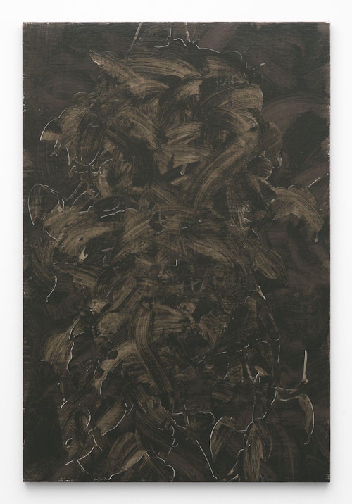 In comparison to the crisp, clear imagery of the above works, Horowitz’s ‘plant’ paintings are both exuberant and abstract: identical in subject (a Philodendron houseplant) and composition, each painting is rendered in different colours and paint application techniques. The gestural brush stokes are, however, contained by the hard edge of a stencil. These works can be interpreted as meditations on the illustrious legacy of American painting in the 20th century (the plant is like a found, Abstract Expressionist composition) and domesticity (the image of an extremely common houseplant), but also as an exploration of the concepts of freedom vs. confinement, nature vs. culture. Tennyson, Jasper and Bob(2014), on the other hand, is a more formal and regimented work that takes Jasper Johns’ 1958 painting Tennyson as its starting point. The Johns painting suggests an image of a bed that, in turn, references Rauschenberg’s seminal painting Bedfrom 1955. In Horowitz’s version, which is related to his celebrated installation Pillow Talk Bed (2002), the Johns painting is reproduced actual size and printed onto canvas. The composition is, however, altered by the embroidered addition of the names ‘Jasper’ and ‘Bob’ over the area of the painting that suggests two pillows.