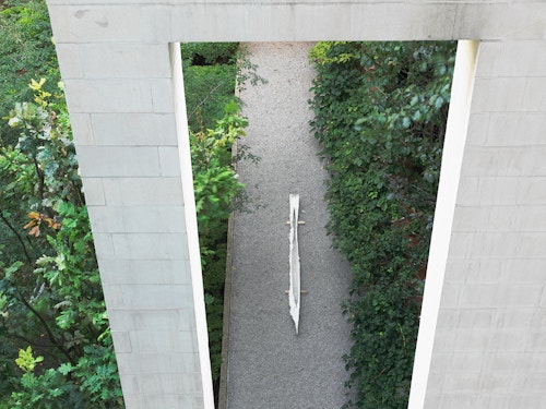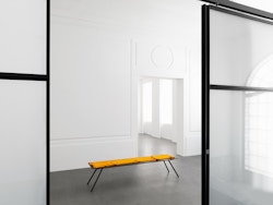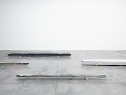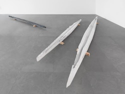 The enigmatic titles of these sculptures, Black Caviar, Secretariat, Grand Flaneur, in reality make reference to famous race horses. The idea of movement, and beyond this of pursuit and flight, thus informs these objects which, set on the ground, seem to have been stopped in their tracks. As at a race course, benches, also designed by the artist, invite us to take a seat to look at the now motionless works. On these benches are laid blankets of the type handed out by various airlines to their passengers on long-haul flights. The promise of a distant journey thus seems to be being made to spectators. Comfortably wrapped in the warmth of the piece of fabric, we are invited to journey towards imaginary horizons, where suns are red and water phosphorescent.