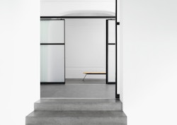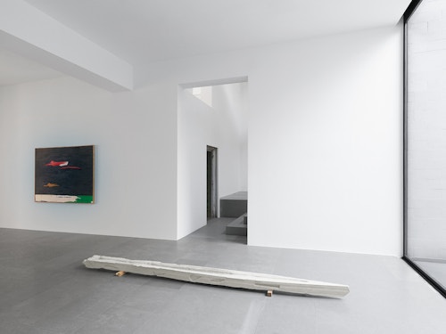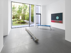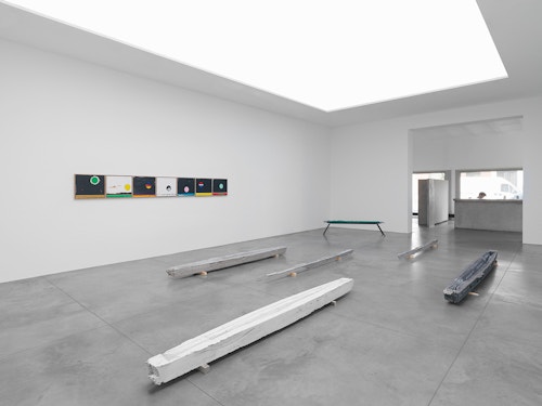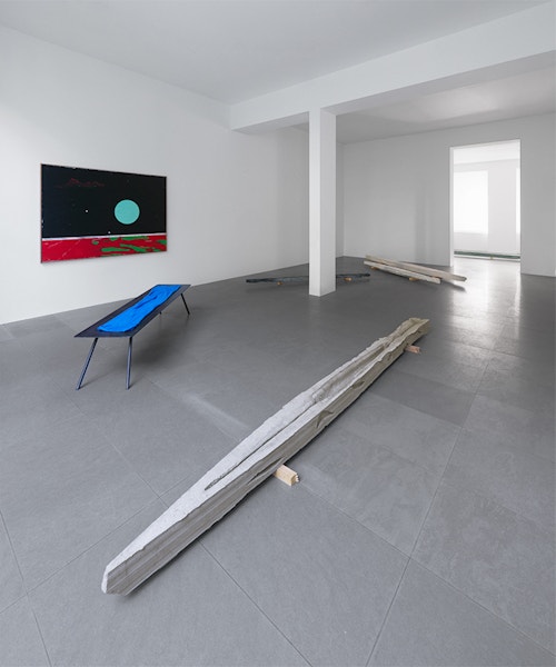 The sculptures on the floor seem to have been swept along in one and the same chromatic momentum. Previously, they kept the color of the material they were cast in, but today the concrete sculptures are pigmented. On the floor, their stretched silhouettes thus draw lines of color, which echo those we find in the pictures.
