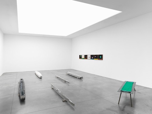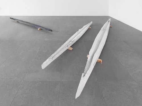 The freeing-up of the colors seems to go hand-in-hand with an emancipation of forms. In his earlier work, Ancart often scaled form down to a trace, an accident, a fleeting deposit of pigments, but he generally preferred geometric shapes. In his new sculptures, he extends his exploration of the fragile balance between shape and shapelessness, completeness and incompleteness, perfection and imperfection, through more organic silhouettes. Some of them conjure up the form of a fish or boat, while their hollow interior reminds us of the form of a canyon, or a drinking trough when filled with water.