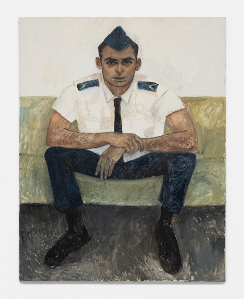 While Herbelin’s earlier works were characterised by vibrant colours and clearly defined settings, the paintings in this exhibition embrace ambiguity. Figures emerge from undefined or weighty backgrounds, emphasising presence over place, memory over setting. Arie, the artist’s late grandfather from Israel, is painted posthumously from photographs. His depiction resists traditional hierarchies of representation—someone who might not typically be immortalised on canvas is here granted a quiet yet steadfast visibility. Herbelin’s gaze is both tender and unflinchingly honest, stripping away embellishment to reveal the raw intimacy of her subjects.