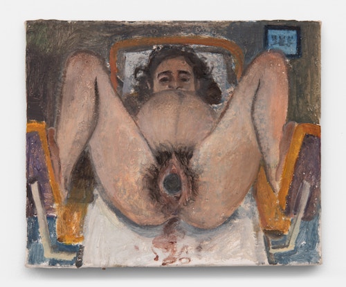 The absent presence of Herbelin’s late grandfather can also be felt in two of Herbelin’s works depicting Jewish mourning rituals. In Shiva, Herbelin reconstructs, from memory, a bird’s-eye view of her grandfather’s home during shiva, the seven-day mourning period following a funeral. The painting reflects the charged atmosphere of this ritual, in which the bereaved remain at home, marking their loss through time-honoured rituals: sitting on low chairs, covering mirrors, and lighting a candle in remembrance. The second, larger work on this theme, Dîner aux œufs durs [Dinner with Hard-Boiled Eggs], interprets the Se’udat Havra’ah, the meal of condolence that follows a burial. Hard-boiled eggs―along with bagels, lentils and other round foods―are central to this meal, symbolising the cycle of life and renewal. The composition of the painting takes inspiration from Egon Schiele’s Die Freunde (Tafelrunde), groß [The Friends (Round Table), Large], 1918. Just as Schiele painted his own circle of friends gathered around the table, Herbelin populates Dîner aux œufs durs with her own acquaintances as well as imagined figures.