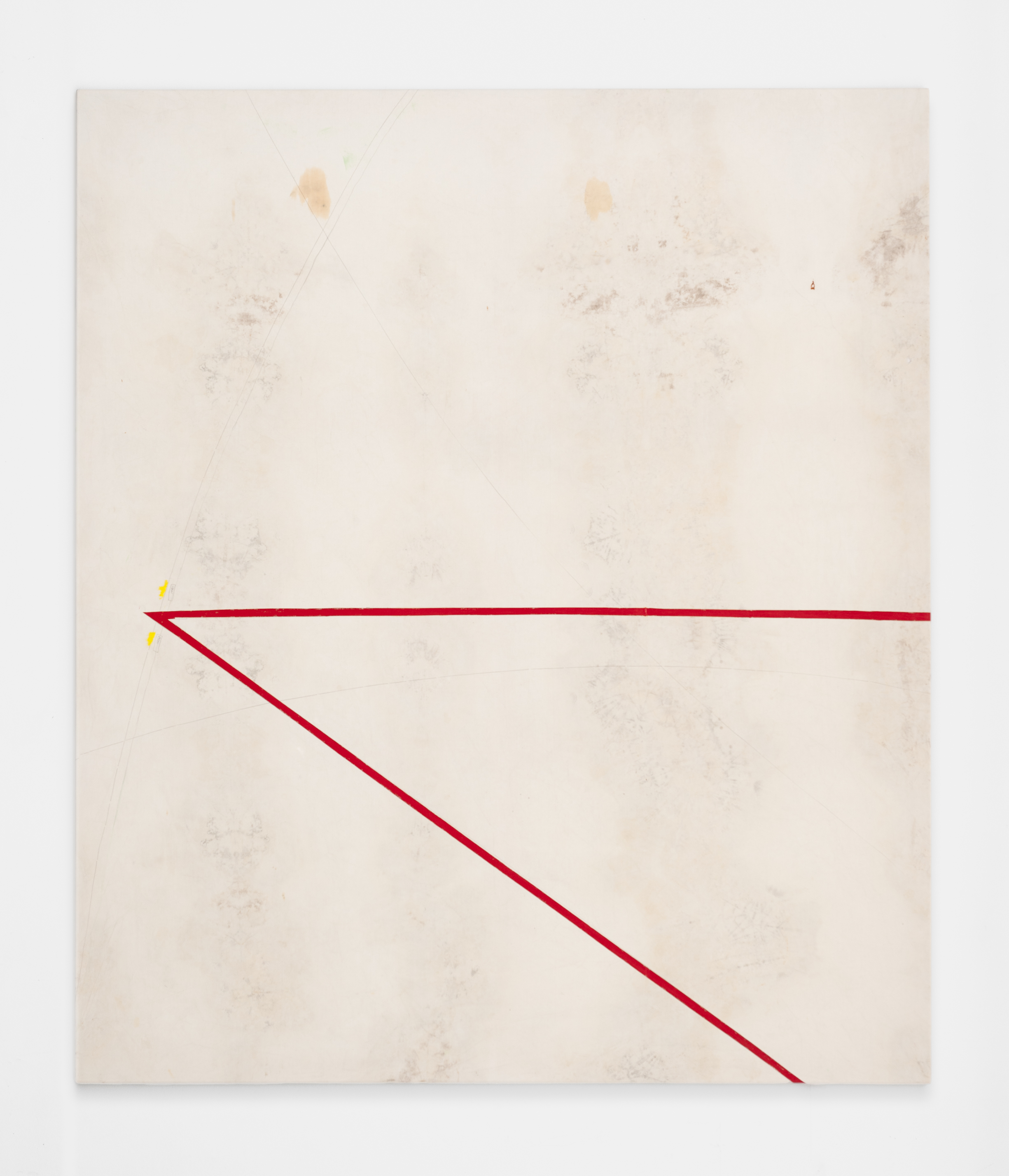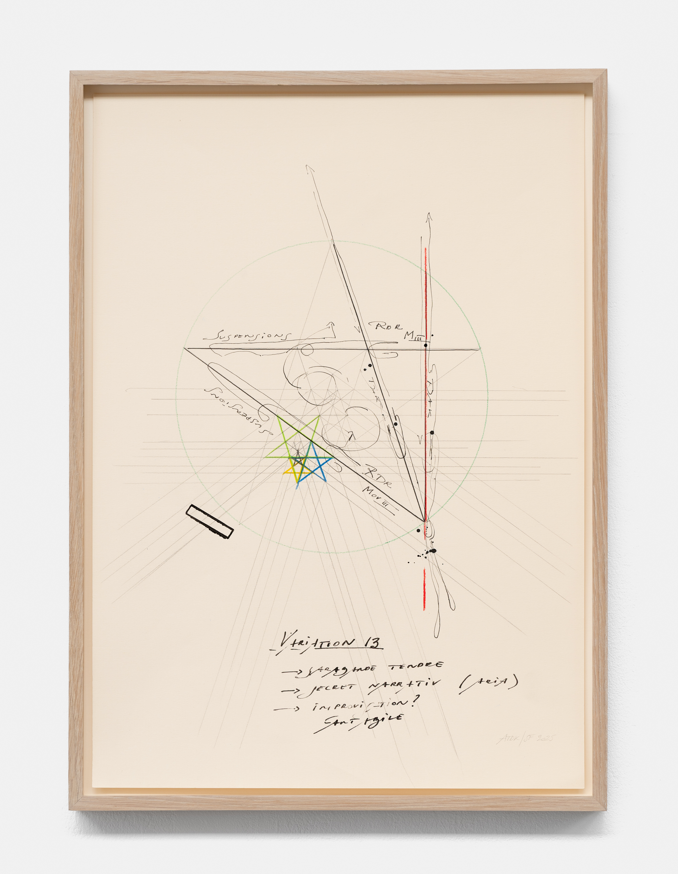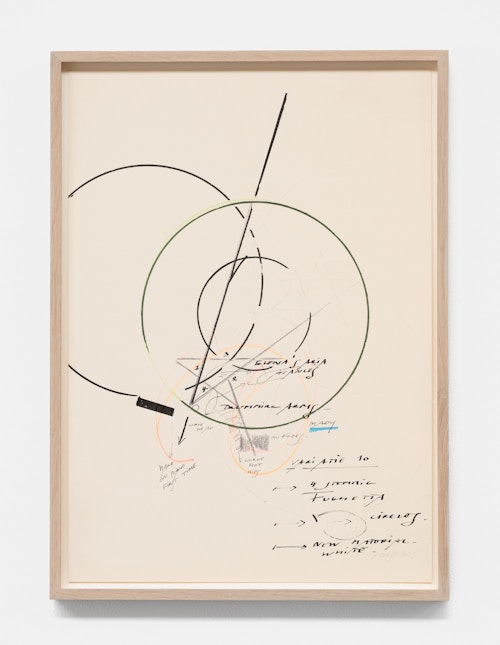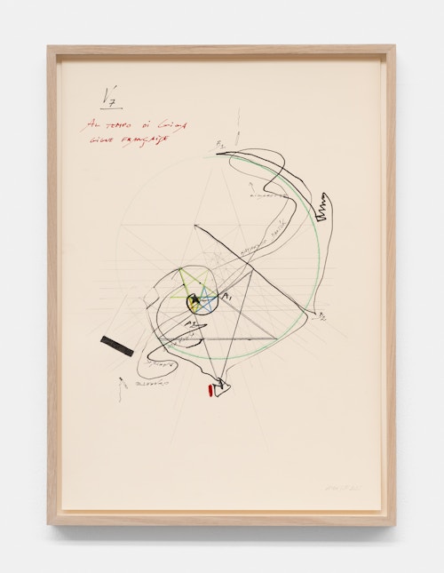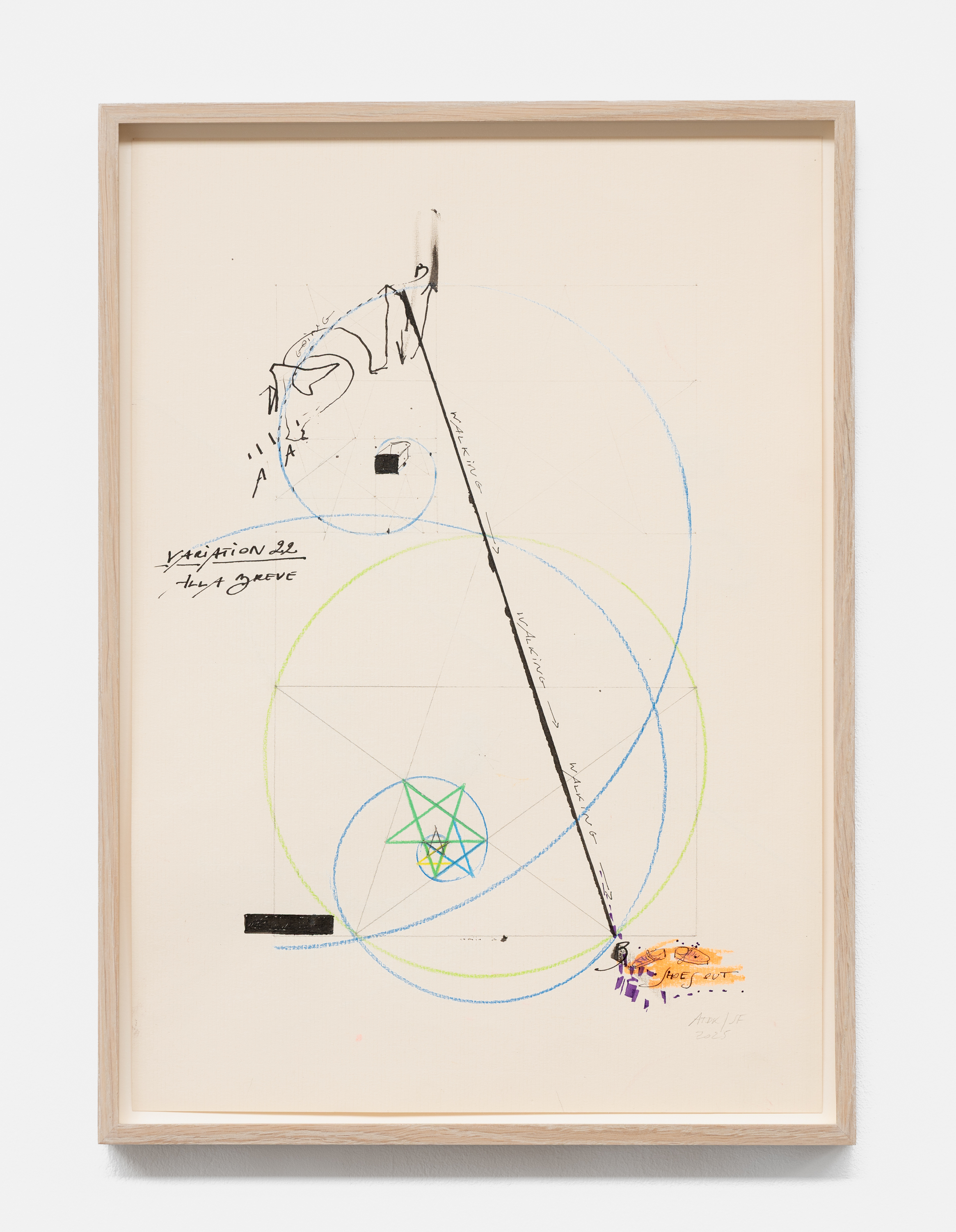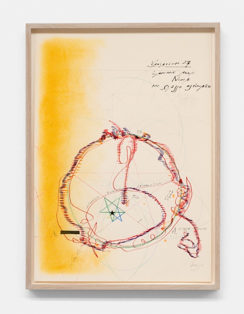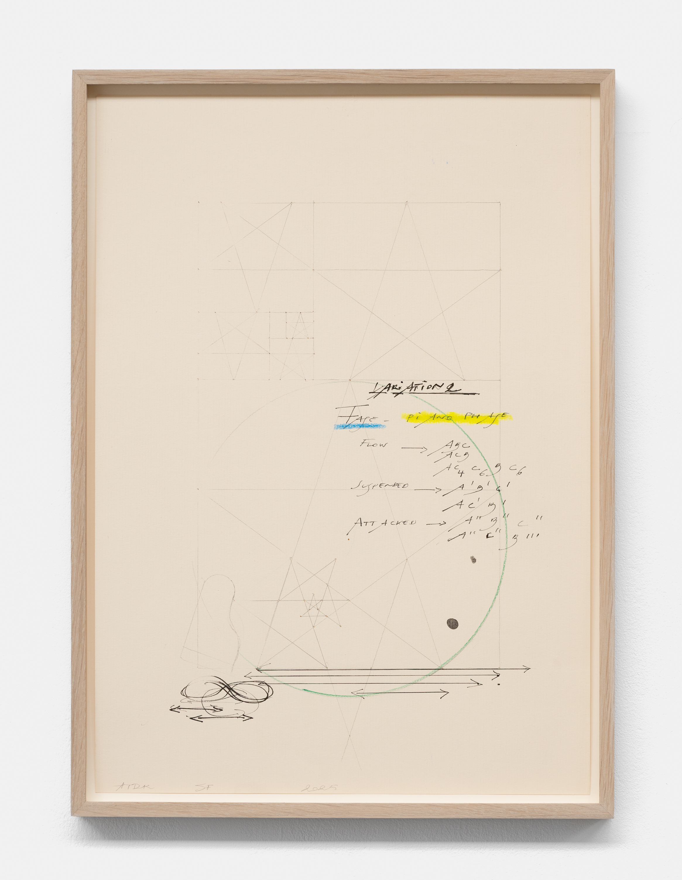 On canvas and on paper, echoes can be heard of the Goldberg Variations. More than a musical score, Bach’s work is a blueprint for De Keersmaeker’s entire oeuvre: a system of repetition and differentiation, in which choreographic labour unfolds as a continuous circling around the same (meta)physical questions and (ma)thematical figures. Geometry, long central to De Keersmaeker’s research, is more than a visual concern for her. The line appears in her work not as representation; it is choreography in its most concentrated form—the bearer of time and space. The twelve canvases that form the heart of the exhibition As you wish arise from the geometries of the dance floor. Here, lines unfold—precise and affirmative—as chromatic trajectories through space. The result is an abstract geometry that is at once functional, referential, and poetic.