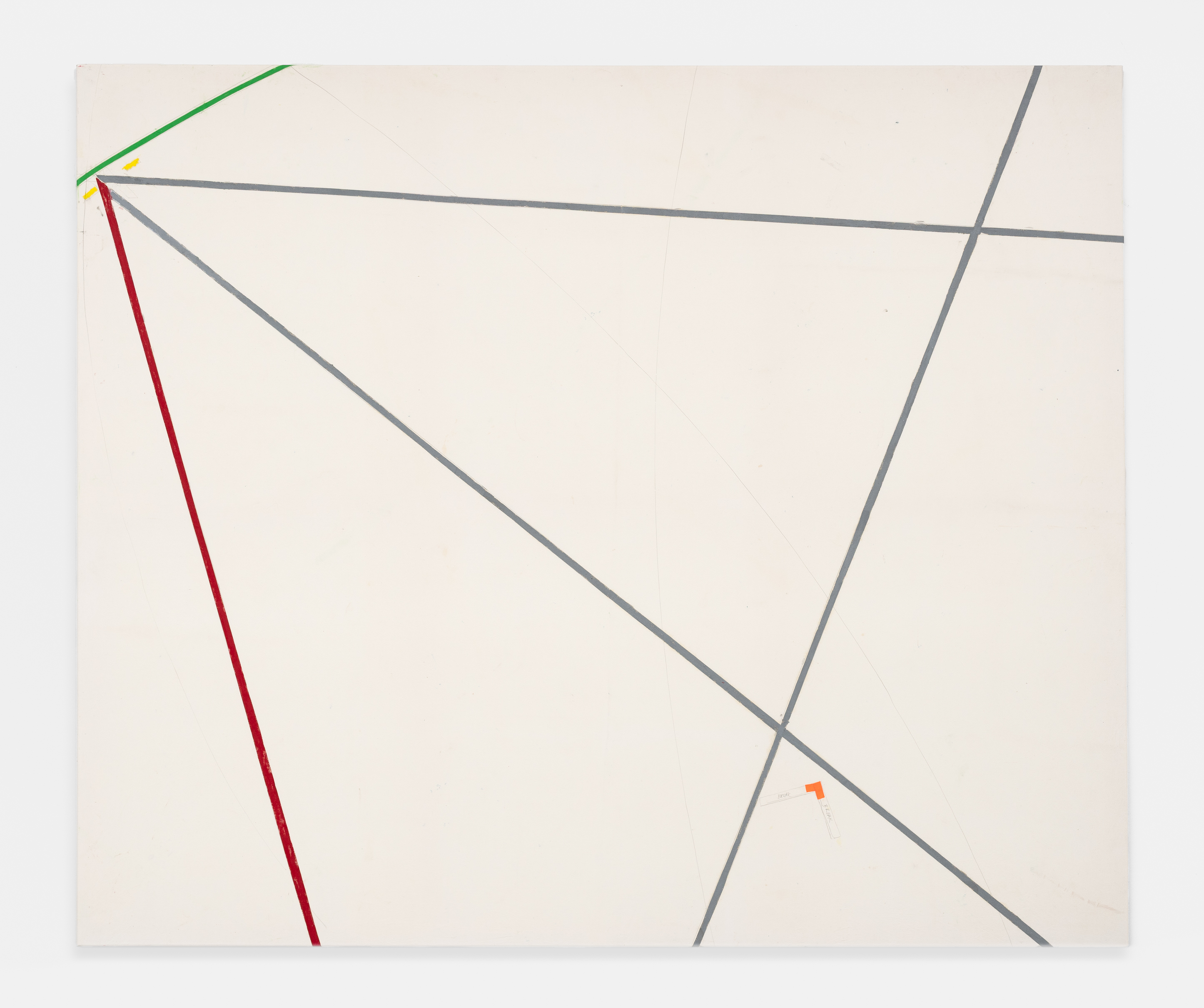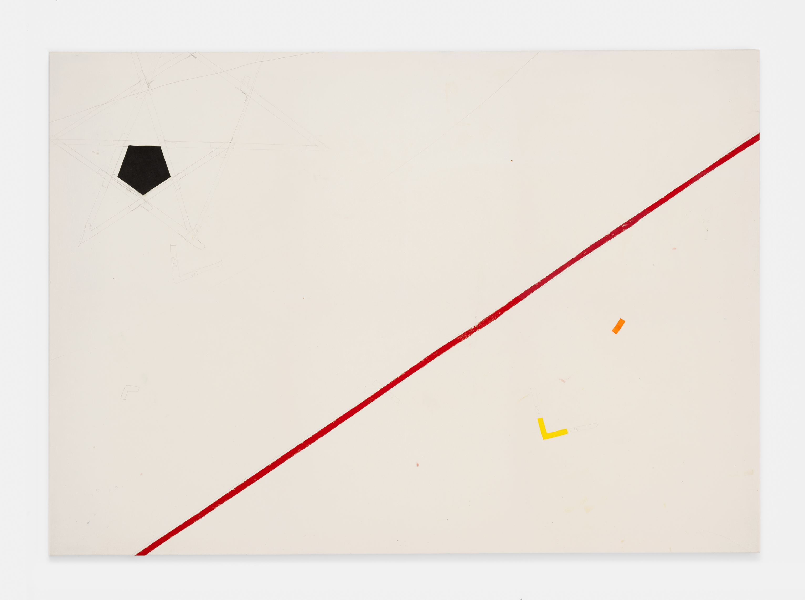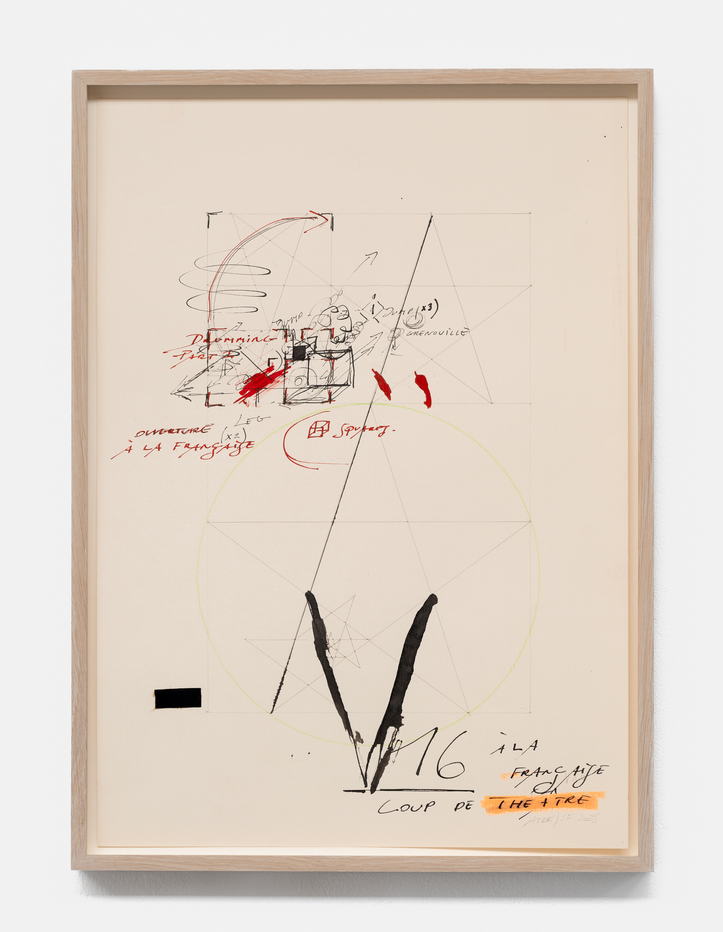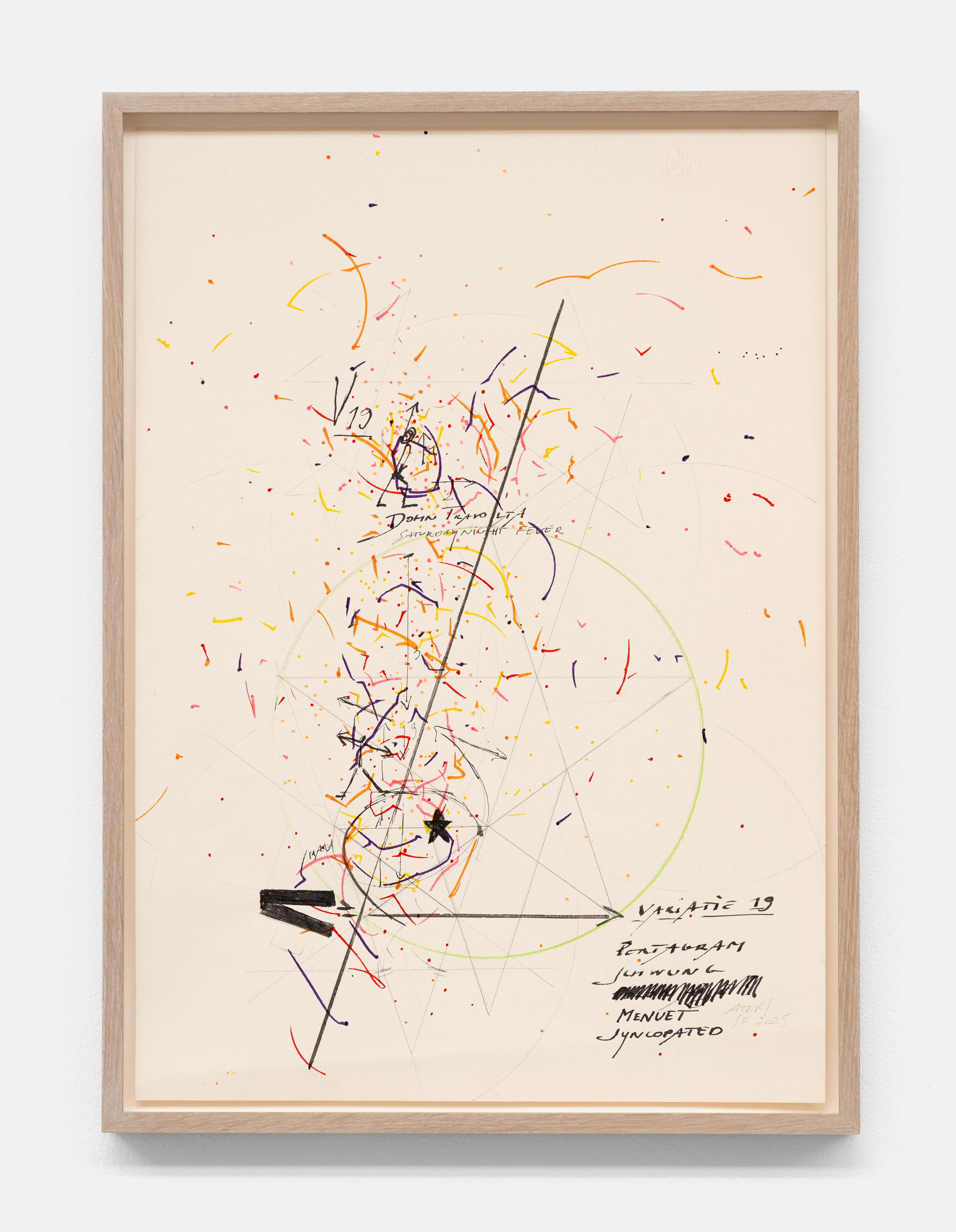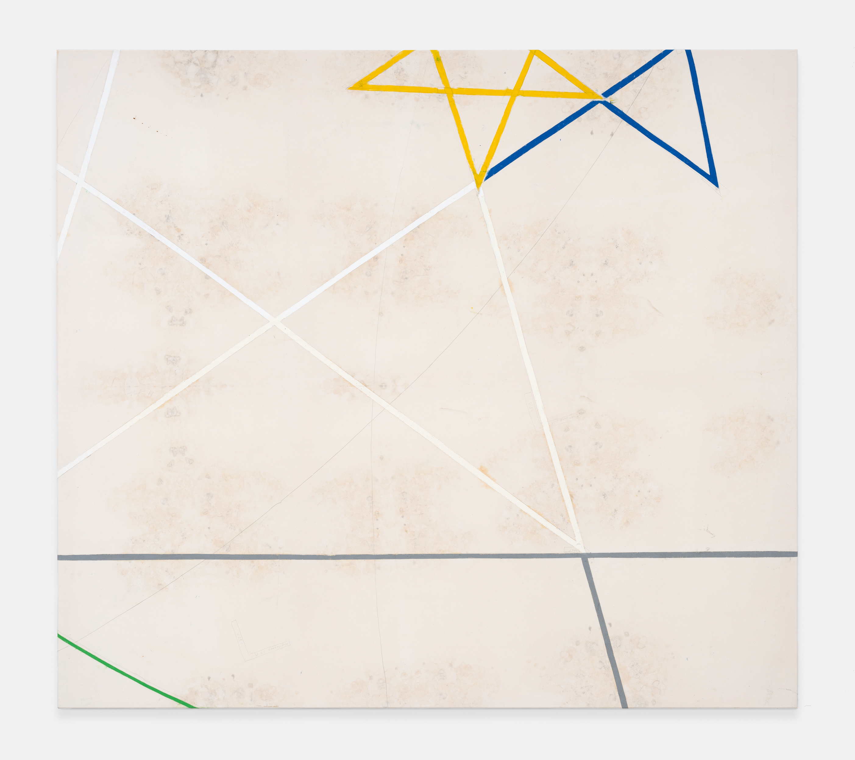 On canvas and on paper, echoes can be heard of the Goldberg Variations. More than a musical score, Bach’s work is a blueprint for De Keersmaeker’s entire oeuvre: a system of repetition and differentiation, in which choreographic labour unfolds as a continuous circling around the same (meta)physical questions and (ma)thematical figures. Geometry, long central to De Keersmaeker’s research, is more than a visual concern for her. The line appears in her work not as representation; it is choreography in its most concentrated form—the bearer of time and space. The twelve canvases that form the heart of the exhibition As you wish arise from the geometries of the dance floor. Here, lines unfold—precise and affirmative—as chromatic trajectories through space. The result is an abstract geometry that is at once functional, referential, and poetic.