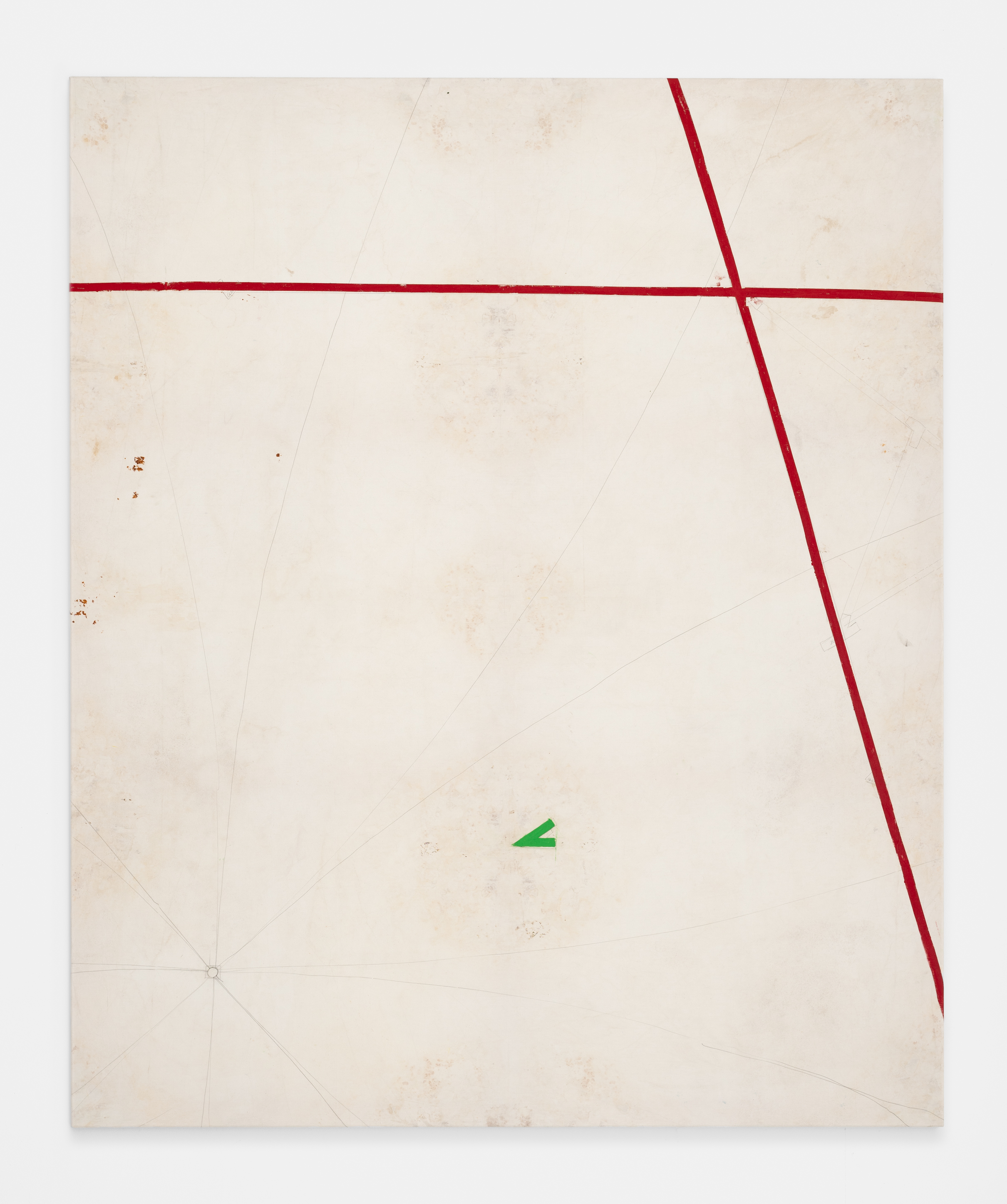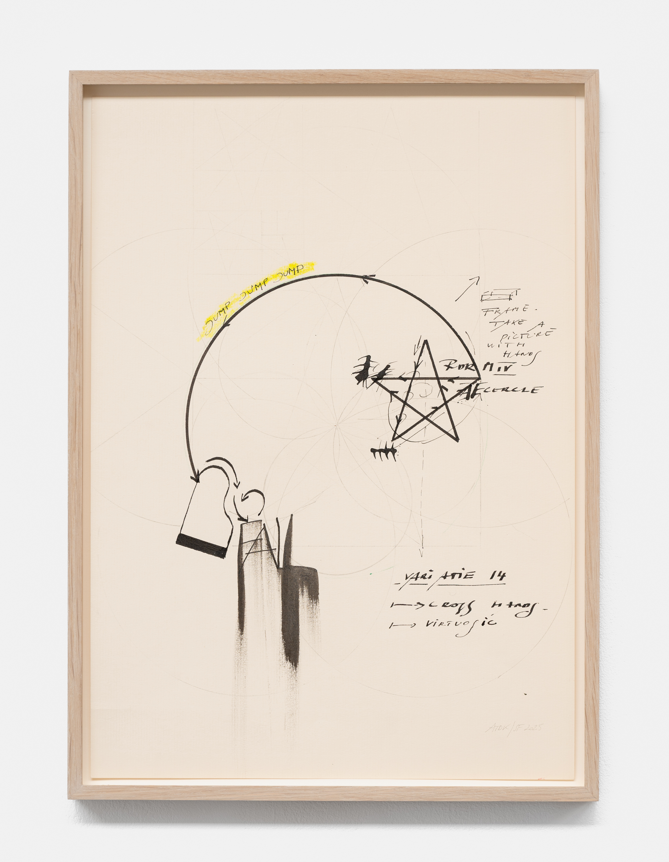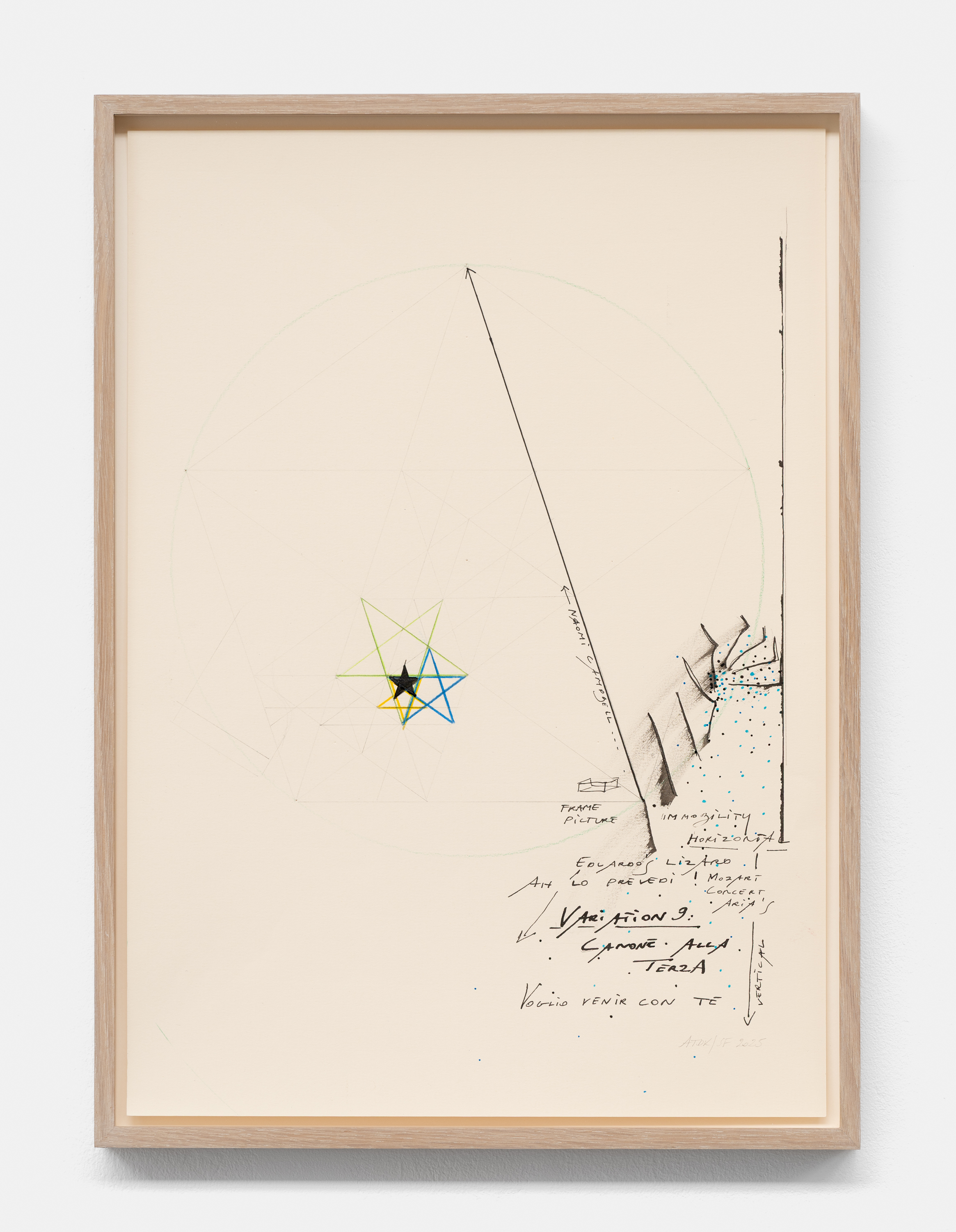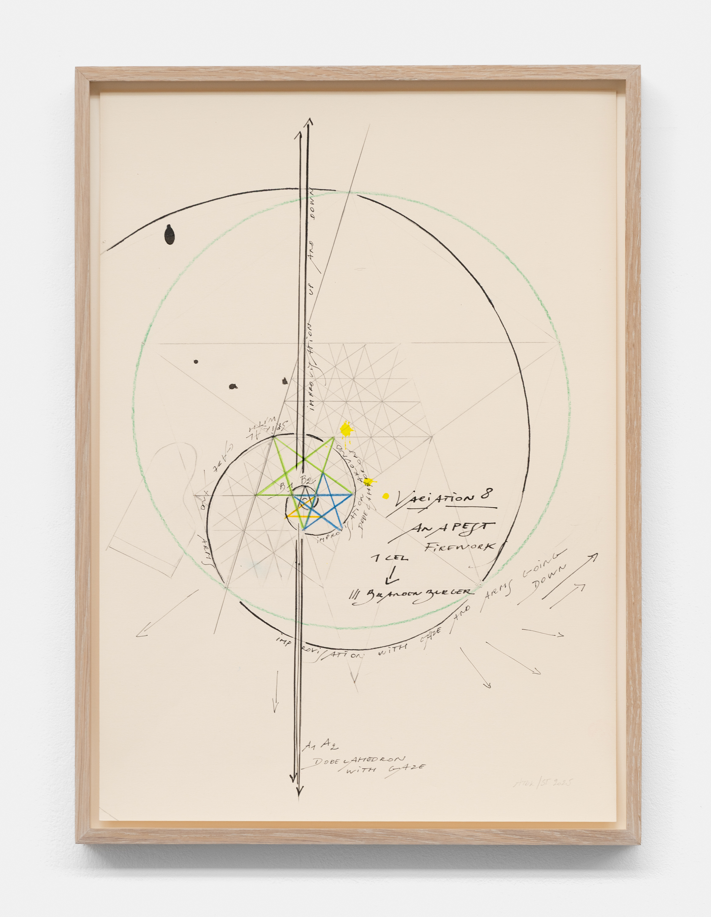 On canvas and on paper, echoes can be heard of the Goldberg Variations. More than a musical score, Bach’s work is a blueprint for De Keersmaeker’s entire oeuvre: a system of repetition and differentiation, in which choreographic labour unfolds as a continuous circling around the same (meta)physical questions and (ma)thematical figures. Geometry, long central to De Keersmaeker’s research, is more than a visual concern for her. The line appears in her work not as representation; it is choreography in its most concentrated form—the bearer of time and space. The twelve canvases that form the heart of the exhibition As you wish arise from the geometries of the dance floor. Here, lines unfold—precise and affirmative—as chromatic trajectories through space. The result is an abstract geometry that is at once functional, referential, and poetic.