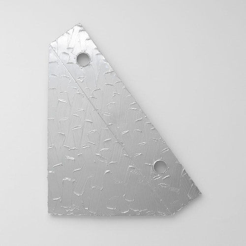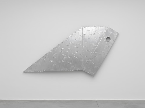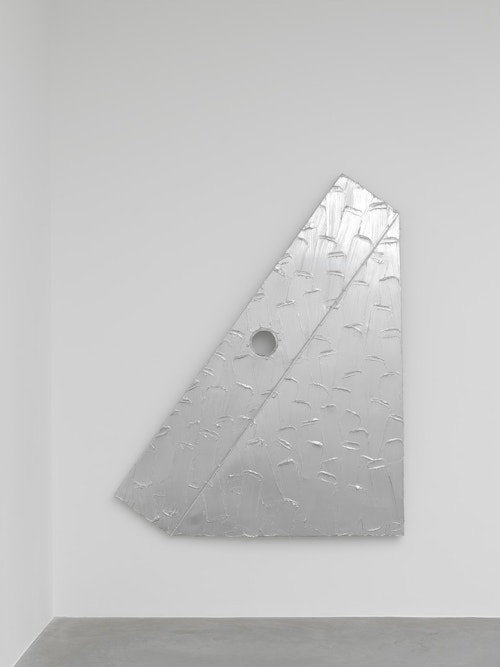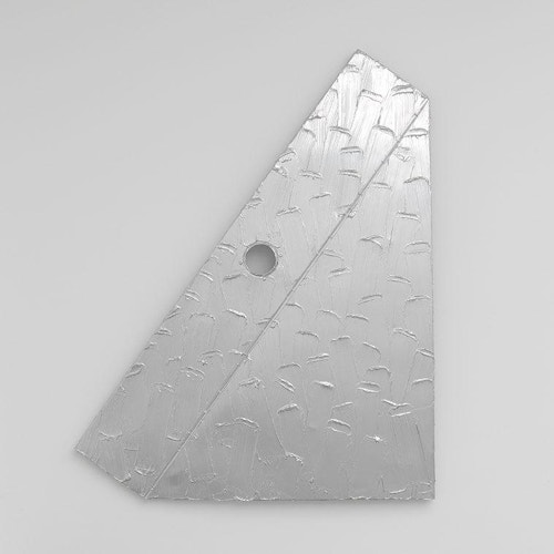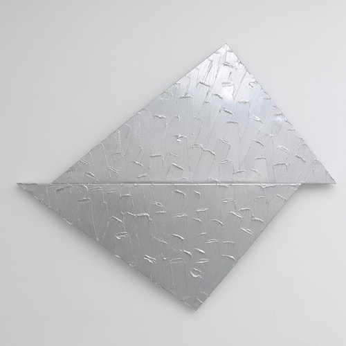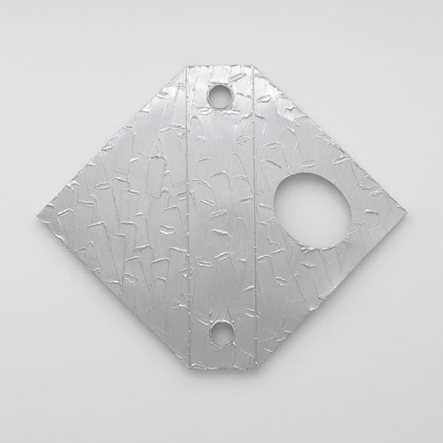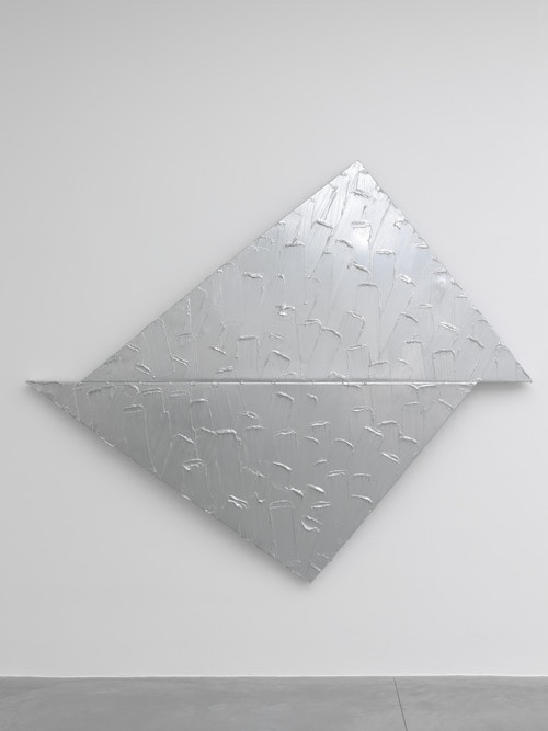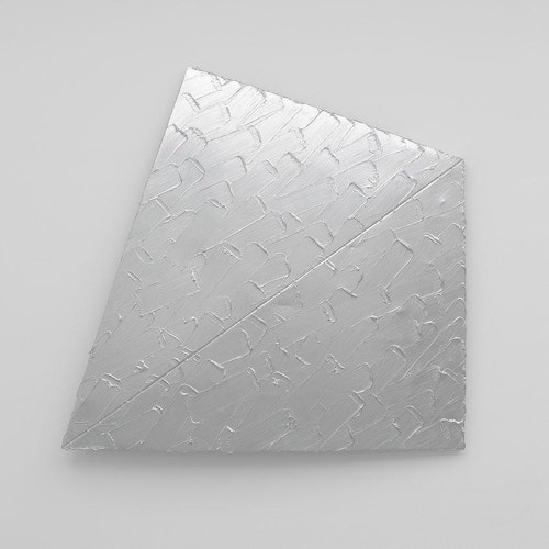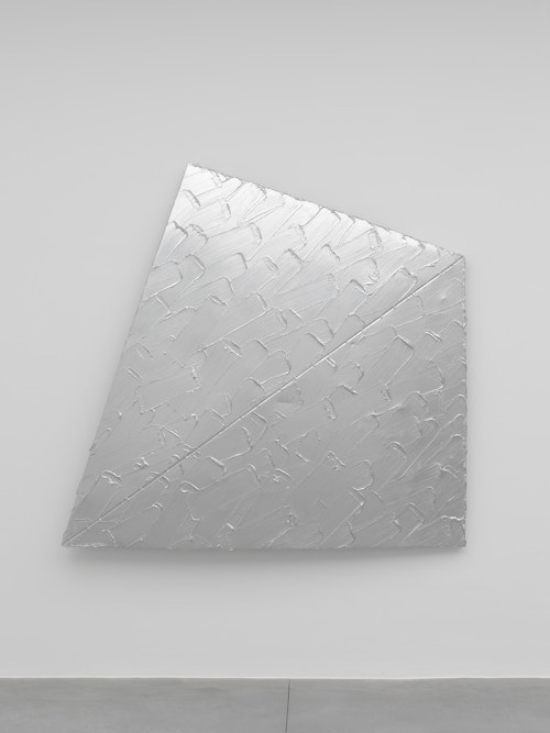 In “Atomiums”, the artist’s second exhibition at the gallery, Bertrand Lavier shows eleven new “objets peints”: eleven industrial plates originating from the Atomium in Brussels that he has painted with broad brush strokes of shiny silver acrylic paint, the original colour of the building’s construction. Lavier sees the Atomium as the “Eiffel Tower of Brussels”, a striking, architectural construction that was originally created for the opening of the World Exhibition, and which has become an icon for the city and still today, symbolises the lost utopian belief in technology and science, in other words, a sort of nostalgia for the future. Lavier uses the industrial Atomium plates, with their different shapes and sizes, as pre-formed canvases. Covered with thick strokes of silver paint, they become graceful, abstract object-paintings that bear a strong resemblance to the “panels” by the American modernist painter, Ellsworth Kelly. From the 1960s, in search of an anonymous and powerful object-orientated “présence” in his paintings, Kelly filled irregular shaped canvases with a monochrome field of colour and emphasised, via their hard edges, their relation to the wall against which they hung. Via an abstract language and works on a grand scale, the goal of Ellsworth Kelly was to achieve a transcendental and spiritual experience. This is not the case for Lavier. As their title suggests, the objects remain “Atomiums”: paintings yes, but also industrial plates and the remnants of a futuristic utopia. With “Atomiums”, like his other “objets peints”, Lavier questions the aura of an artwork from its modernist time perspective and projects it into a contemporary context where uncertainty dominates, where there is fluidity and ambiguity, but where the possibility also exists to combine different languages: the history of art with the language of contemporary consumer society, poetry with irony, experimentation with aesthetic suggestion.
