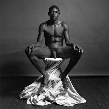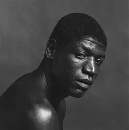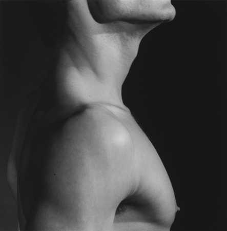 In 1975, Mapplethorpe began using a Hasselblad medium-format camera given to him by Sam Wagstaff, the visionary curator who became his benefactor and mentor. Mappelthorpe worked primarily in the studio and began producing large-scale still lifes of subjects such as lilies, gladioli, interiors, nudes, portraits and self-portraits. One of his earliest celebrity portraits, Patti Smith (1975), was carefully staged by Mapplethorpe and Smith, his lifelong friend. In this photograph, Smith broke radically from the image that women in rock were expected to assume, and embodies the androgyny often found in Mapplethorpe’s photographs. His portraits of Smith capture her loneliness and her independence, her sensitivity and her wildness. Around 1979 Mapplethorpe began to photograph black men. As Patricia Morrisroe wrote, he found that “he could extract a greater richness from the colour of their skin”, in particular the tonal range between the highlights and the shadows was more dramatic. In the close-up Bob Love, 1979 Mapplethorpe exploits the contrast between the highlights on his shoulder and face and the inky darkness of his neck and the back and top of his head.