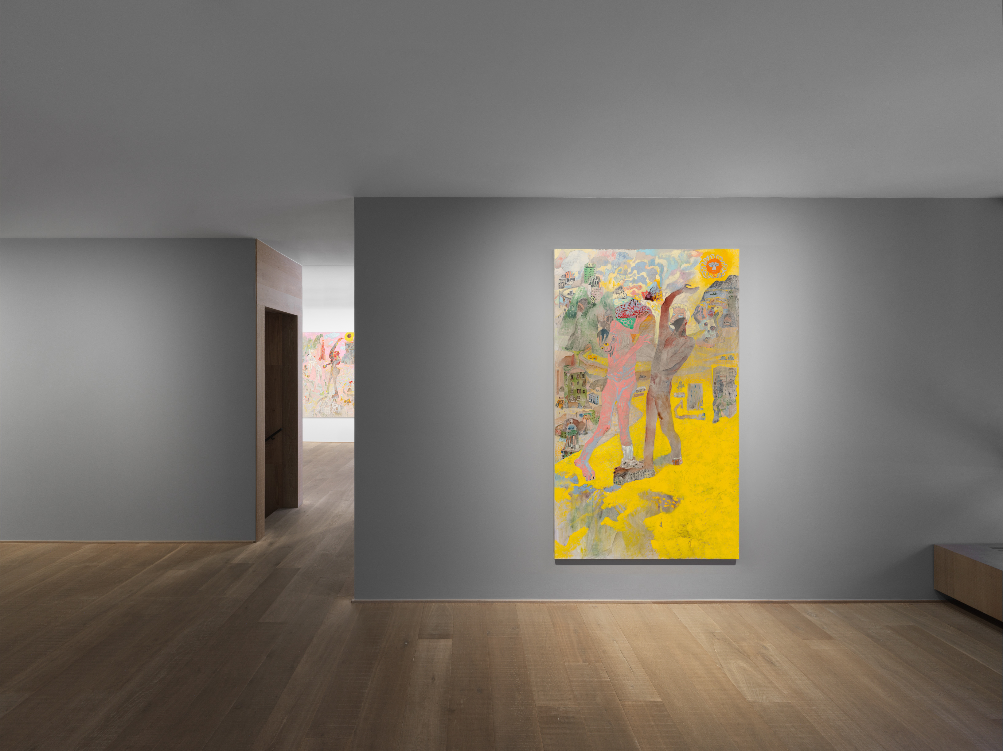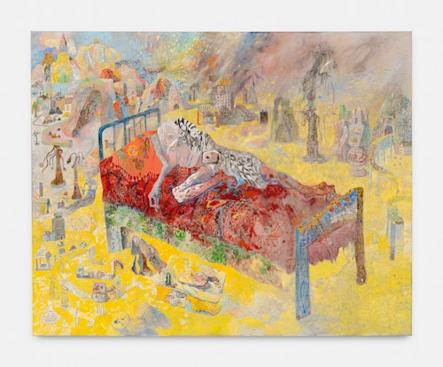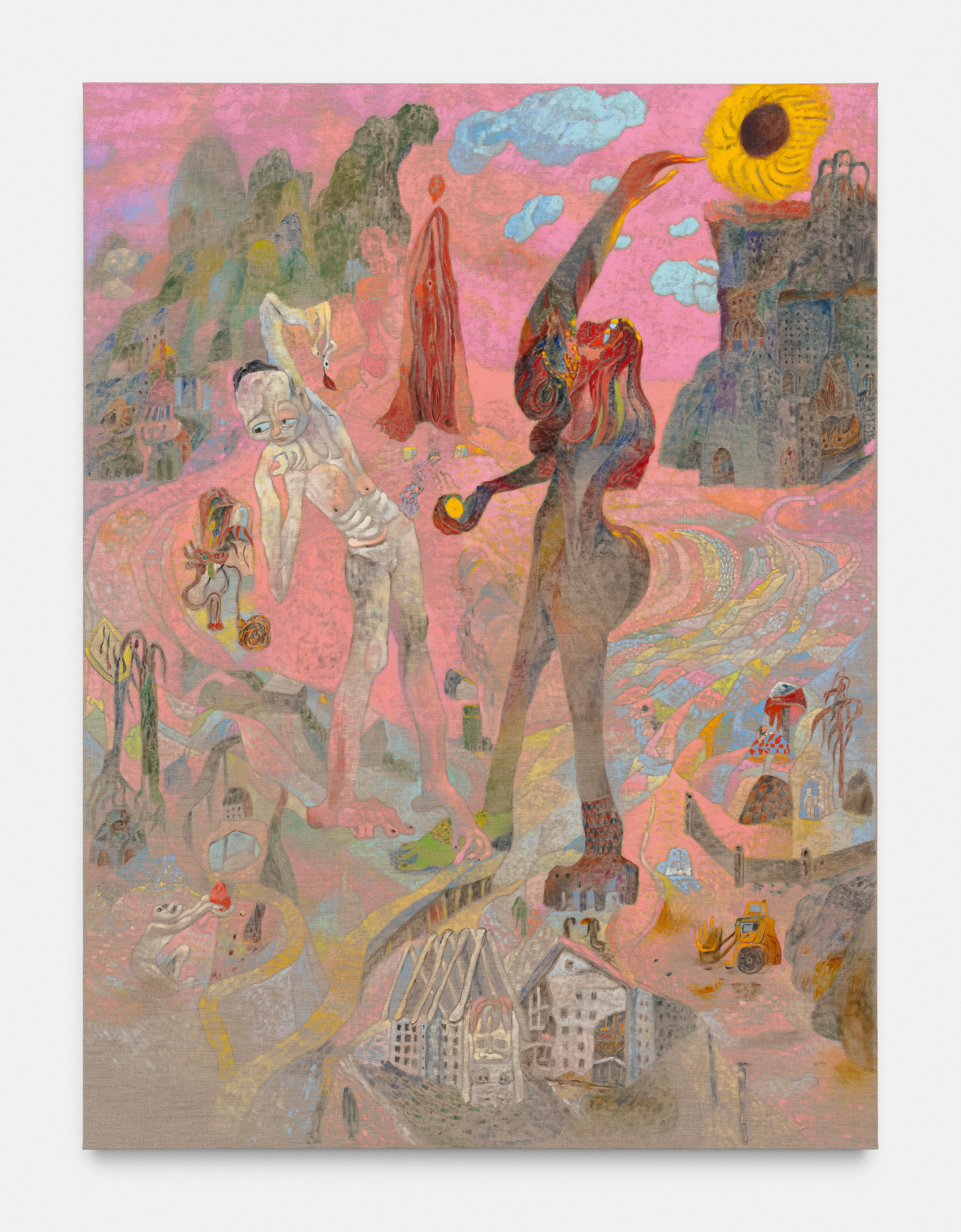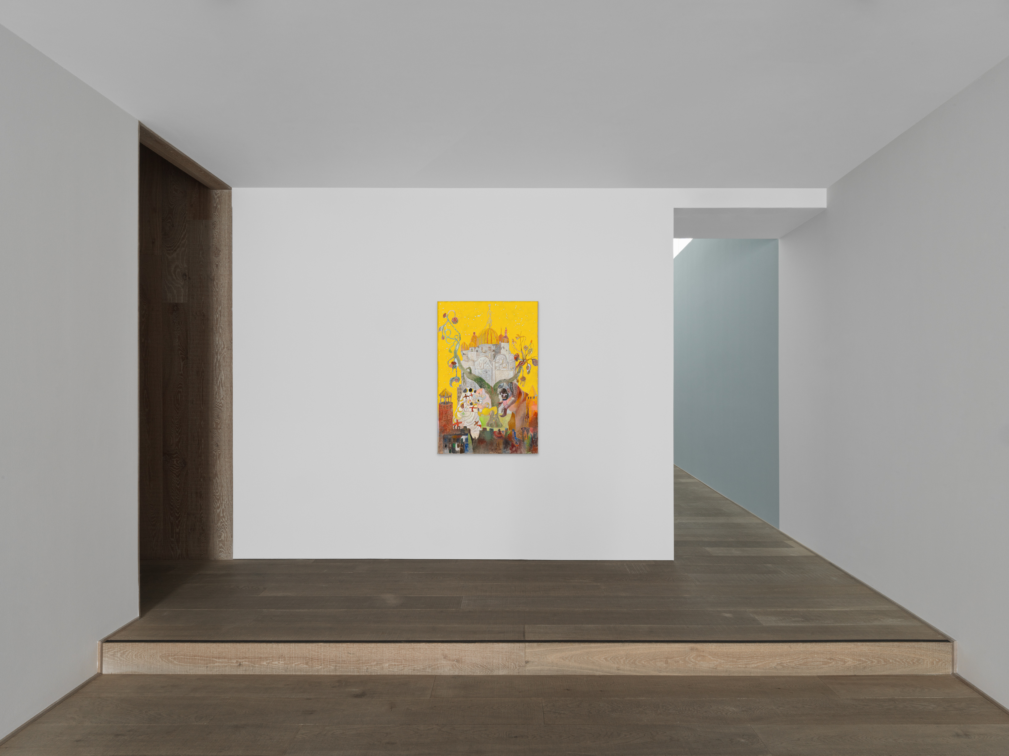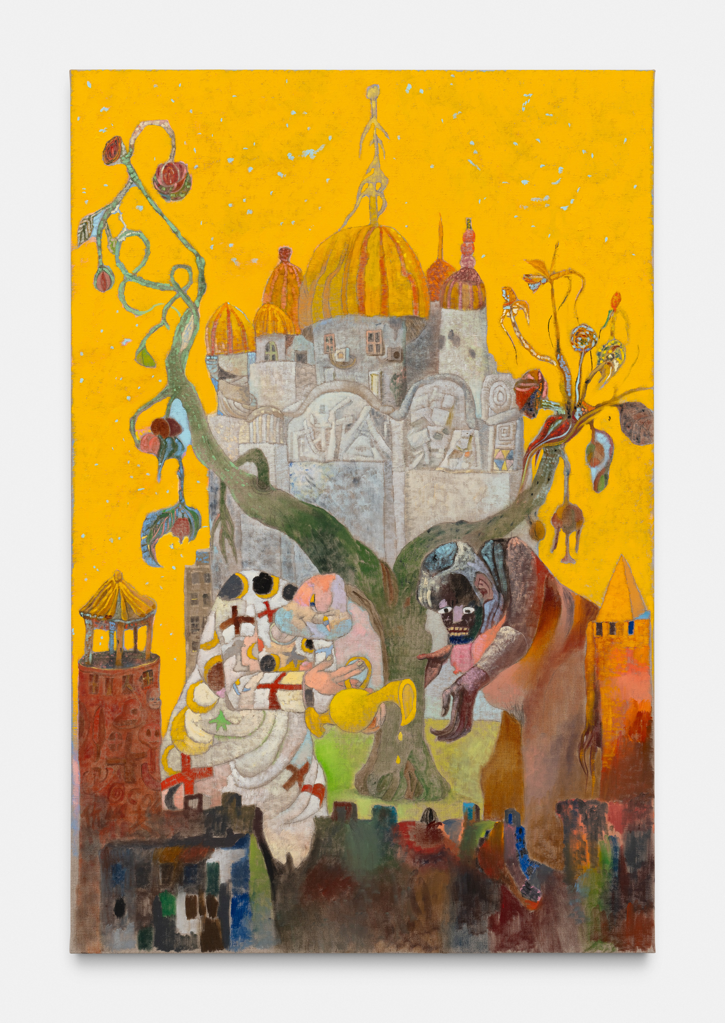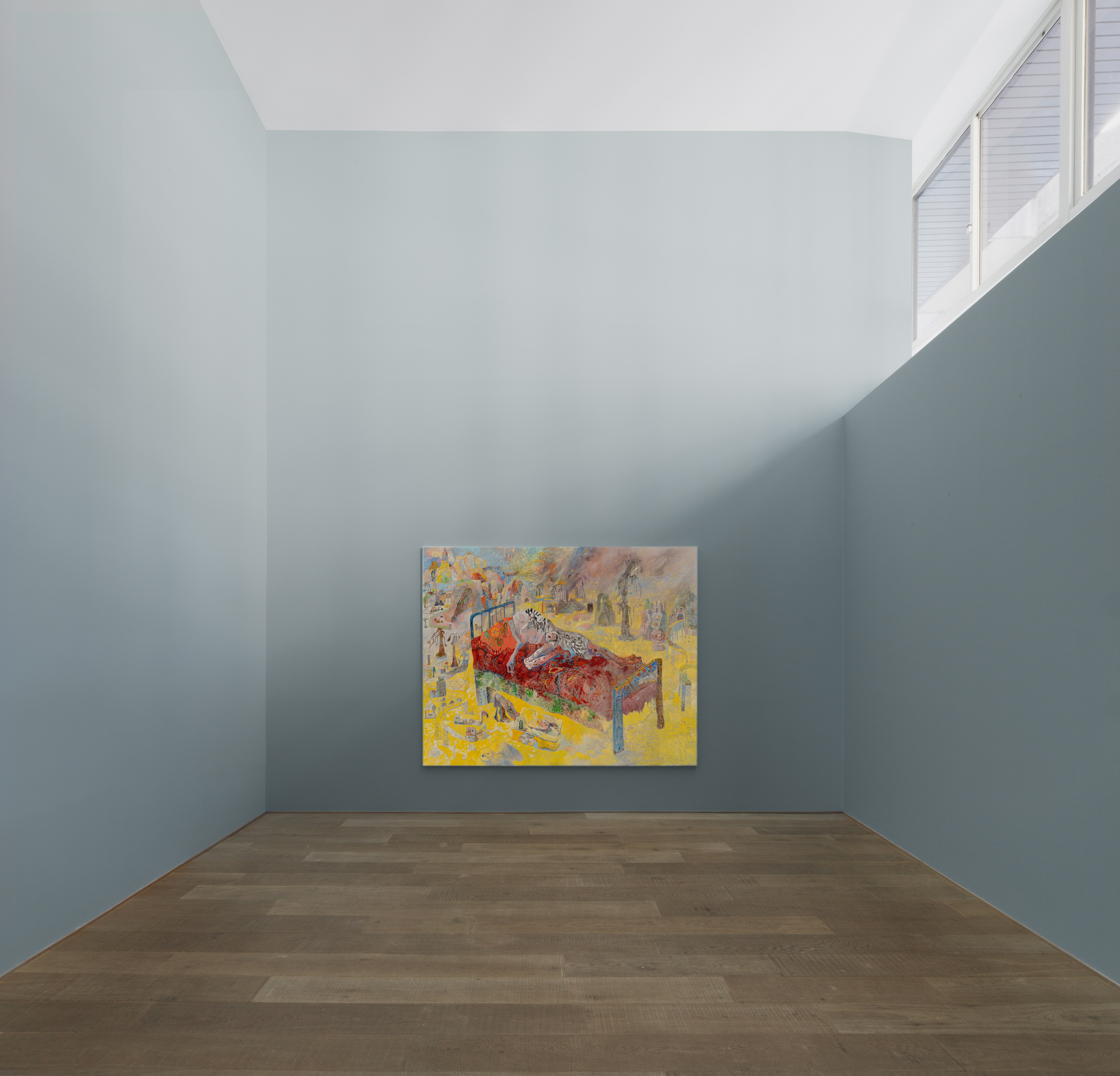 In Qiu’s works, the philosophical ideas of Chinese literati from the Wei and Jin (220-420) dynasties are reimagined as contemporary images: faces with ambivalent smiles, the chaos of inebriated dances and chants, and naked bodies, all set amidst strange flowers and plants in utopian ruins. The influences of traditional Eastern painting and European religious art of the late Middle Ages are also evident in his work: the use of aerial views creates a spacious realm for contemplation, while scattered perspectives and lines delineate deep mountains and desolate terrains, forming a thought-provoking imagery. Traditional Chinese art’s significant influence is noticeable in the painting Bare, evoking the concise depictions of the Arhat found in traditional Chinese art. With an extensive use of yellow, the painting evokes a striking apocalyptic landscape that, despite its grandeur, is collapsing into decay with a frail body on a bed. As the place where life begins and ends, this specific motif conveys both positive and negative connotations.