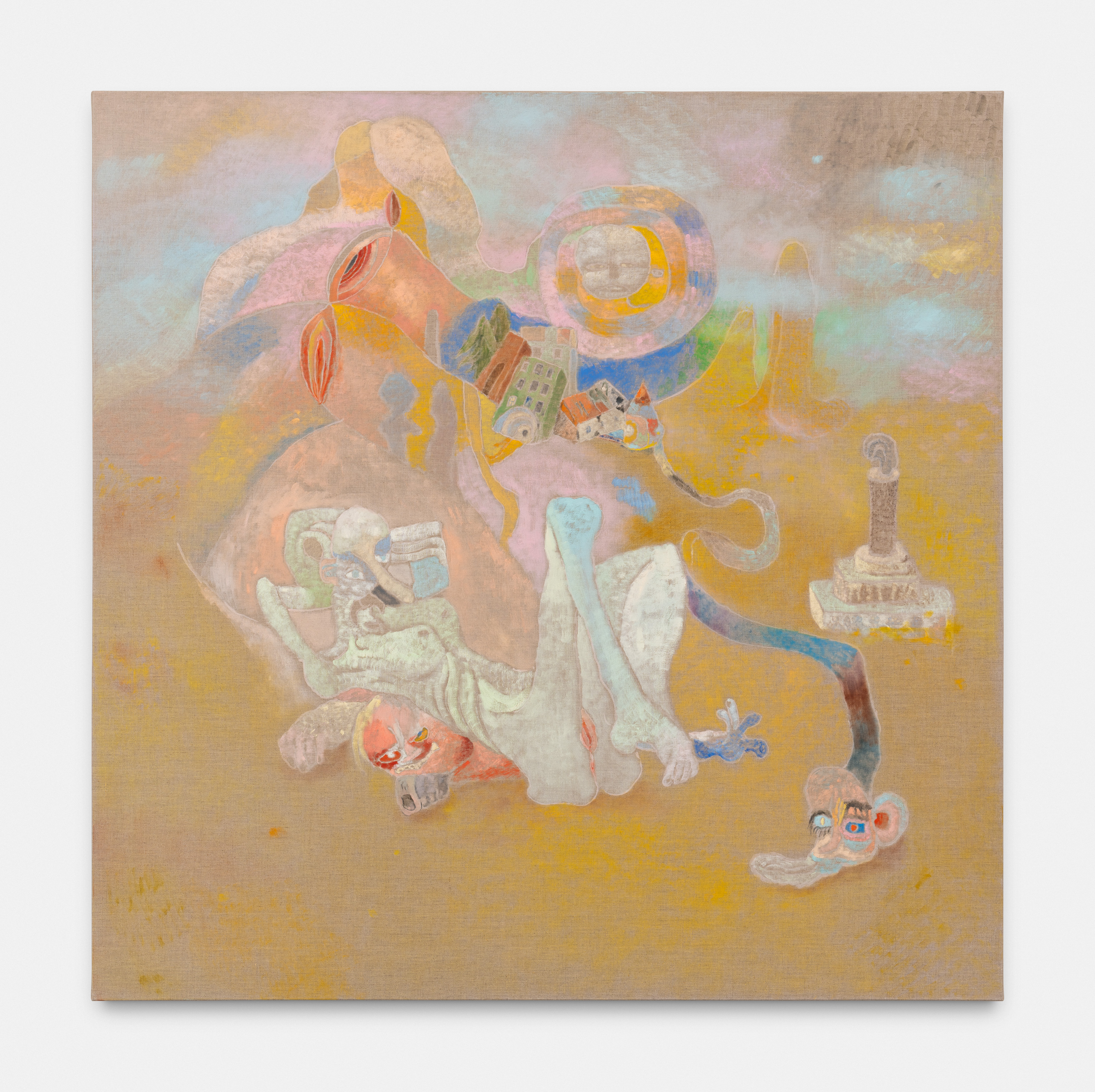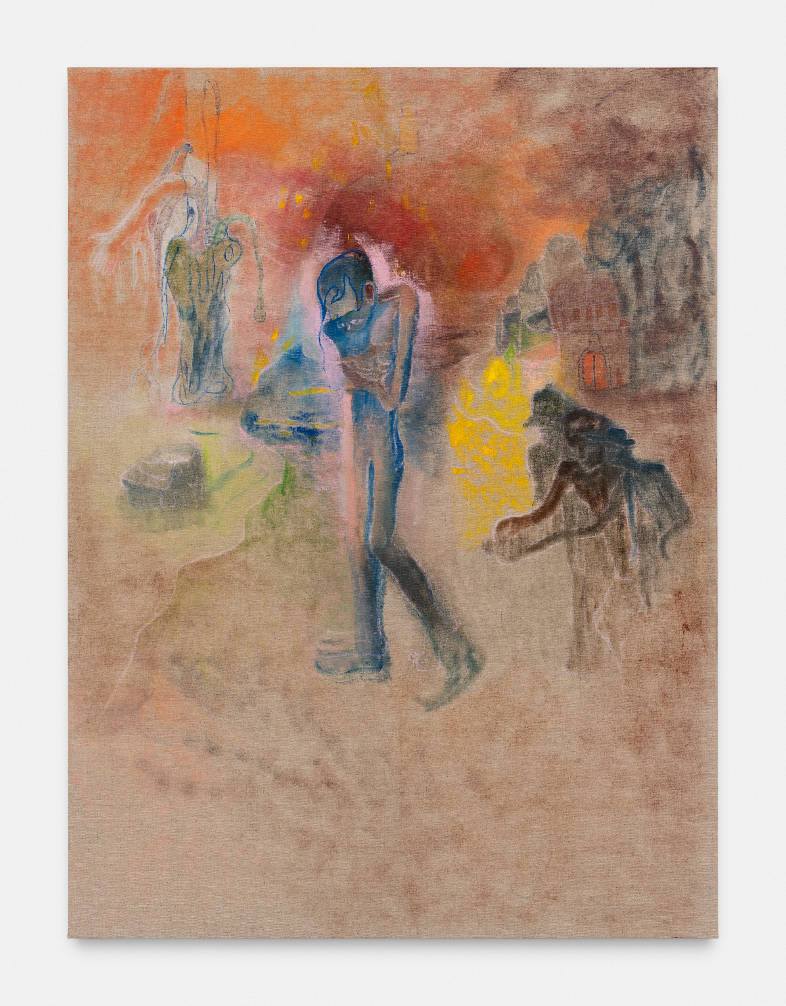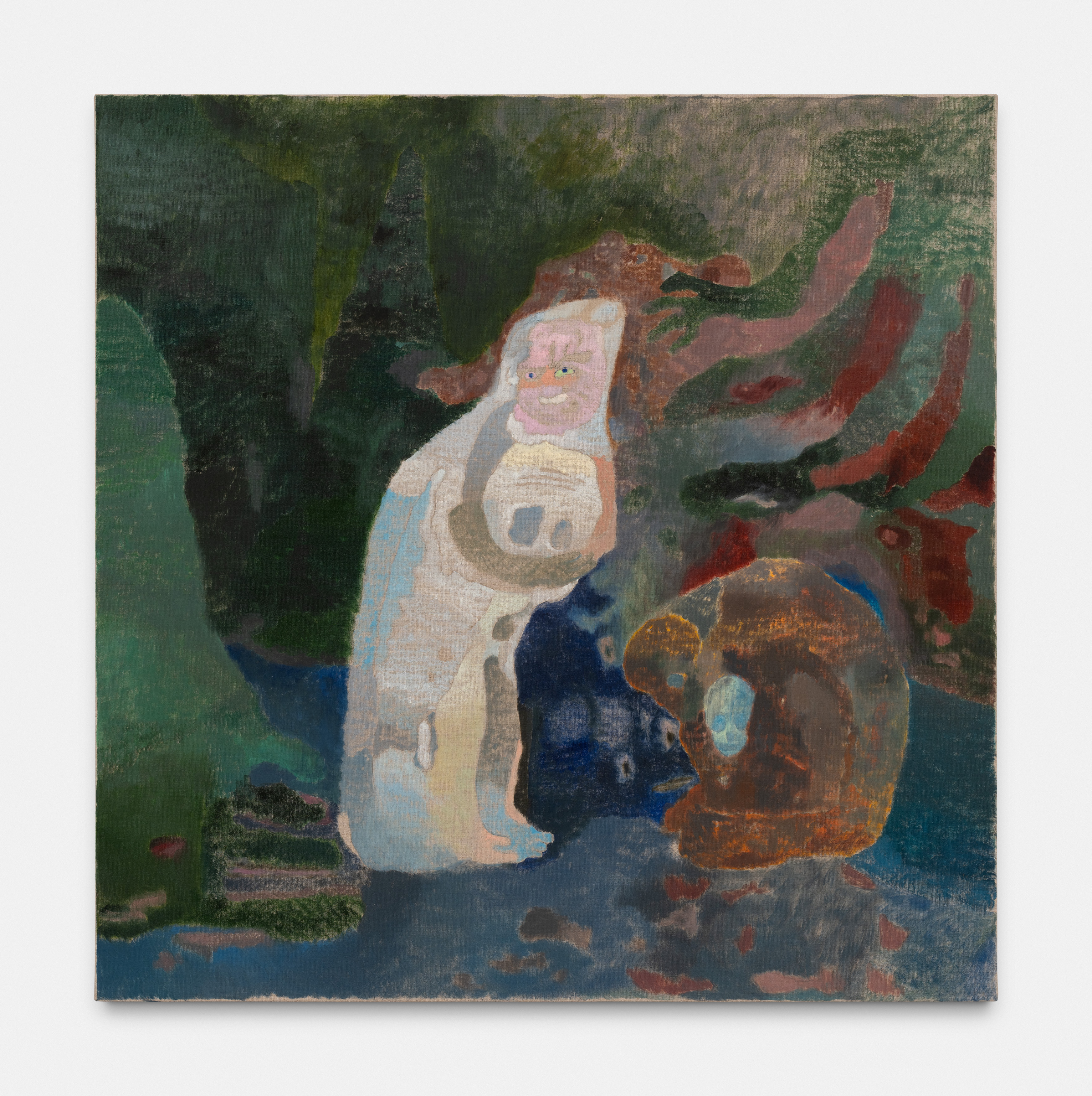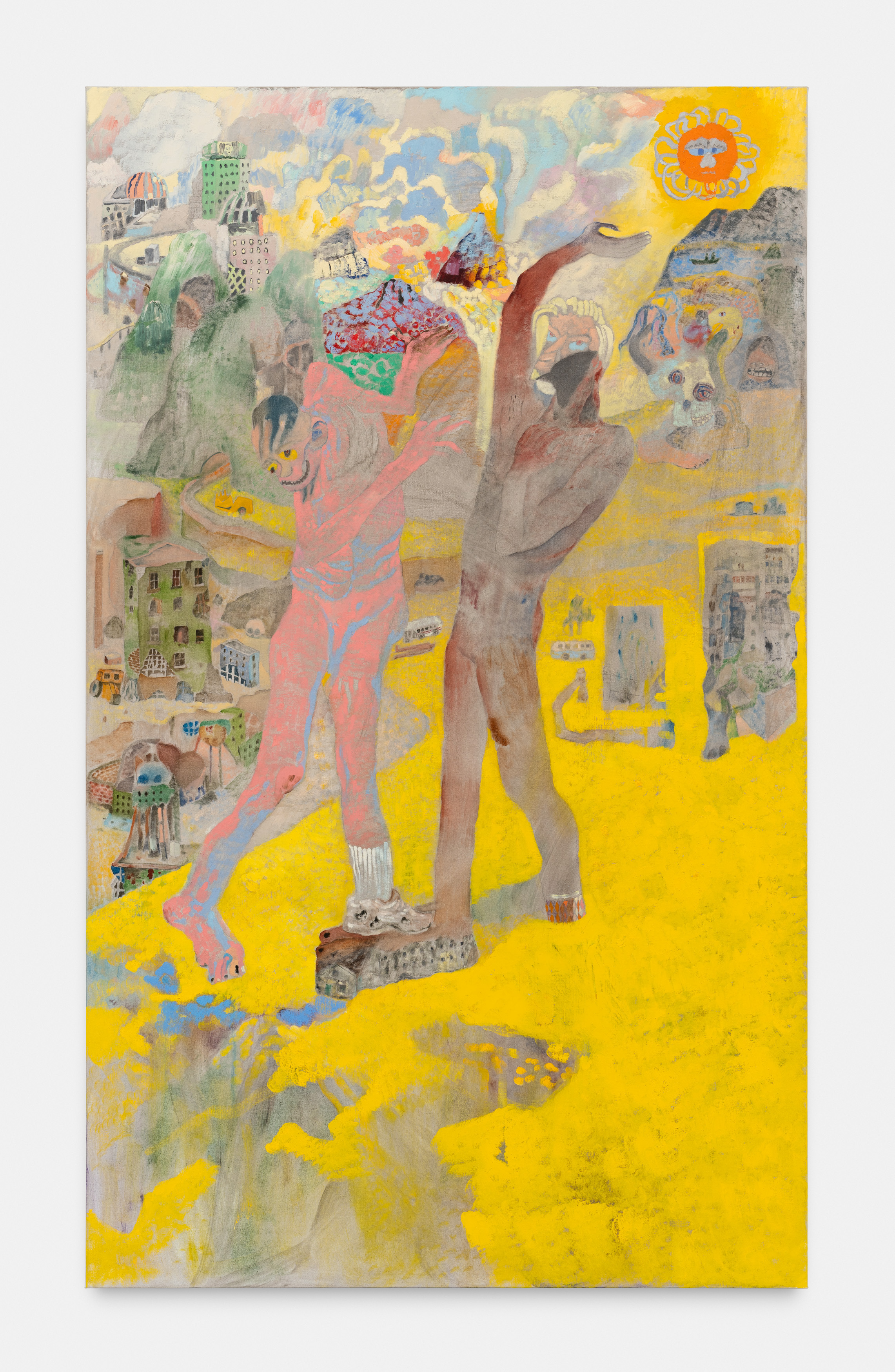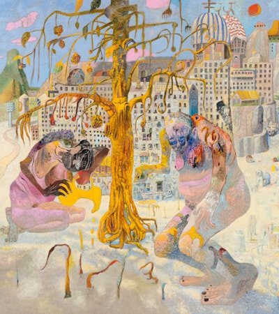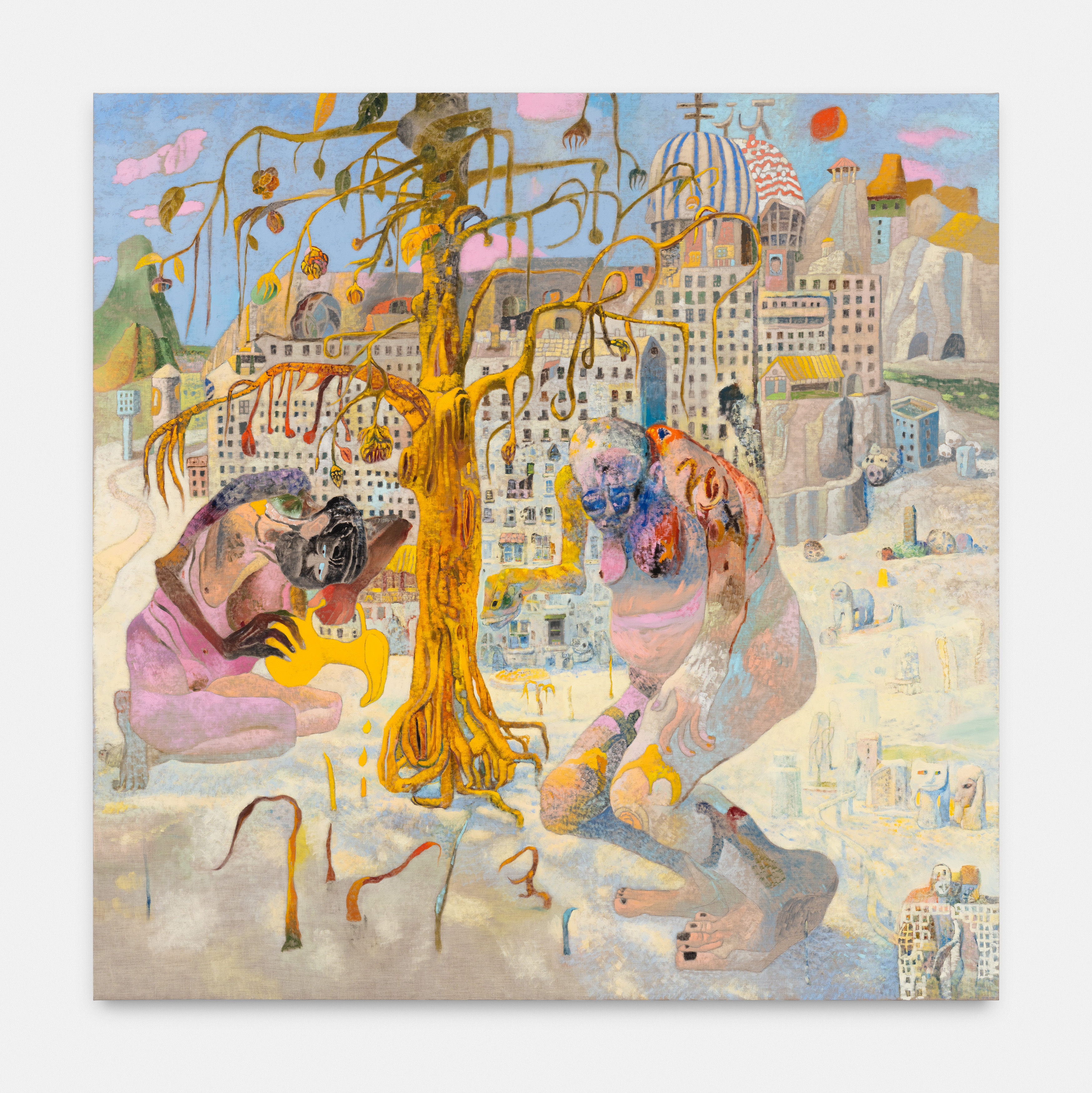 In Qiu’s works, the philosophical ideas of Chinese literati from the Wei and Jin (220-420) dynasties are reimagined as contemporary images: faces with ambivalent smiles, the chaos of inebriated dances and chants, and naked bodies, all set amidst strange flowers and plants in utopian ruins. The influences of traditional Eastern painting and European religious art of the late Middle Ages are also evident in his work: the use of aerial views creates a spacious realm for contemplation, while scattered perspectives and lines delineate deep mountains and desolate terrains, forming a thought-provoking imagery. Traditional Chinese art’s significant influence is noticeable in the painting Bare, evoking the concise depictions of the Arhat found in traditional Chinese art. With an extensive use of yellow, the painting evokes a striking apocalyptic landscape that, despite its grandeur, is collapsing into decay with a frail body on a bed. As the place where life begins and ends, this specific motif conveys both positive and negative connotations.