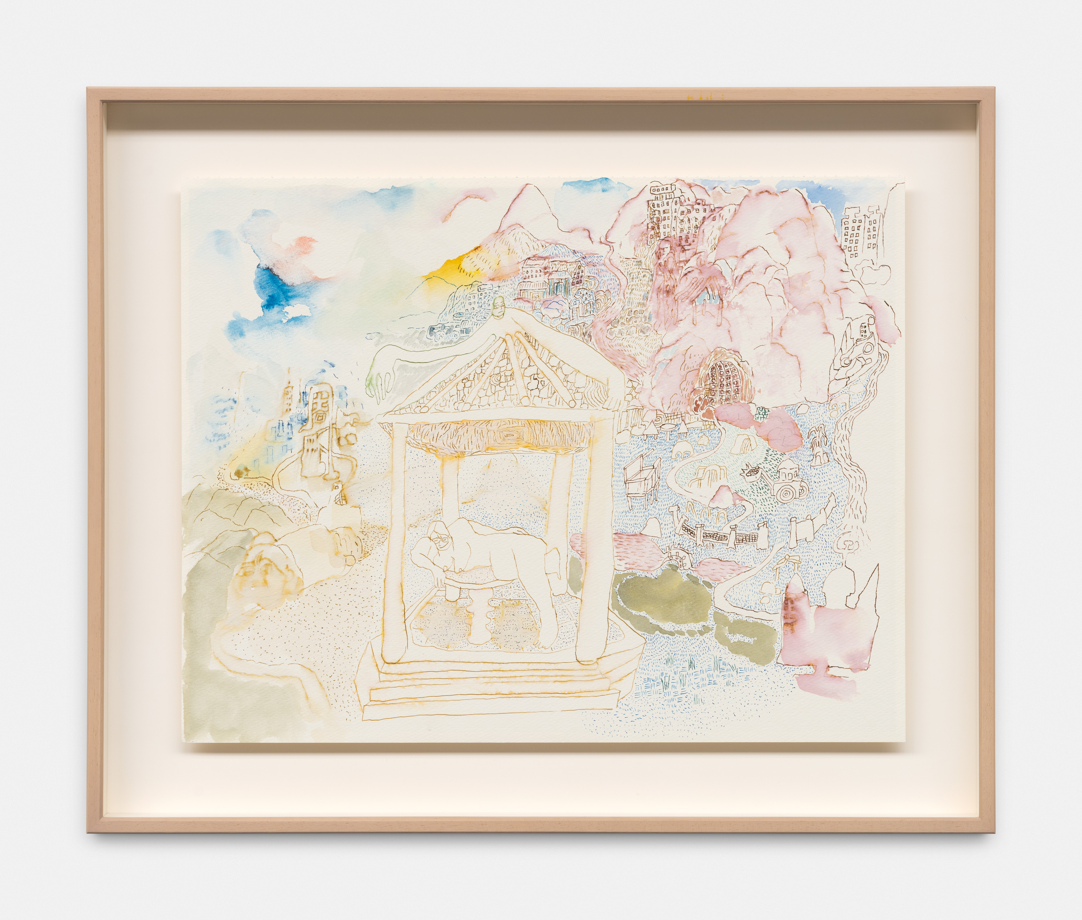 The artist’s inspiration further extends from personal recollections of his family to the geopolitical relationship between his hometown of Harbin, in China, and the former Soviet Union. These influences are visible in works such as The One Tree Forest and La Source, where the imagery of the deserted church and labourer’s shelter from his hometown combines to form futuristic architectures. Such distinctive architectures serve as vehicles for the artist’s recollections and fantasies, further merging the threads of past and present, the individual and collective, and observation and imagination.