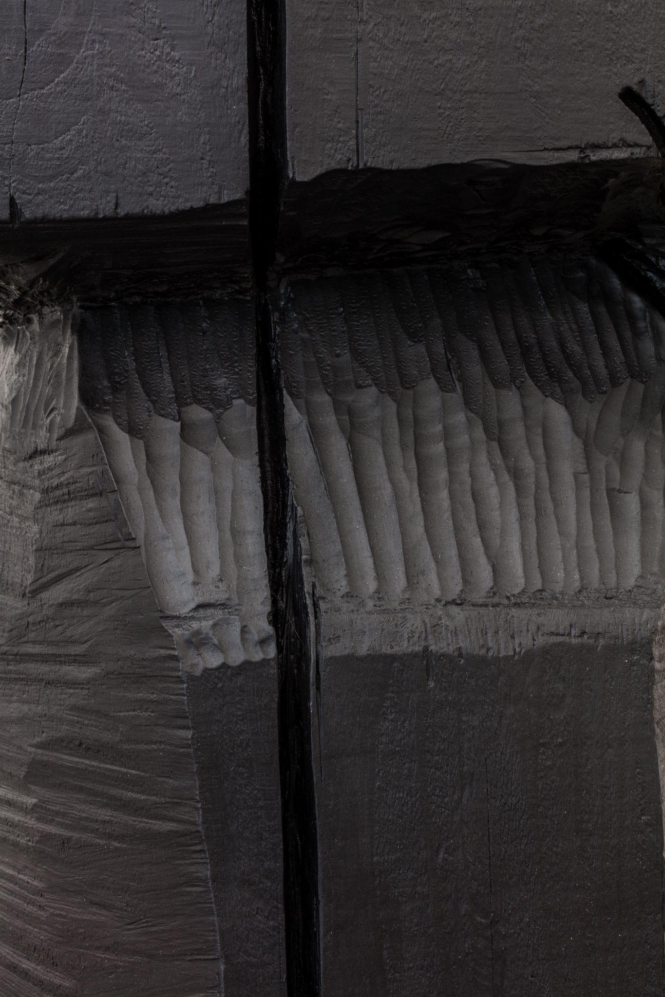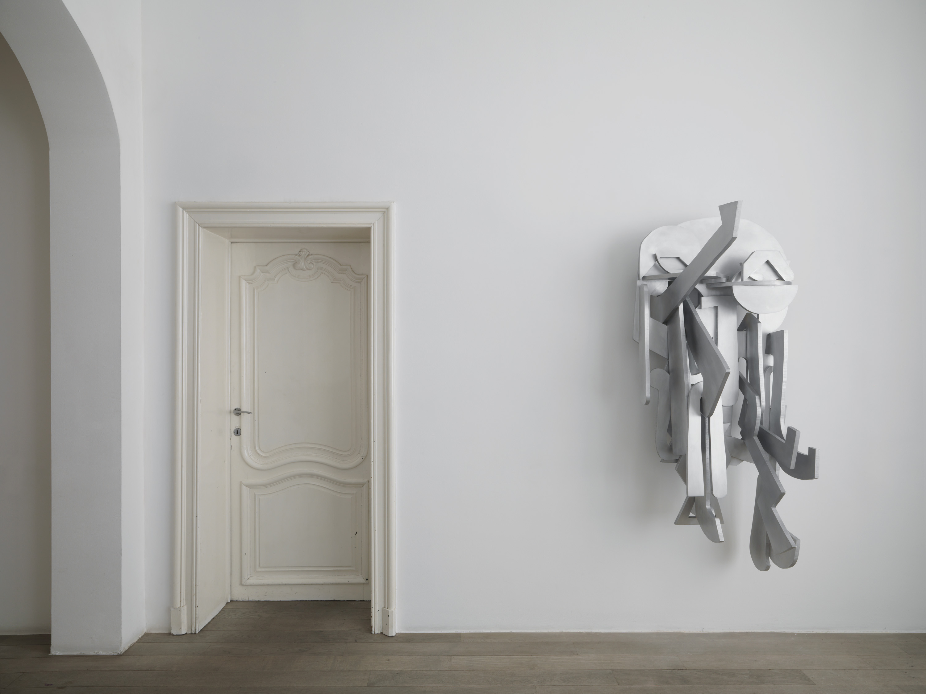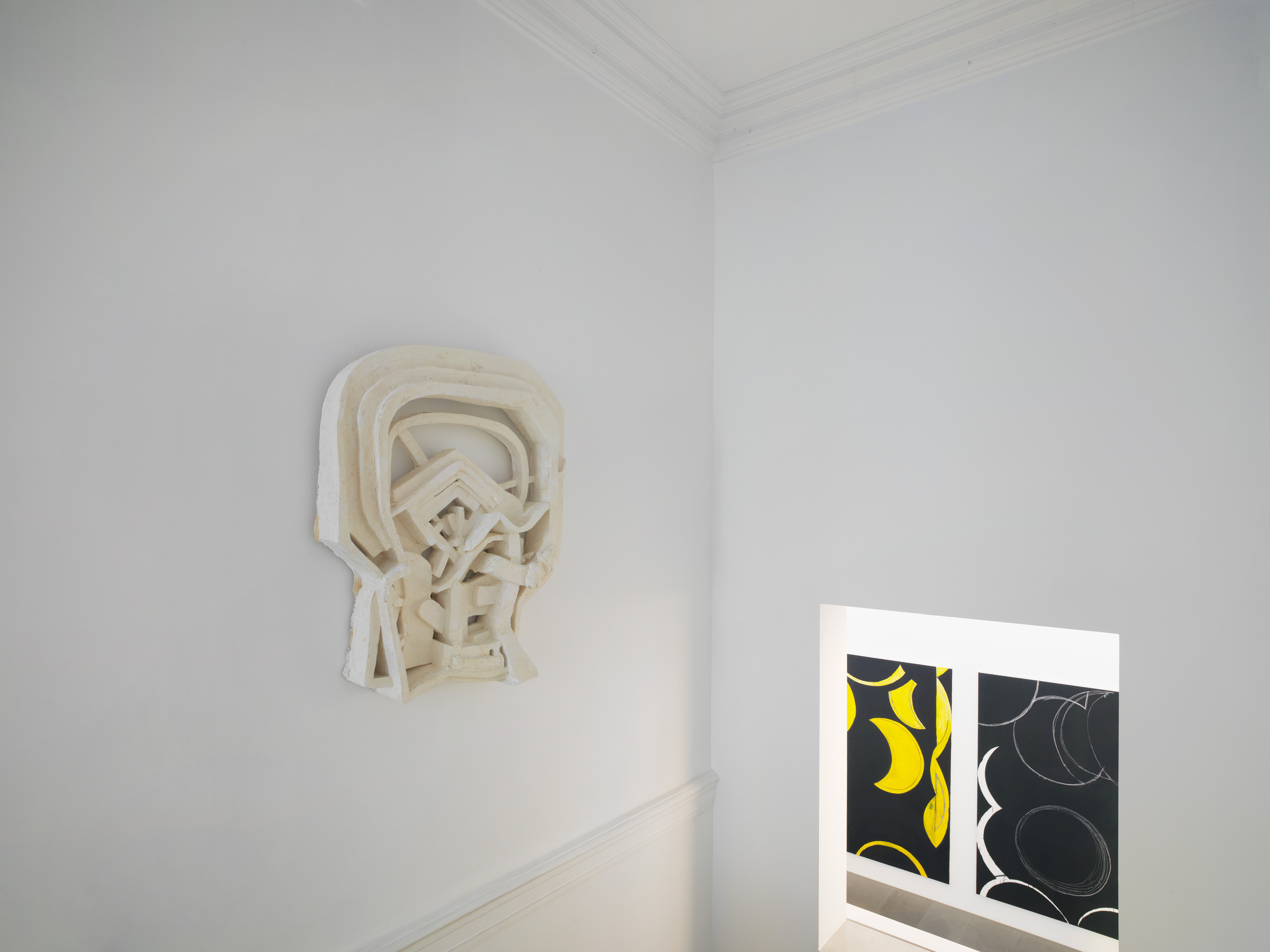 In this exhibition, Thomas Houseago presents a body of work that not only testifies to his continuing interest in the history of sculpture, but also hints at the emergence of a new aesthetic sensibility within his oeuvre. In this respect, the cuboid plaster sculpture in the first room is a prominent focal point. Whereas Houseago has long been known for his monumental and tactile figurative sculptures – which often reveal the method of their construction and the hand of the artist – this work is more architectural and abstract, and explores the notion of ‘spaces within spaces’. This shift in style and approach, which is characterised by overlapping surfaces and apertures, was first discernable in Houseago’s Moun Room (2015) – a vast, architectonic and immersive environment that viewers could enter and, in so doing, become active participants in the work. In terms of scale, and in the break with figuration, the Moun Room can be regarded as a departure for Houseago. The works on display here also reflect this new trajectory, which places greater emphasis upon the dynamic interaction between inside and outside, light and dark, shadow and light, and positive and negative space.
