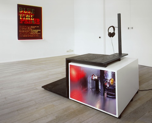 The lyrics of the two songs about the older pieces, from which this new work originates, are stuck on the walls in adhesive letters. They accompany a text created for the occasion referring to the new work. Playing alone, the musician Vale Poher performs these texts, accompanying the songs on electric guitar. This is broadcast via headphones placed on a stand upon which the visitor can sit.