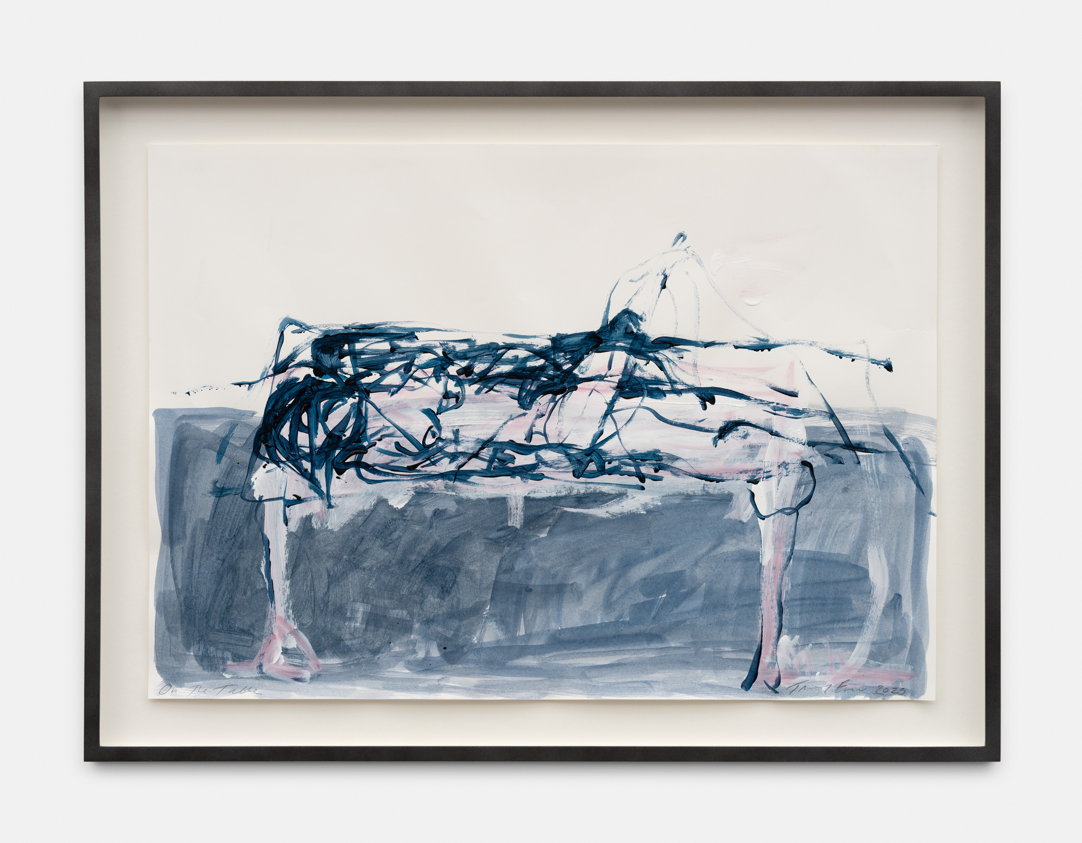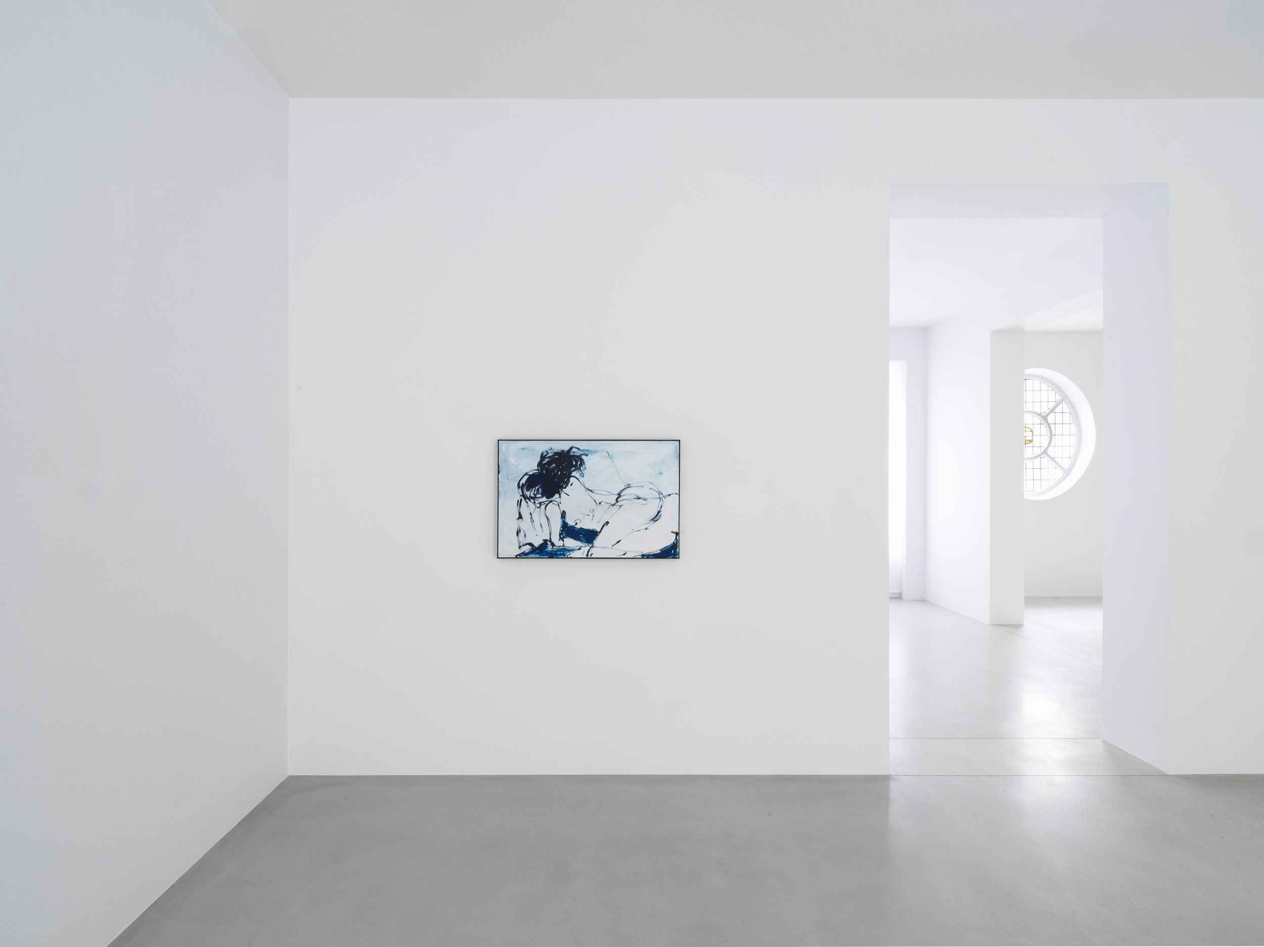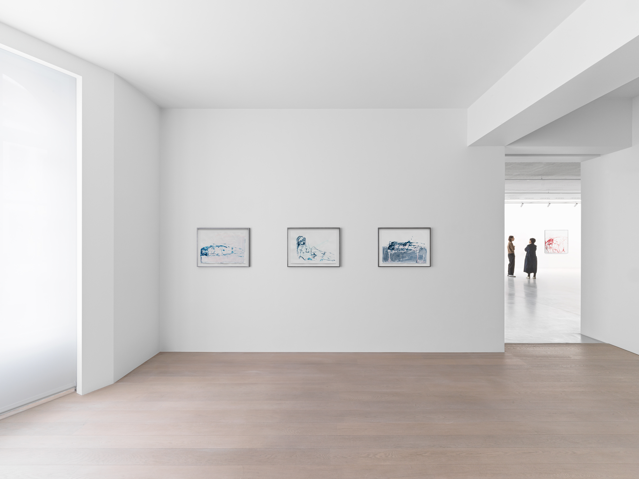 Most of the works in the exhibition depict the artist—either alone or entwined with another—in a prone position: in a bed, on a table, a chaise longue or sofa. Emin has frequently depicted beds in her work, presenting them as places with both positive and negative connotations: they can be sites of pain and pleasure, or dreams and torments. They remind us of home, but also of hospitals and convalescence. They are where we are born and, traditionally, where we die. But in four vertical self-portraits, the artist is not in repose but erect, facing the viewer. Entitled This is Me, Always A Mirror, You could drink me and I Felt So Much Older, they hint at a process of emotional realignment and acceptance. With the same linear quality as the faces she created for the doors of the National Portrait Gallery in London, Emin's self-portraits show the artist looking out of the frame and into the world.