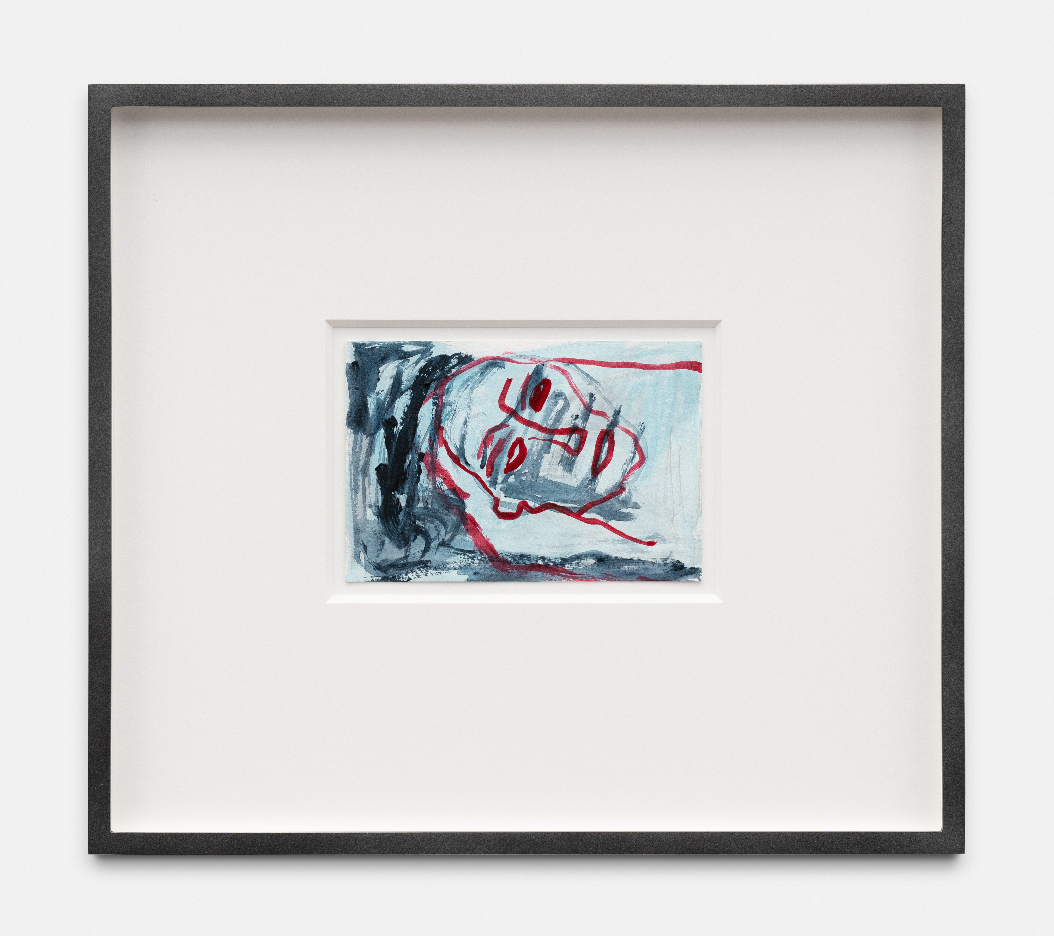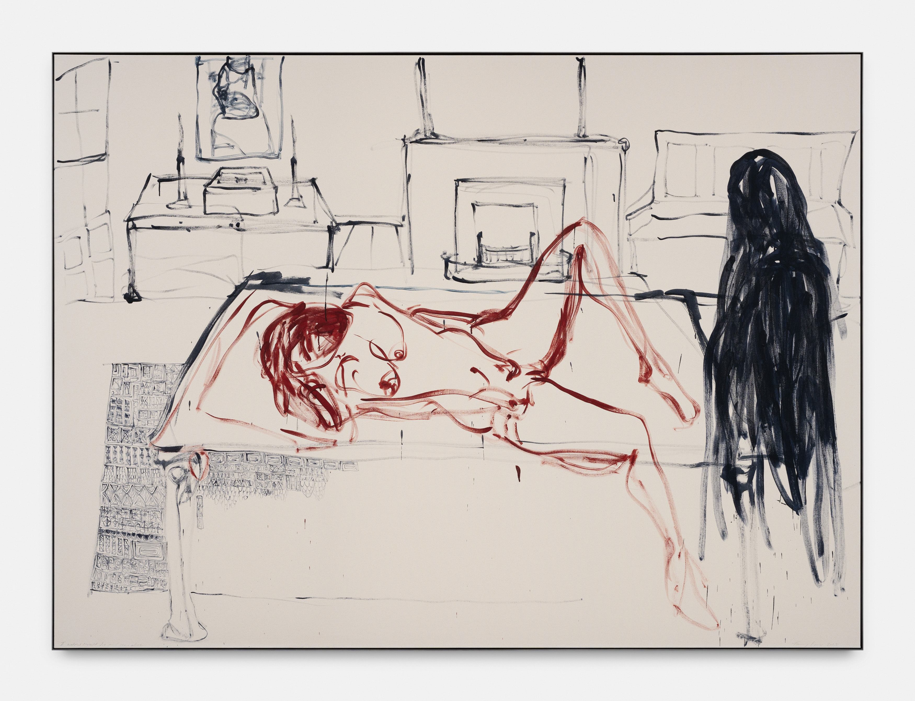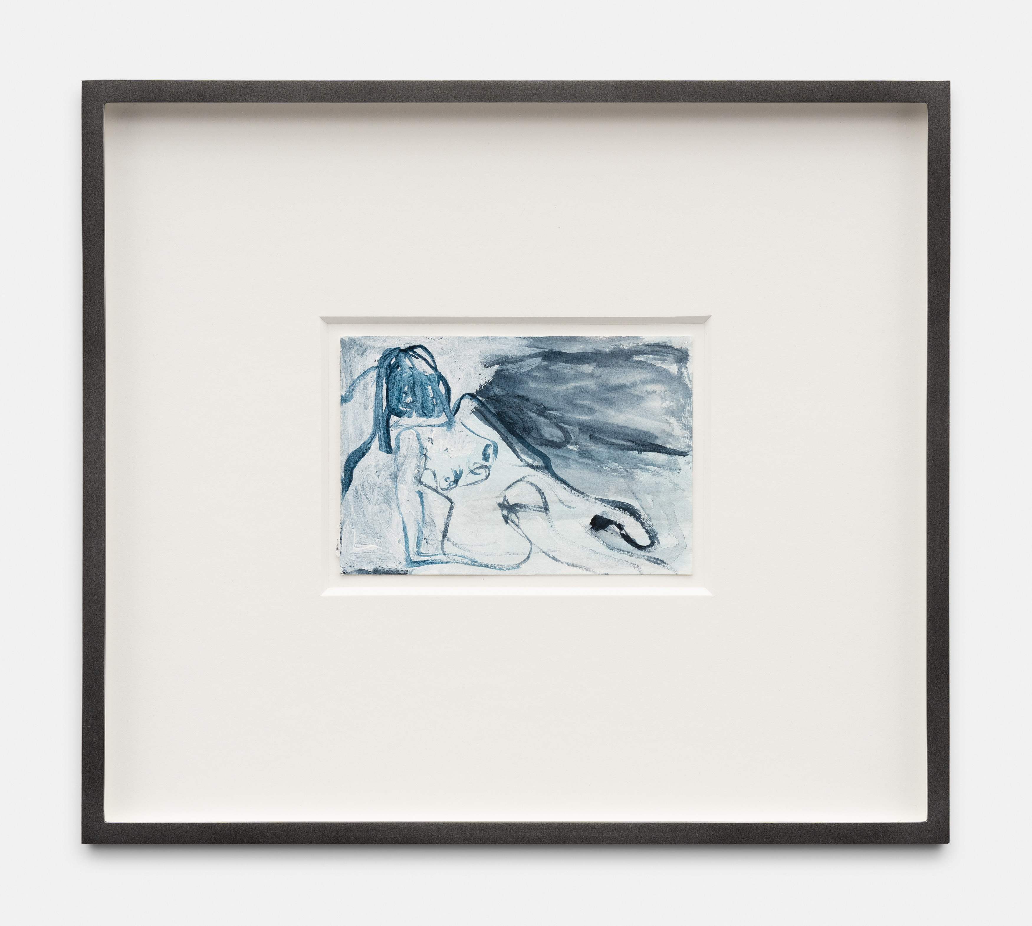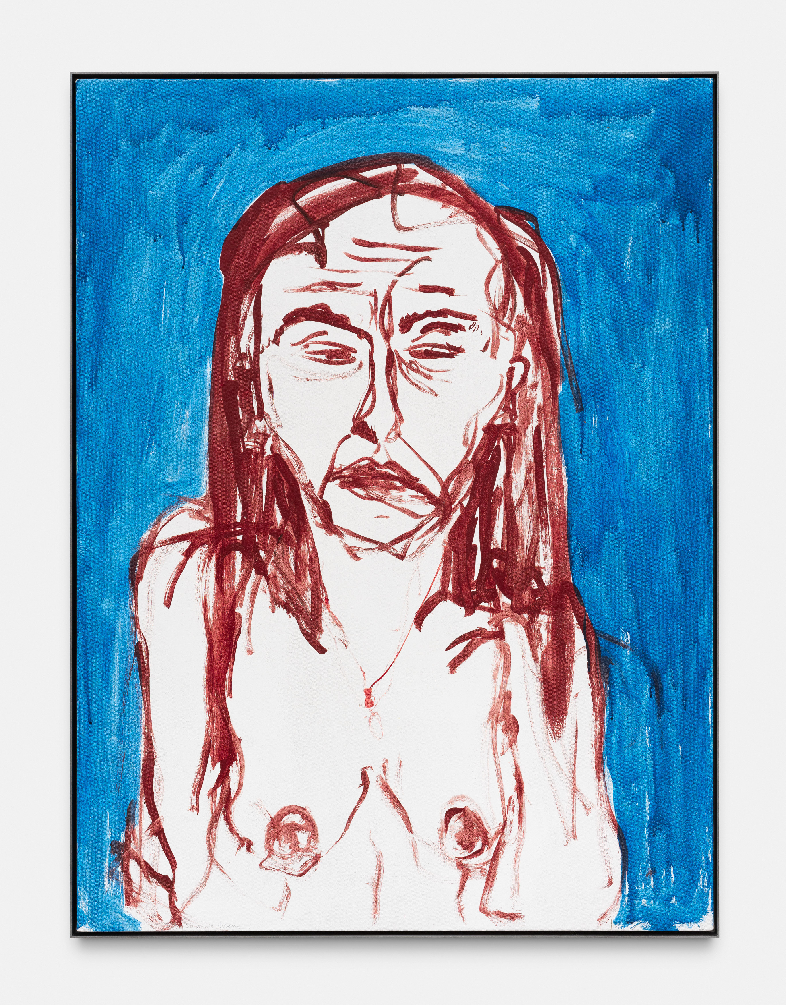 Most of the works in the exhibition depict the artist—either alone or entwined with another—in a prone position: in a bed, on a table, a chaise longue or sofa. Emin has frequently depicted beds in her work, presenting them as places with both positive and negative connotations: they can be sites of pain and pleasure, or dreams and torments. They remind us of home, but also of hospitals and convalescence. They are where we are born and, traditionally, where we die. But in four vertical self-portraits, the artist is not in repose but erect, facing the viewer. Entitled This is Me, Always A Mirror, You could drink me and I Felt So Much Older, they hint at a process of emotional realignment and acceptance. With the same linear quality as the faces she created for the doors of the National Portrait Gallery in London, Emin's self-portraits show the artist looking out of the frame and into the world.