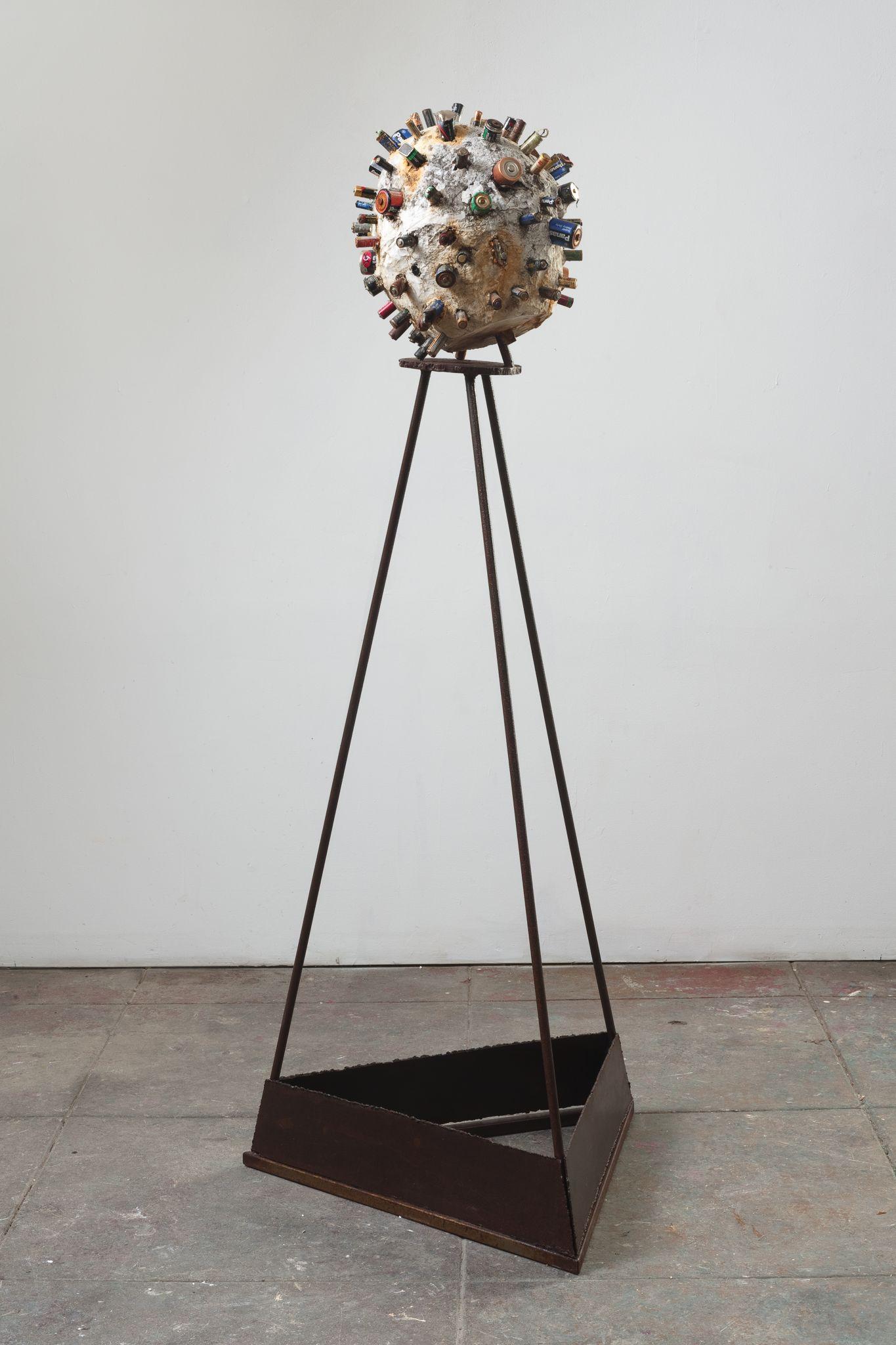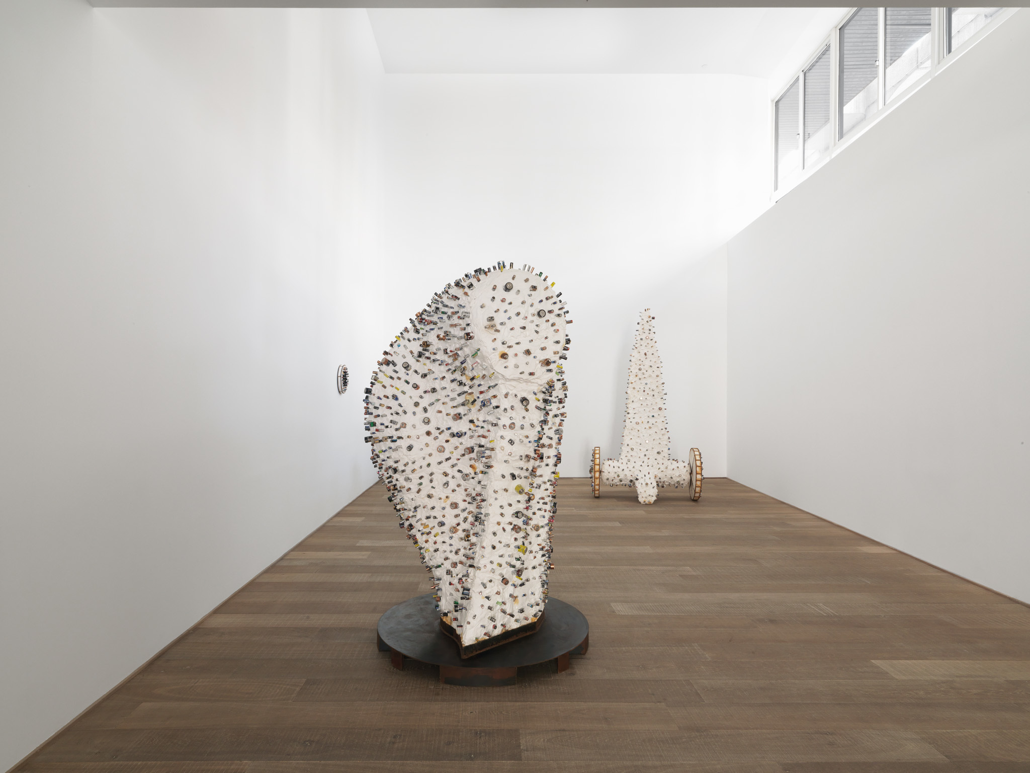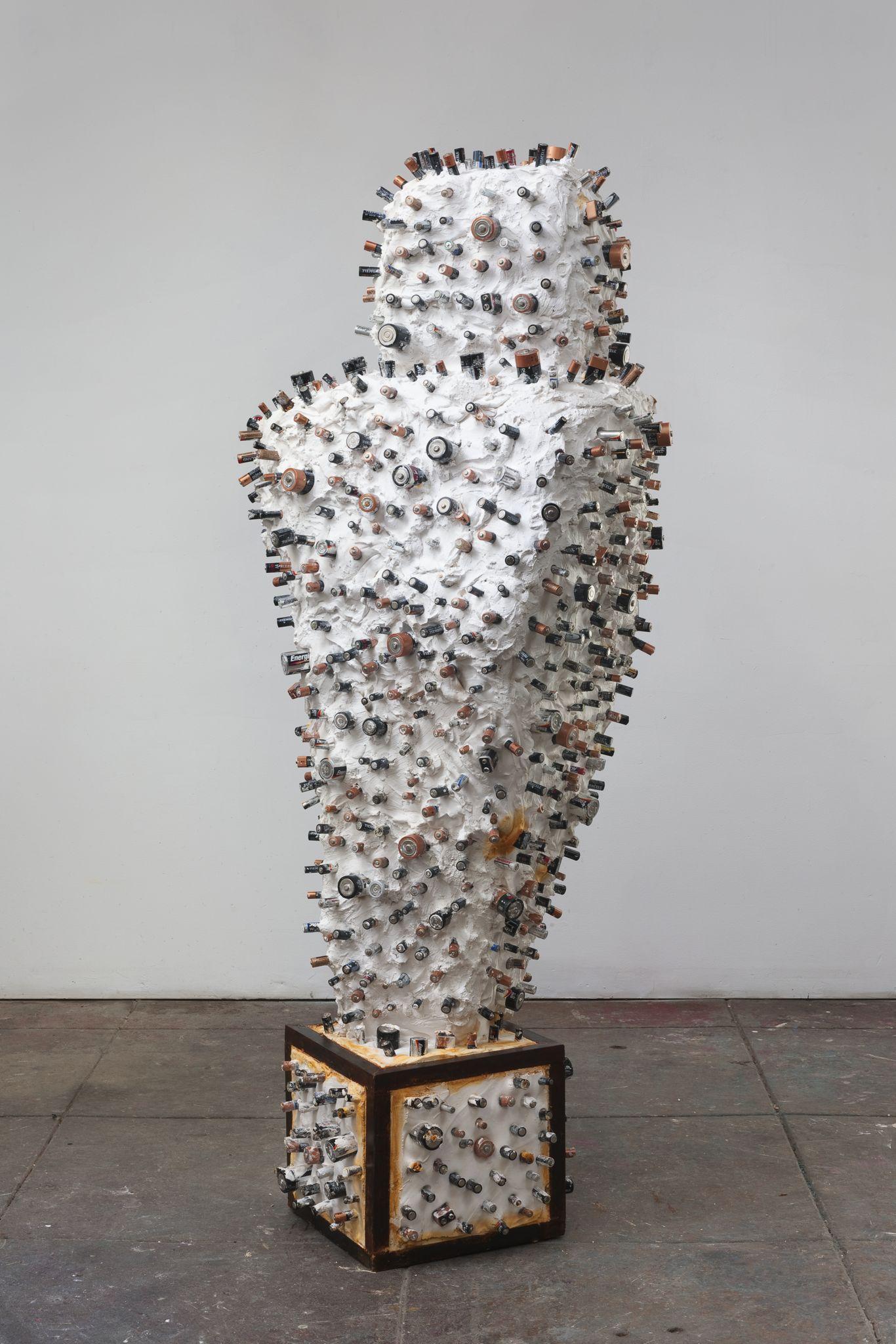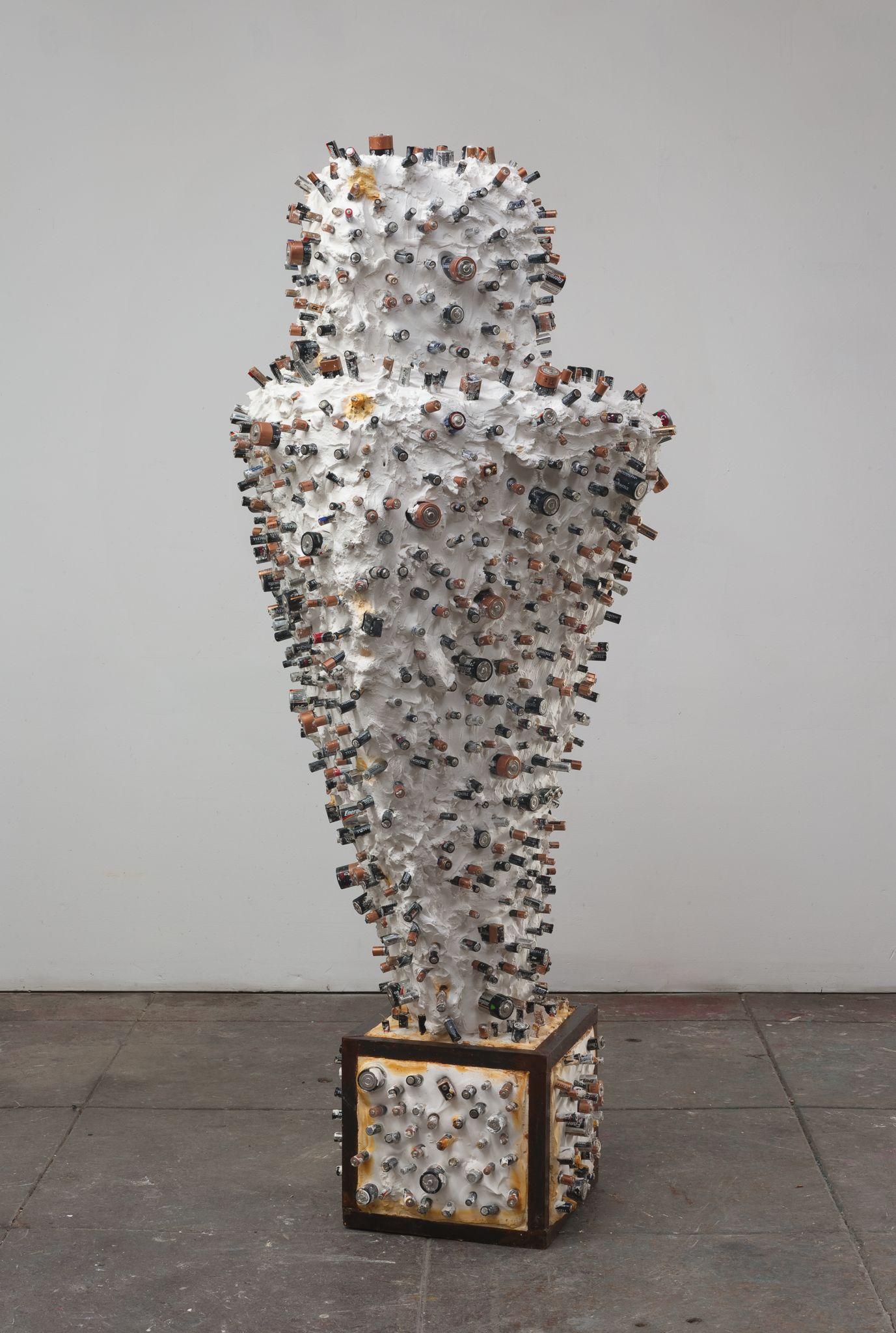 At the same time, Holloway’s work engages on a more formal and universal level with modernism, particularly the influence of African art on early twentieth-century sculpture (the batteries recall the nail-filled Nkondi religious objects produced in West Central Africa), the ‘aestheticized hostility’ of the 1970s Los Angeles art scene (the scavenged materials and the unforgiving bitumen), as well as ideas from a diverse range of cultural and arcane sources including the nineteenth-century American painter Albert Pynkham Ryder, Karlheinz Stockhausen, the Urantia Book and Antonin Artaud’s anarchic and esoteric novel Heliogabalus (1933). In terms of approach, the artist’s earlier focus on line, plane, colour and assemblage has given way to a greater sobriety and an emphasis on solidity, volume and modelling.