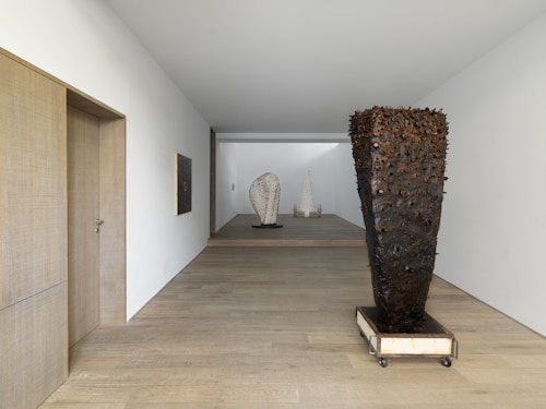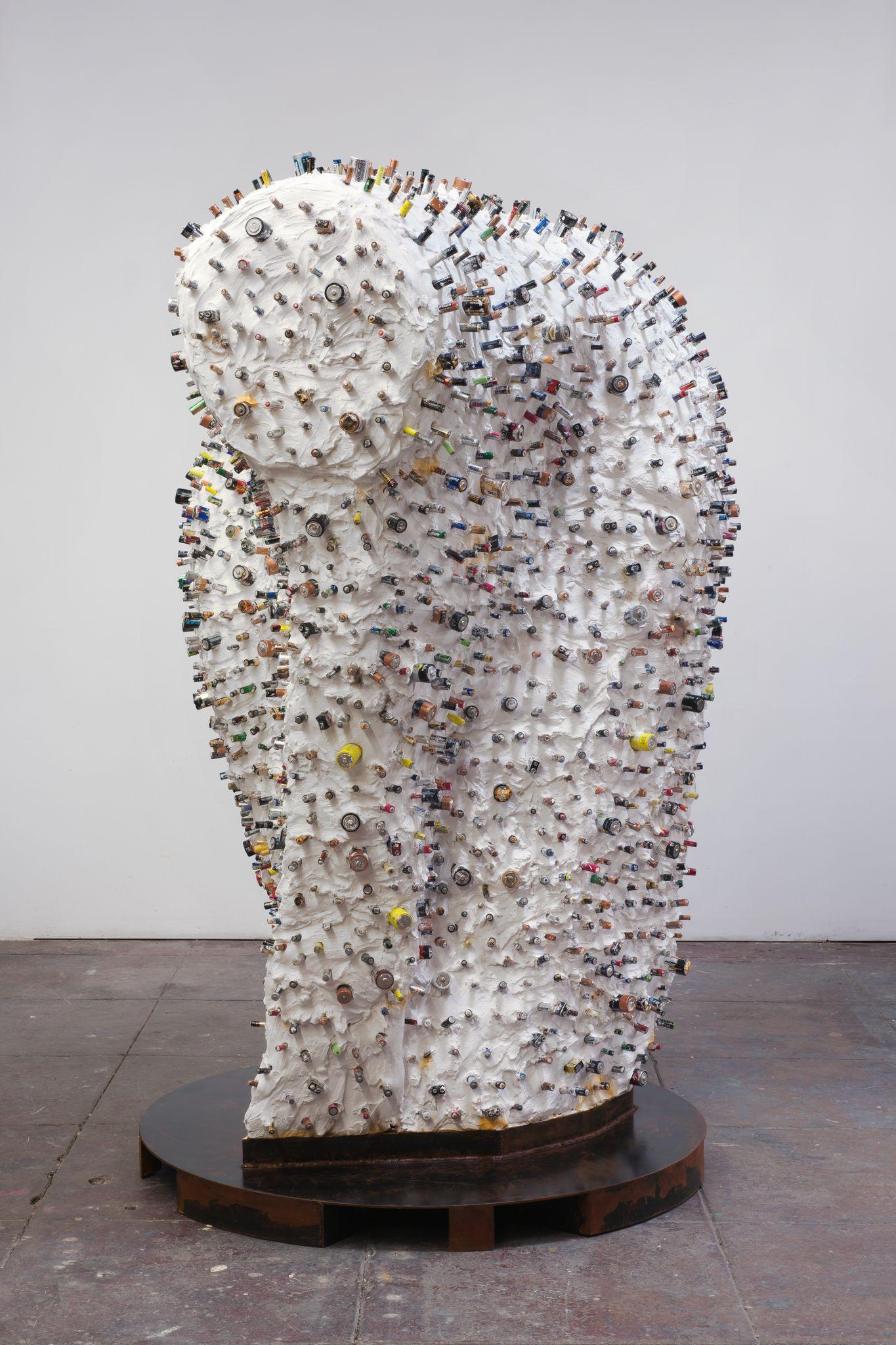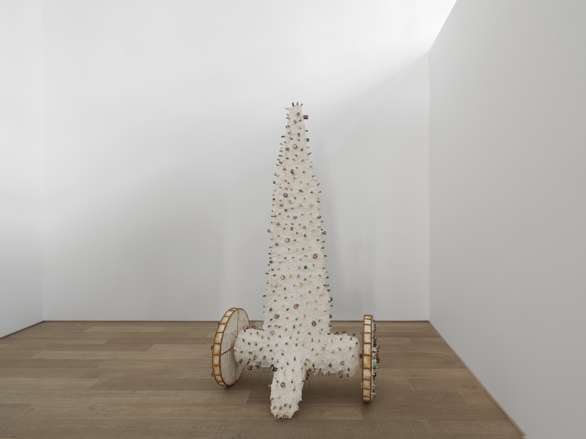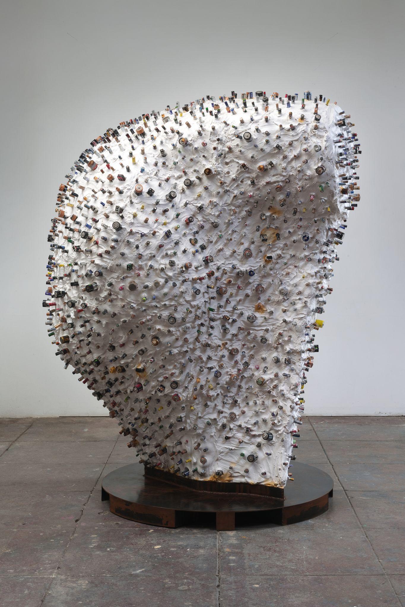 At the same time, Holloway’s work engages on a more formal and universal level with modernism, particularly the influence of African art on early twentieth-century sculpture (the batteries recall the nail-filled Nkondi religious objects produced in West Central Africa), the ‘aestheticized hostility’ of the 1970s Los Angeles art scene (the scavenged materials and the unforgiving bitumen), as well as ideas from a diverse range of cultural and arcane sources including the nineteenth-century American painter Albert Pynkham Ryder, Karlheinz Stockhausen, the Urantia Book and Antonin Artaud’s anarchic and esoteric novel Heliogabalus (1933). In terms of approach, the artist’s earlier focus on line, plane, colour and assemblage has given way to a greater sobriety and an emphasis on solidity, volume and modelling.