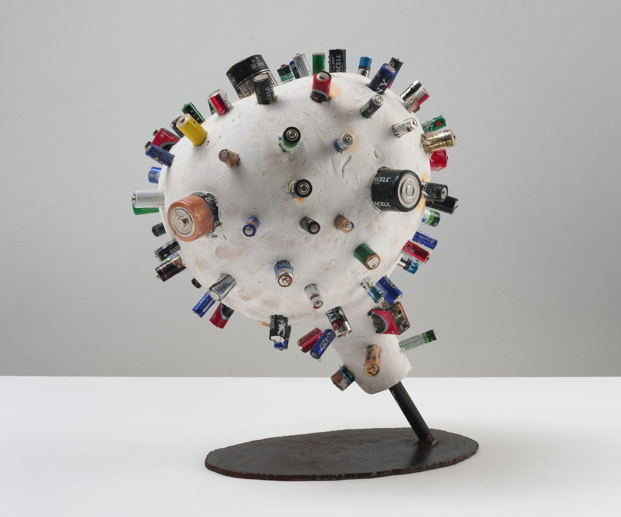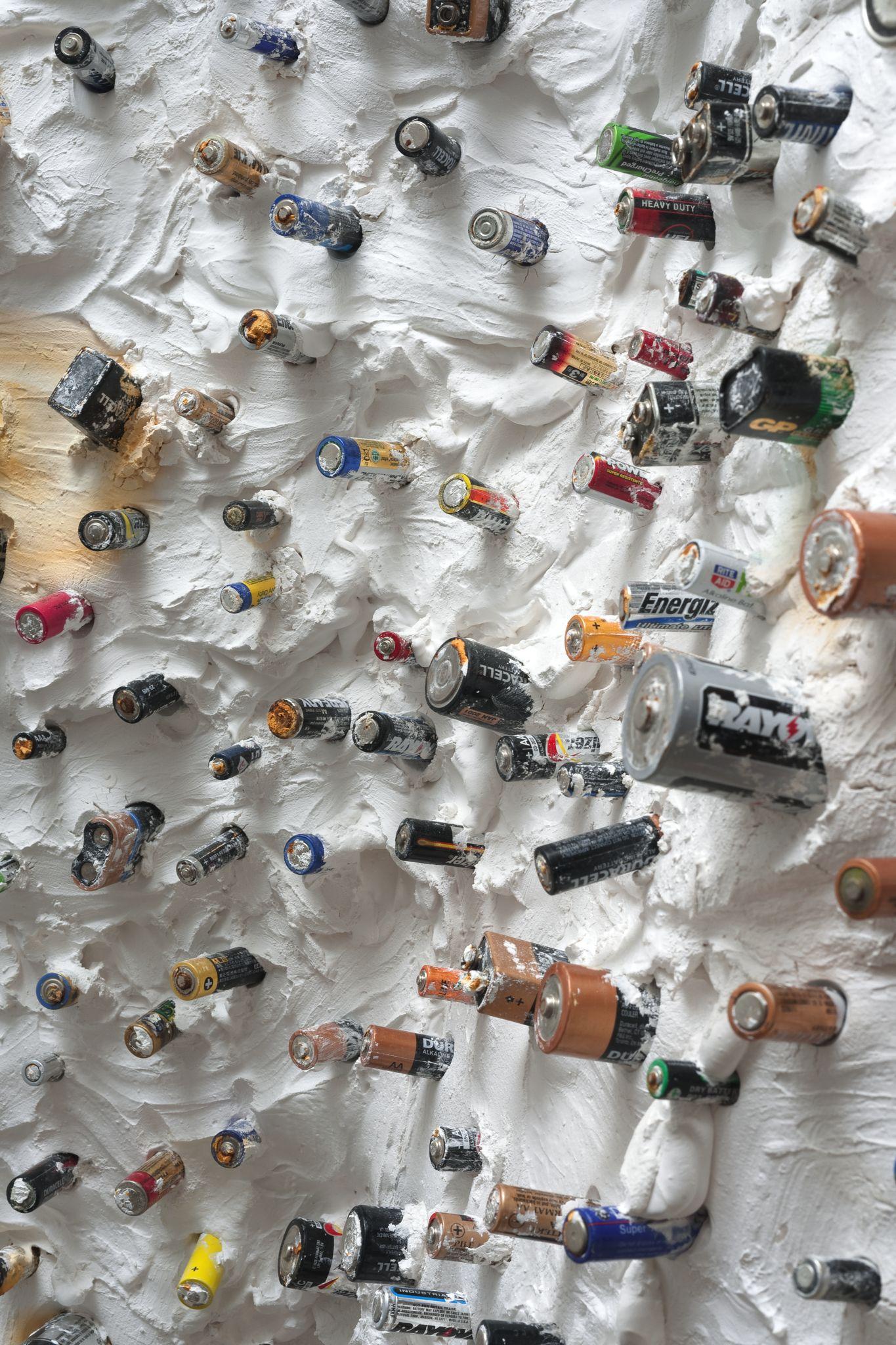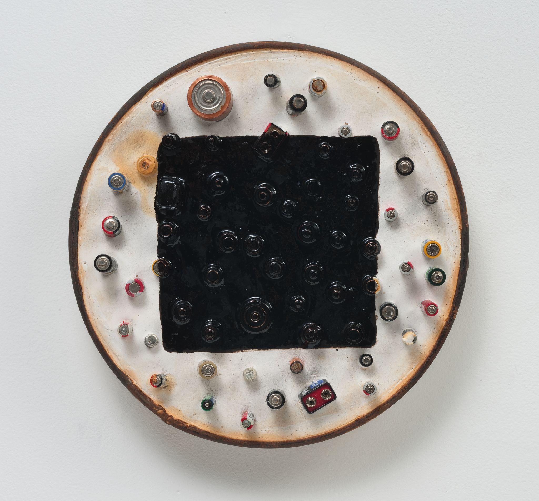 Working in a pared-down range of materials – steel, plaster, bitumen, orange peel and spent batteries – Holloway fuses the ancient (plaster) with the modern (steel), the local (orange rind, bitumen) with the global (batteries). The orange peel alludes to California’s history as one of the largest producers of oranges; the tar comes from California’s 10,000-year-old La Brea Tar Pits, where natural bitumen still seeps from the ground. Pre-historic fossils from the site are now housed in a museum built by the philanthropist George C. Page (1901-2000), founder of one of the state’s biggest fruit distribution companies, Mission Pak Fruit. While the bitumen and citrus peel lends Holloway’s work an inescapable, regional specificity, the spent batteries refer to the global problem of how to safely dispose of consumer waste. When Holloway first started working with batteries, he had little piles of them scattered all around his house; disposal was a mystery. By integrating them into his work, Holloway points to the unavoidable environmental costs of contemporary life.