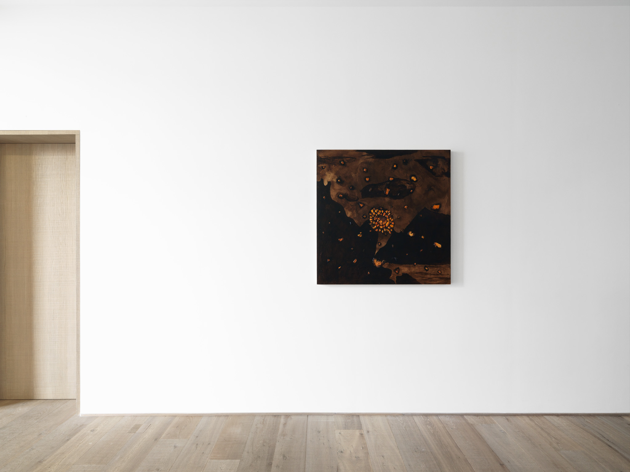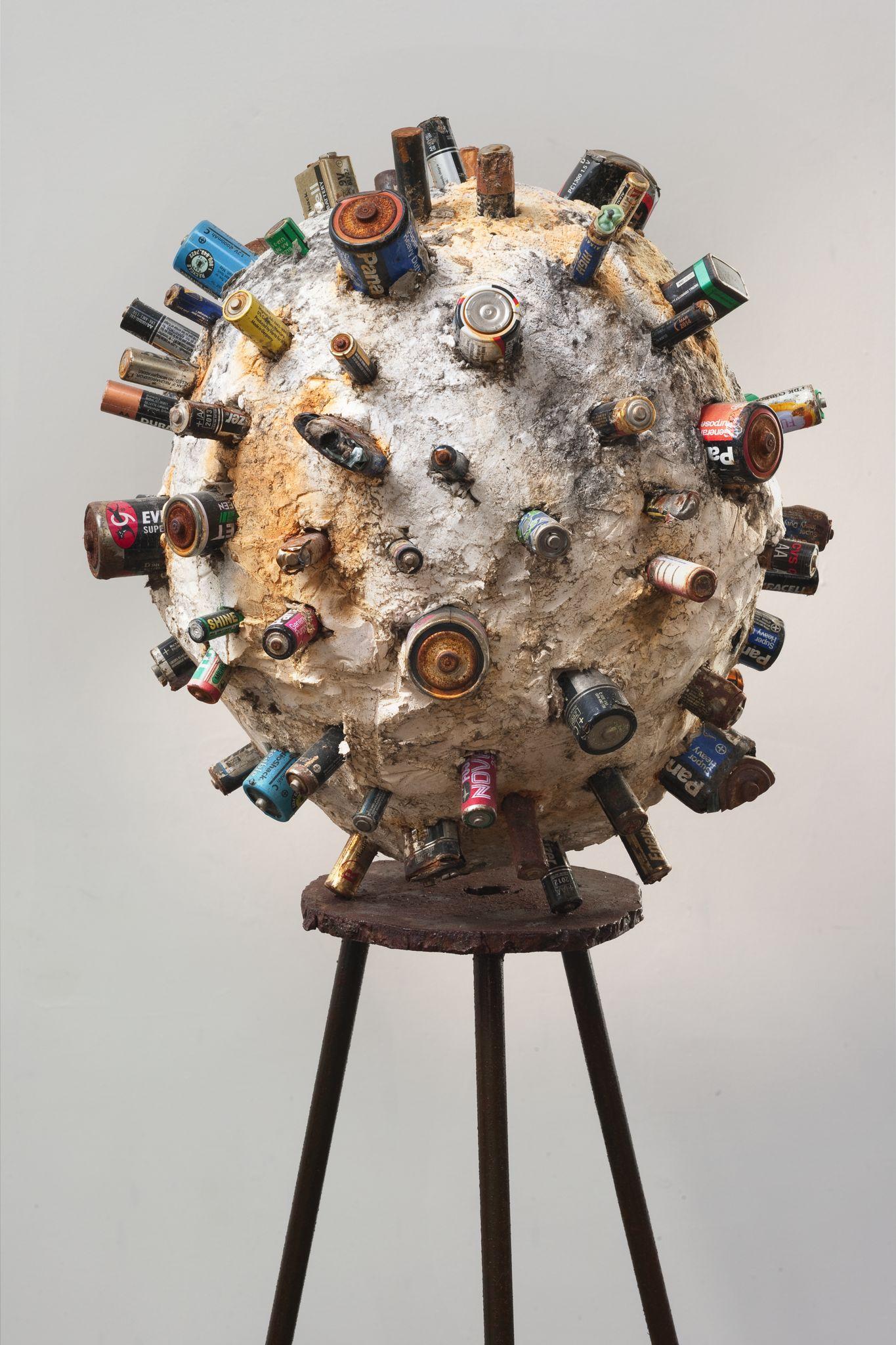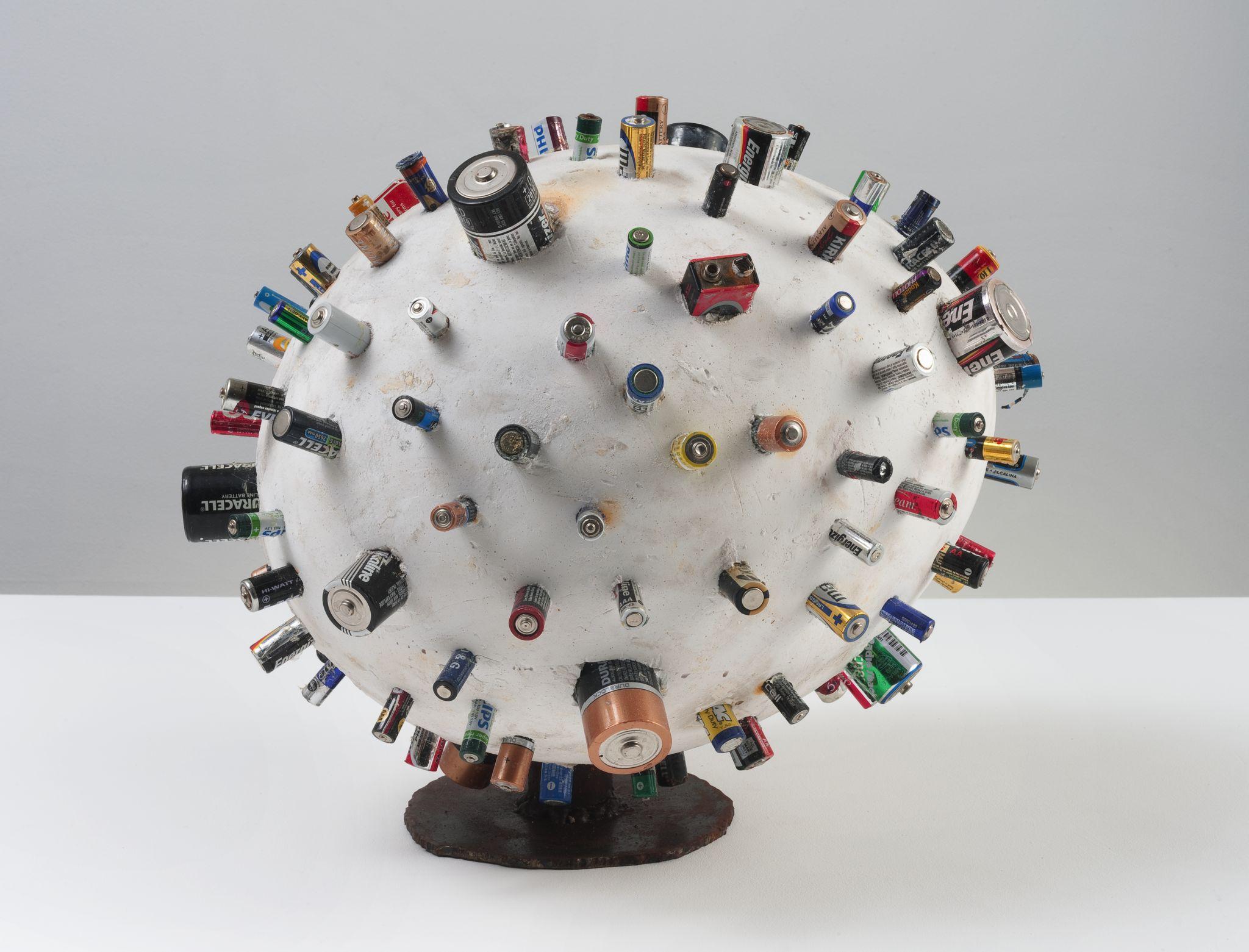 Working in a pared-down range of materials – steel, plaster, bitumen, orange peel and spent batteries – Holloway fuses the ancient (plaster) with the modern (steel), the local (orange rind, bitumen) with the global (batteries). The orange peel alludes to California’s history as one of the largest producers of oranges; the tar comes from California’s 10,000-year-old La Brea Tar Pits, where natural bitumen still seeps from the ground. Pre-historic fossils from the site are now housed in a museum built by the philanthropist George C. Page (1901-2000), founder of one of the state’s biggest fruit distribution companies, Mission Pak Fruit. While the bitumen and citrus peel lends Holloway’s work an inescapable, regional specificity, the spent batteries refer to the global problem of how to safely dispose of consumer waste. When Holloway first started working with batteries, he had little piles of them scattered all around his house; disposal was a mystery. By integrating them into his work, Holloway points to the unavoidable environmental costs of contemporary life.
