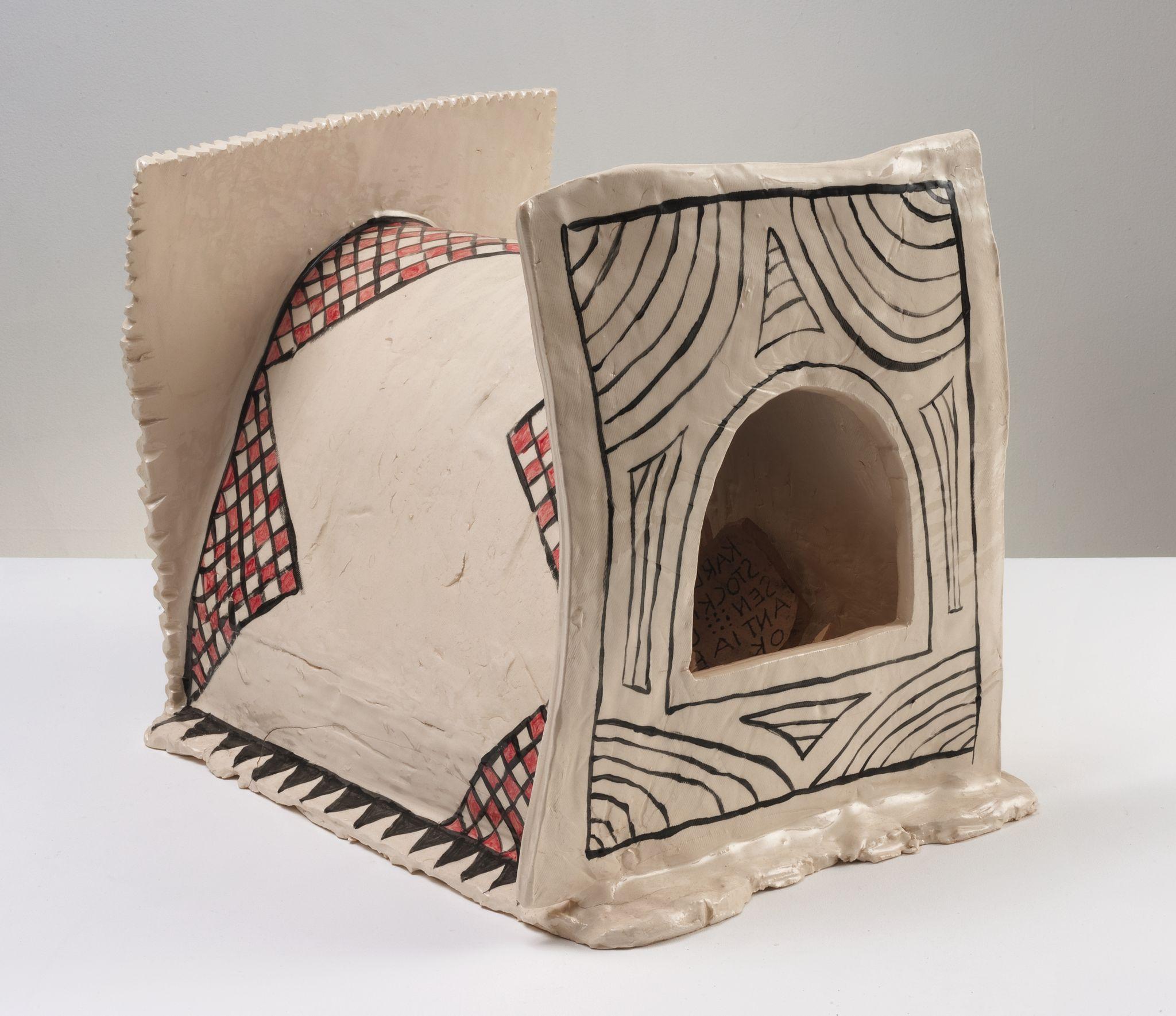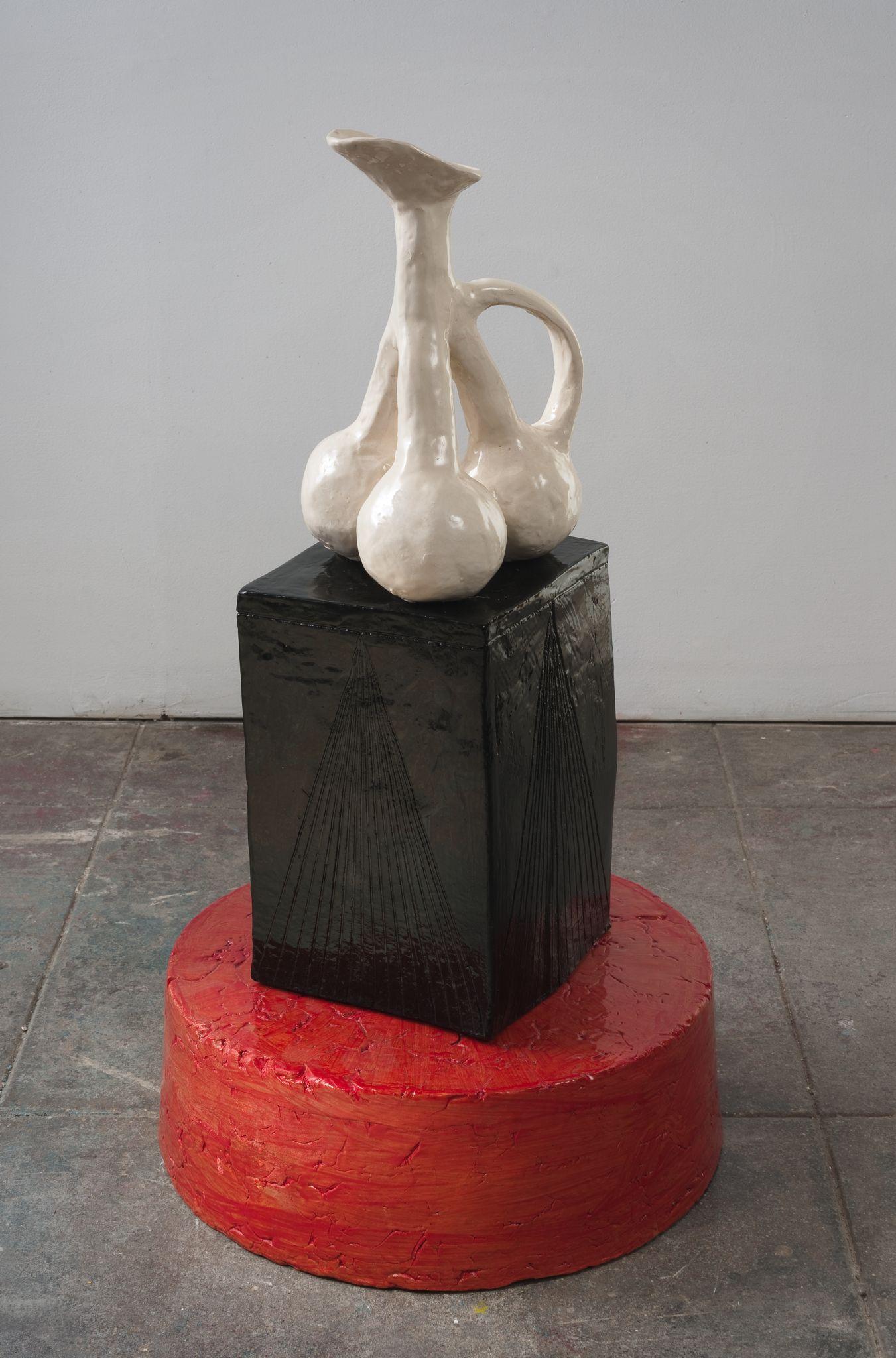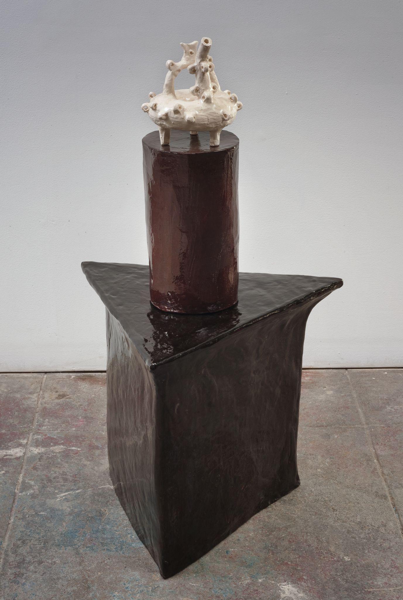 California Ras Shamra refers to the two main sources of inspiration that inform Holloway’s latest work: the history, culture and geography of California (the artist’s birthplace, where he still lives and works) and the ancient Phoenician city of Ugarit, or Ras Shamra, in present-day northern Syria. Holloway’s interest in the archaeological artefacts from Ras Shamra was sparked during a visit to the Louvre. At the time, he was also researching the history of Californian Neopaganism (an umbrella term describing a broad spectrum of contemporary religious movements that are either influenced by, or claim to be derived from, various historical belief systems practiced in the pre-modern world). California – where new-age practices and ideas have traditionally thrived – is home to a local movement profoundly influenced by Ugaritic culture. Fascinated by such contemporary expressions of archaic belief systems, as well as by the artefacts themselves, Holloway began sculpting ancient Phoenician, Cypriot and Ugaritic earthenware objects – an exercise that gave birth to the chariot forms in the exhibition.