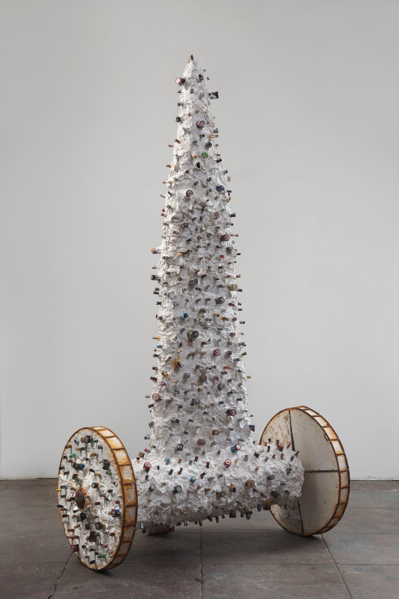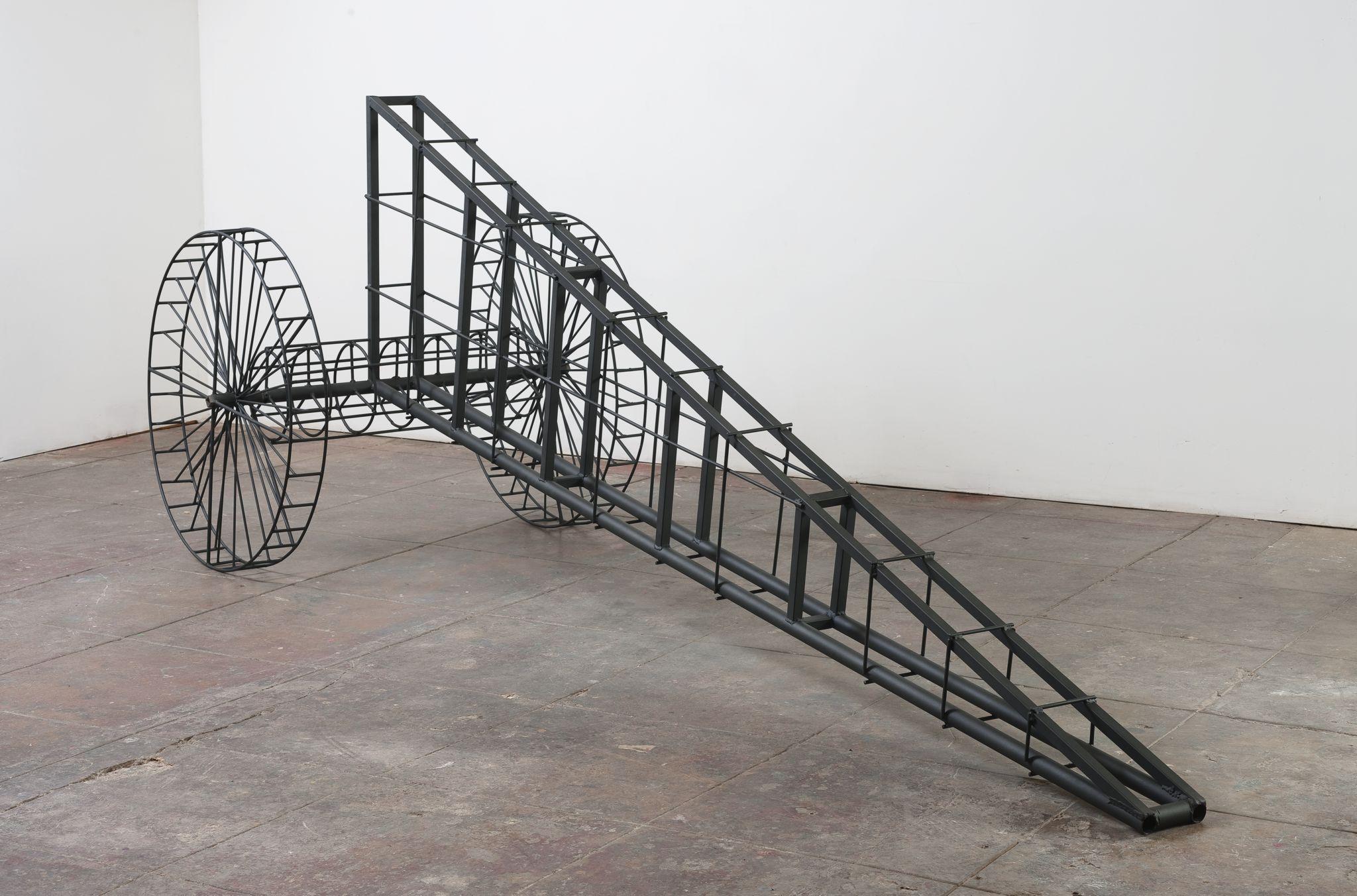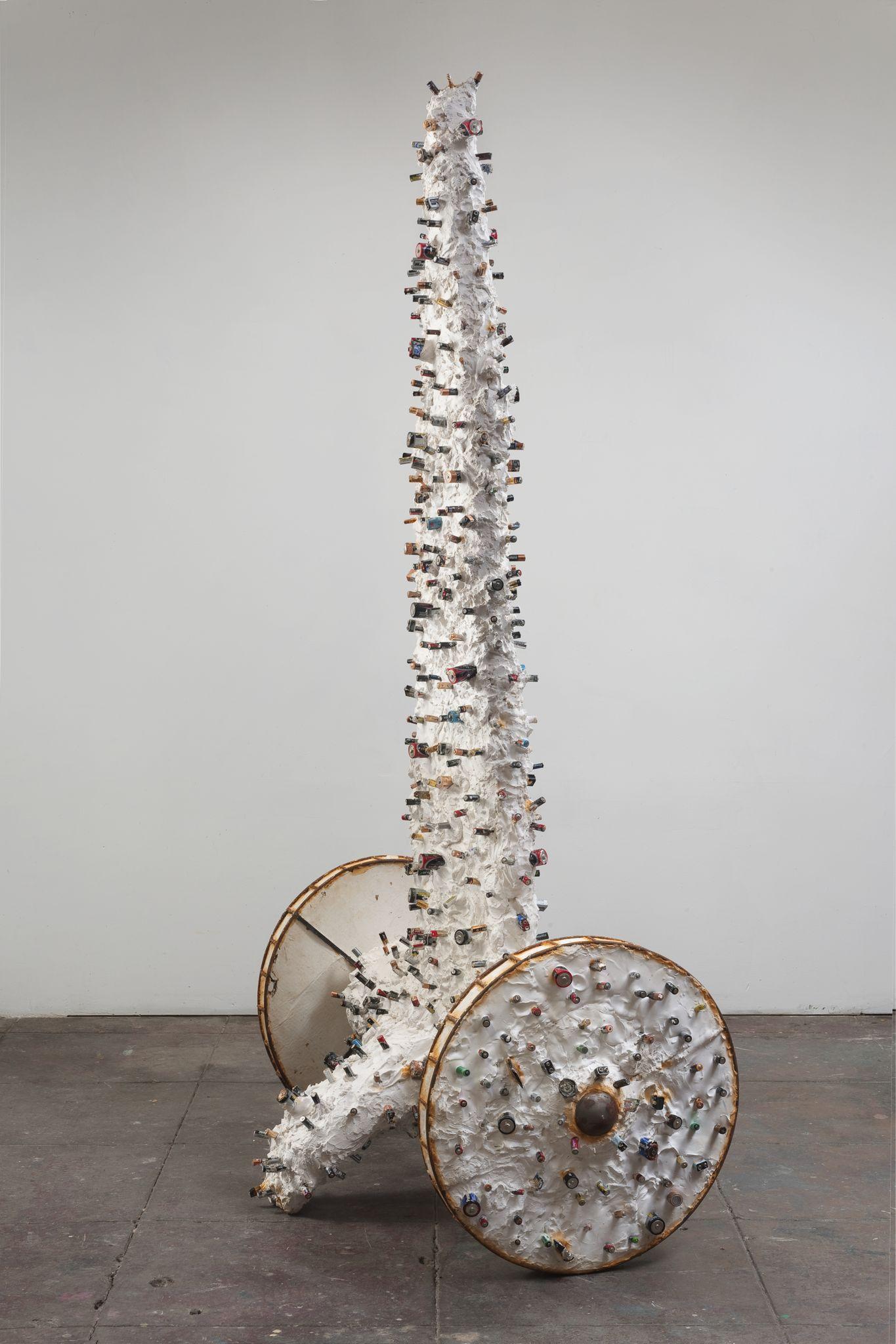 California Ras Shamra refers to the two main sources of inspiration that inform Holloway’s latest work: the history, culture and geography of California (the artist’s birthplace, where he still lives and works) and the ancient Phoenician city of Ugarit, or Ras Shamra, in present-day northern Syria. Holloway’s interest in the archaeological artefacts from Ras Shamra was sparked during a visit to the Louvre. At the time, he was also researching the history of Californian Neopaganism (an umbrella term describing a broad spectrum of contemporary religious movements that are either influenced by, or claim to be derived from, various historical belief systems practiced in the pre-modern world). California – where new-age practices and ideas have traditionally thrived – is home to a local movement profoundly influenced by Ugaritic culture. Fascinated by such contemporary expressions of archaic belief systems, as well as by the artefacts themselves, Holloway began sculpting ancient Phoenician, Cypriot and Ugaritic earthenware objects – an exercise that gave birth to the chariot forms in the exhibition.
