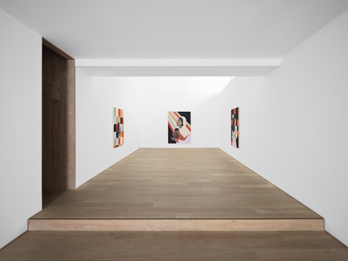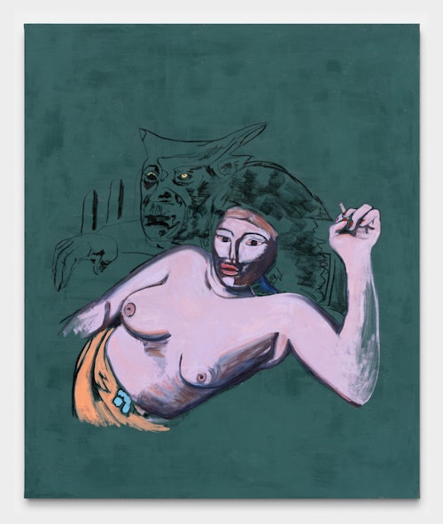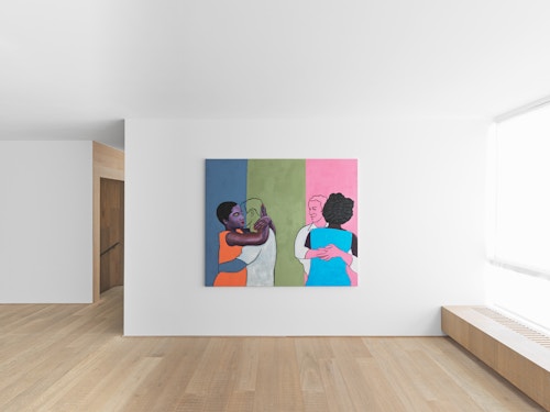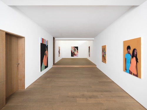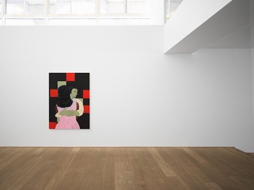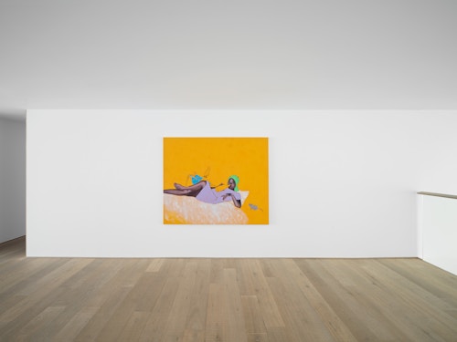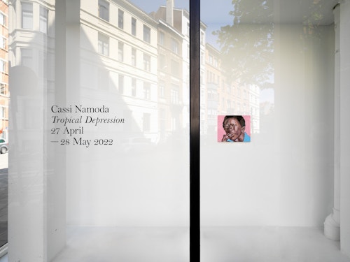 For her debut exhibition with the gallery, Cassi Namoda (b. 1988, Maputo, Mozambique) presents a new series of paintings that were created in Cape Town, South Africa and in East Hampton, New York, where she currently lives and works. The title, Tropical Depression, is both poetic and ambiguous. It is partly inspired by lived experience (a bout of illness while working in Africa) but also the destructive power of nature (a tropical depression is another word for a cyclone). Equally, it speaks to recent Mozambican history and the links between colonialism, war and the status of women. This interweaving of personal and historical references is typical of Namoda’s practice.