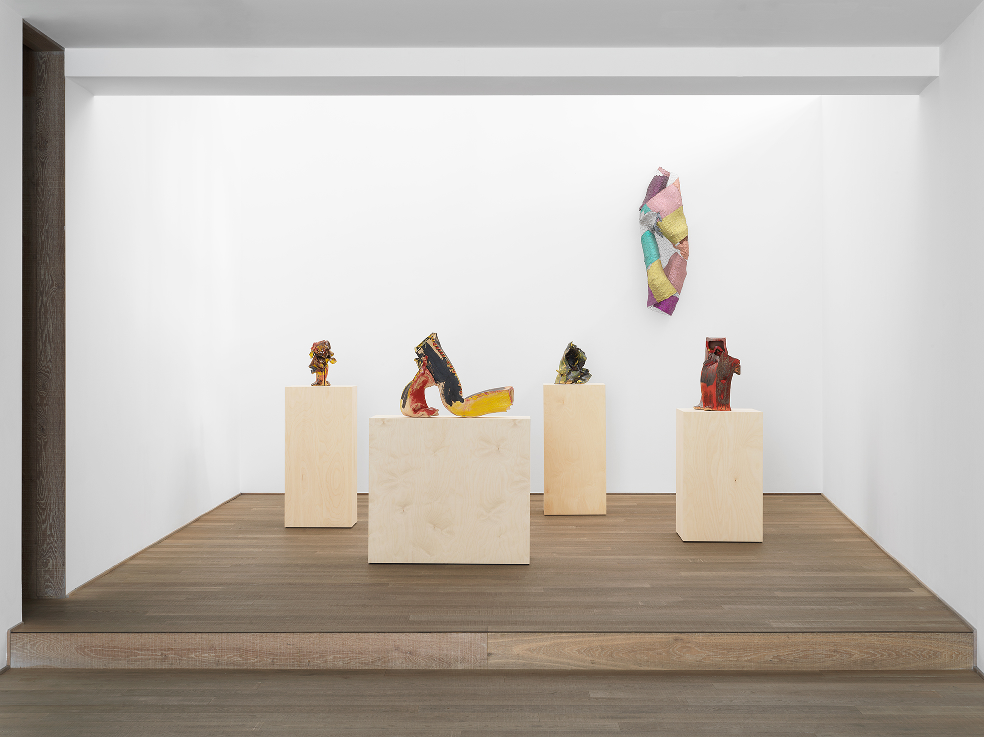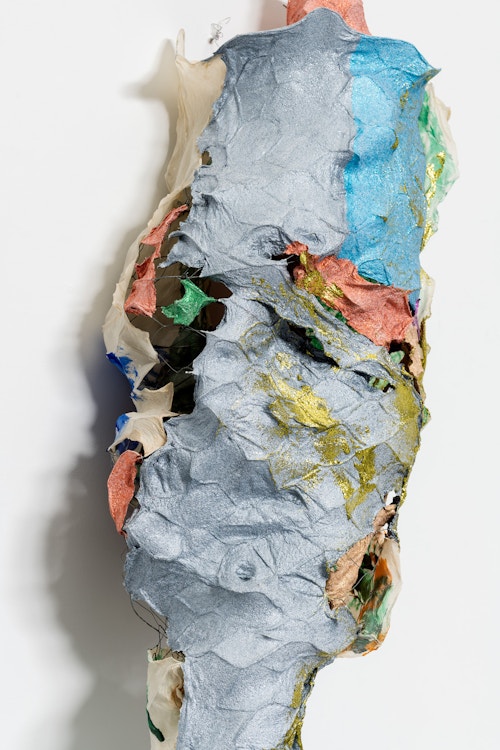 In this presentation, a series of recent wall-mounted ‘sparkle paper’ sculptures are shown in conjunction with a group of ceramics. Although seemingly incongruous in terms of scale and technique, the works on view share interesting similarities of approach and are consummate examples of the artist’s radical take on materials and processes.