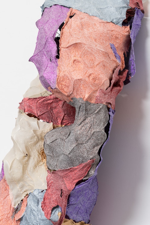 The glitter-saturated sculptures exemplify Benglis’ instinctual approach to form and colour. To create these works, she moulds sheets of wet, glitter-soaked paper around a metal armature made from chicken wire. Once dry, the works are sometimes augmented with expressive gestures in black tempera made with coal dust. Wire, glitter and paper are not new materials to Benglis, who first started experimenting with such media in the early 1970s. The columnar form is also a recurring motif. Tactile, refractive and alive with movement, the surfaces of the works express the principal leitmotiv in Benglis’ oeuvre, namely the visual representation of material in action, or what is often termed ‘the frozen gesture’. Benglis smooths the sensual and malleable paper — as fragile as human tissue — around the armatures like a skin; a process that she likens to “fleshing the form out.” The duality of the works is even reflected in the creative process, which involves brute physical force (two people to manipulate the wire) and manual dexterity (shaping the paper).