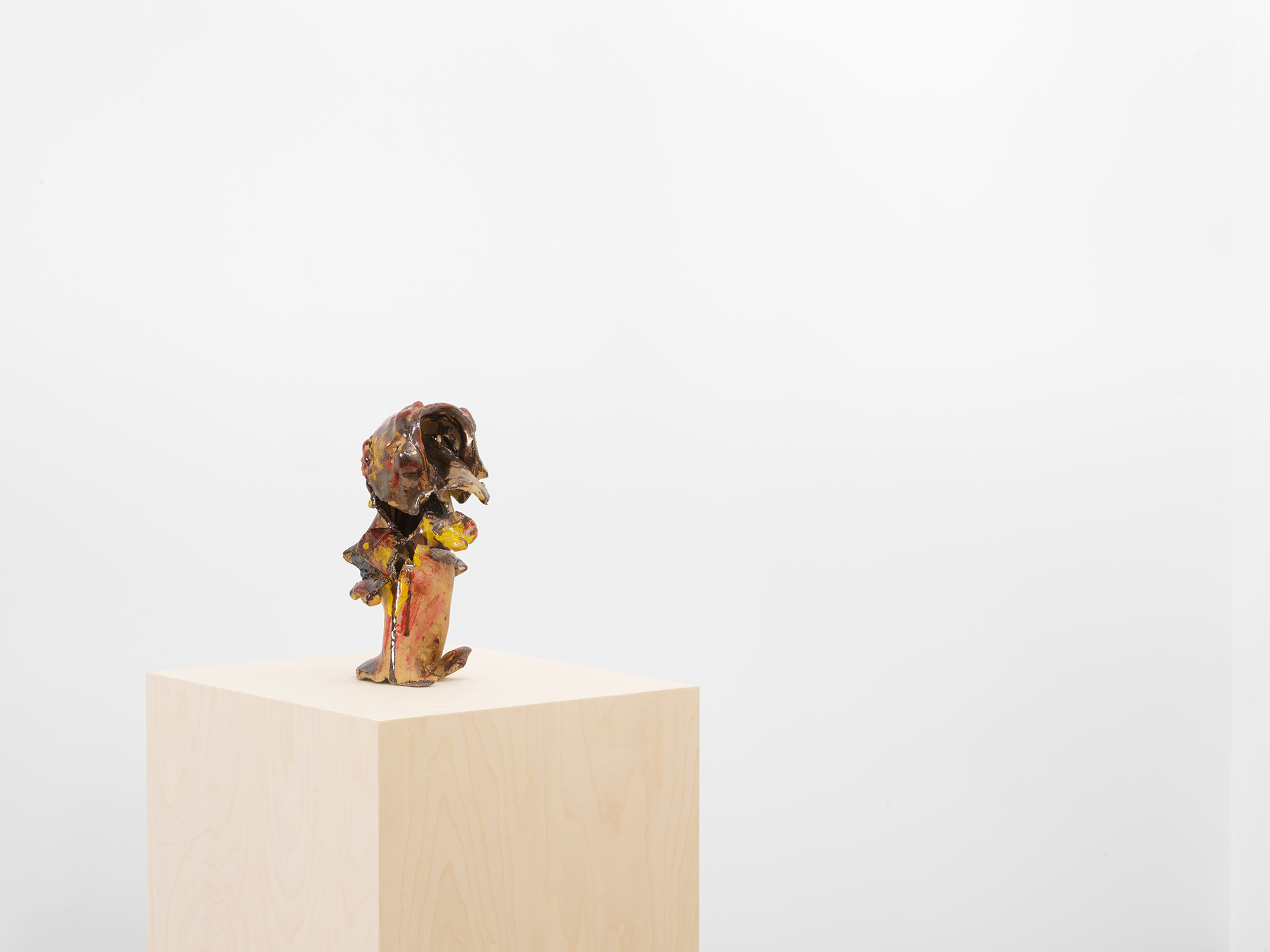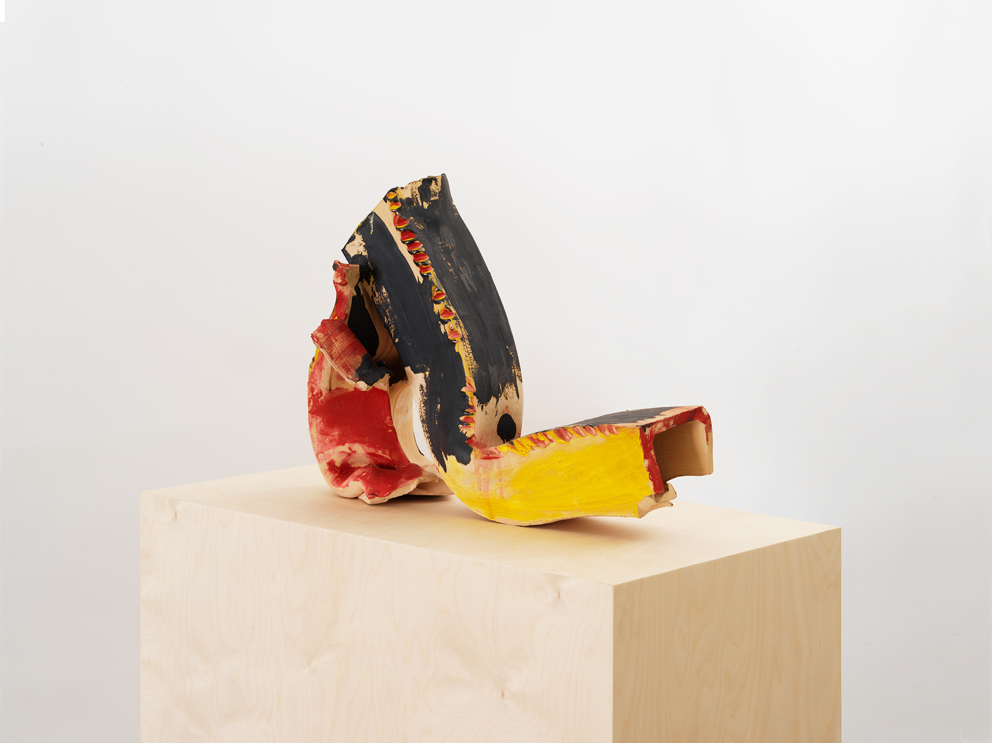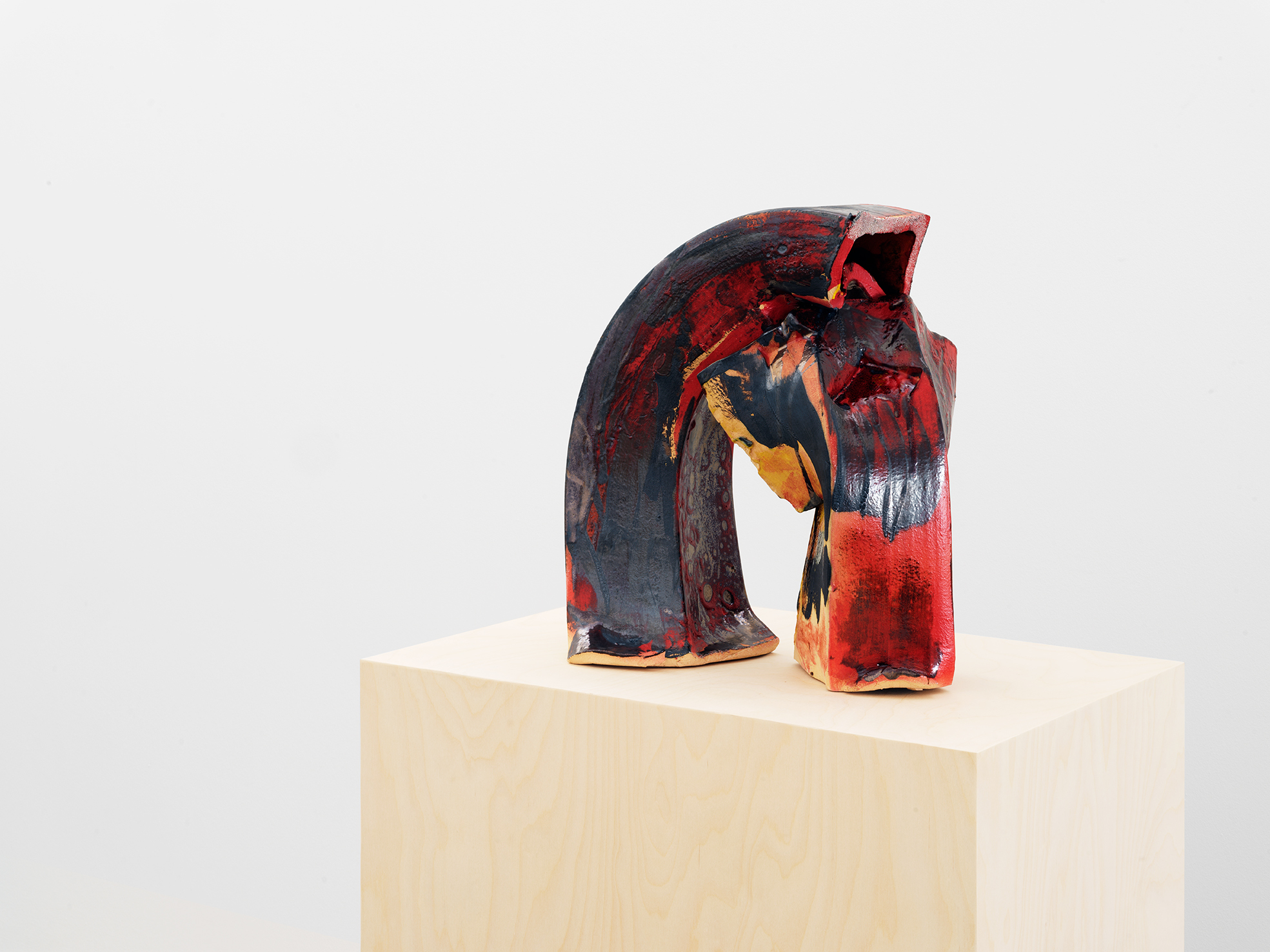 Benglis uses a similar combination of techniques to create her ceramics, which are partially made using an industrial extruder (which produces uniform circular or squared tubes of clay) but also by hand, with the artist shaping, bending, tangling and collapsing the forms before painting and glazing them in a rich palette of evocative and painterly hues. As with the paper sculptures, physical contact with the object is paramount. Benglis says: “With ceramics, I feel a need to kind of wrestle with the material and be integrated with the form and the surface.” In these free-standing works — which can simultaneously be read as sculptures, ceramics and paintings — Benglis demolishes the traditional divisions between artistic disciplines, as well as that between ‘art’ and ‘craft’, to create what art historian Bibiana Obler calls ‘antivessels’. As Benglis herself explains: “My work is an expression of space. What is the experience of moving? Is it pictorial? Is it an object? Is it a feeling? It all comes from my body. I am the clay; I have been extruded, in a sense. How to tie it together? …I am the form…They are pictorial. This is as near to painting as I’ve been.”
