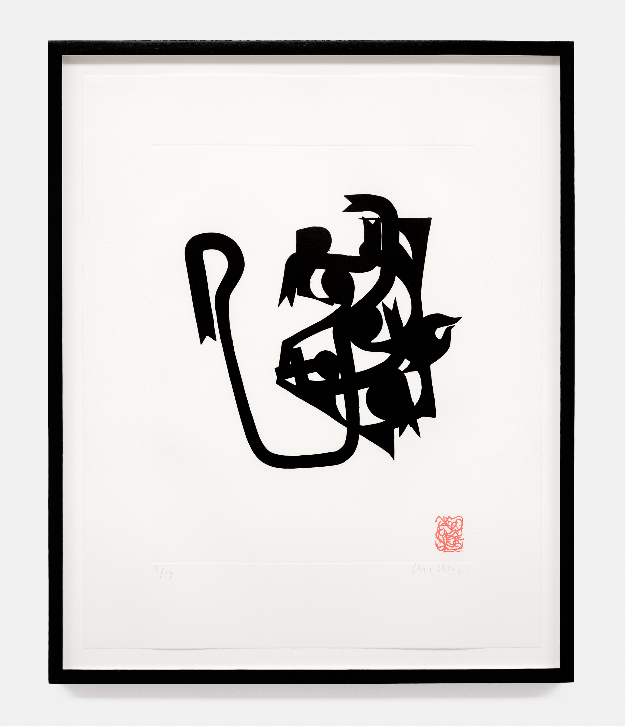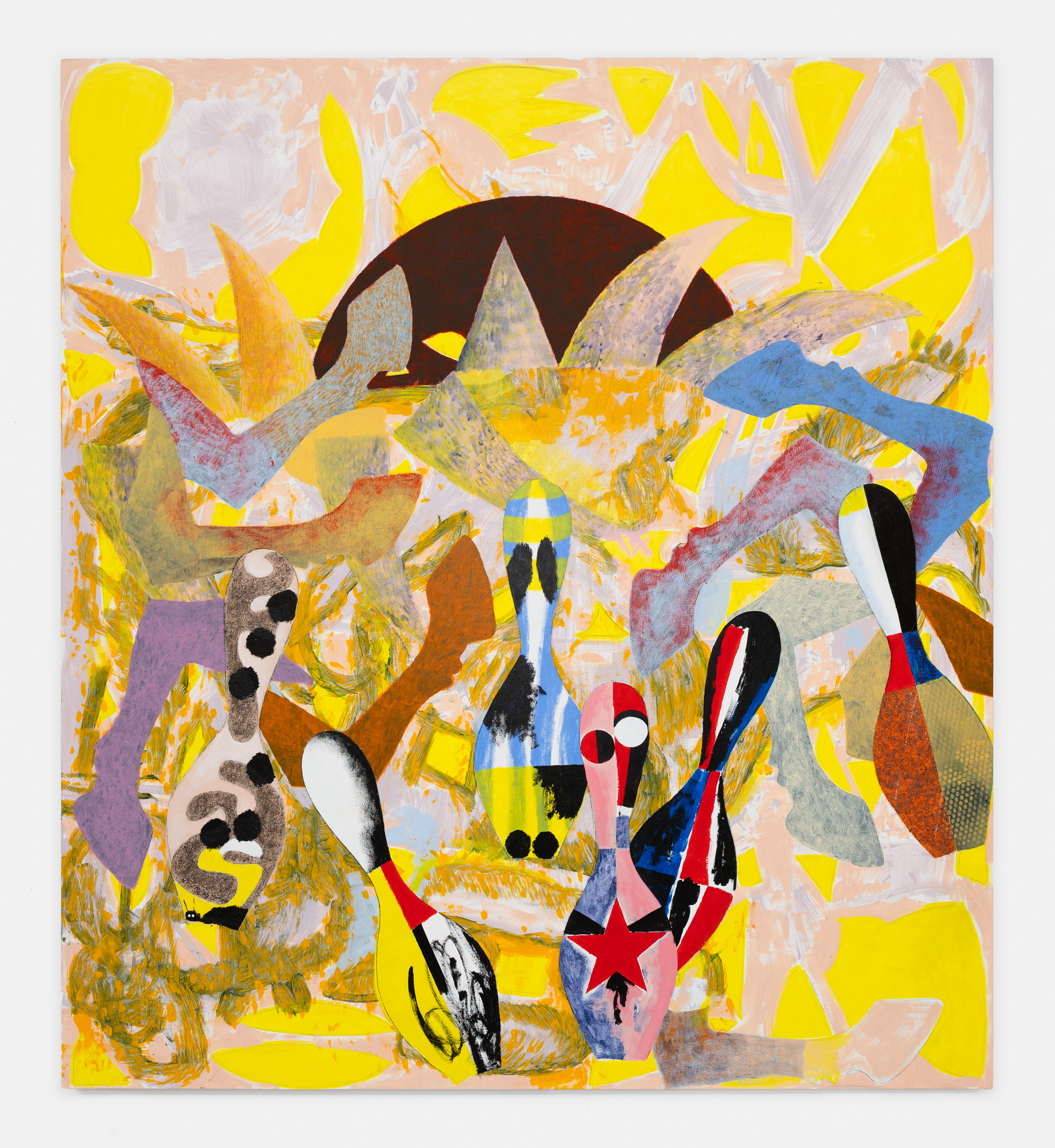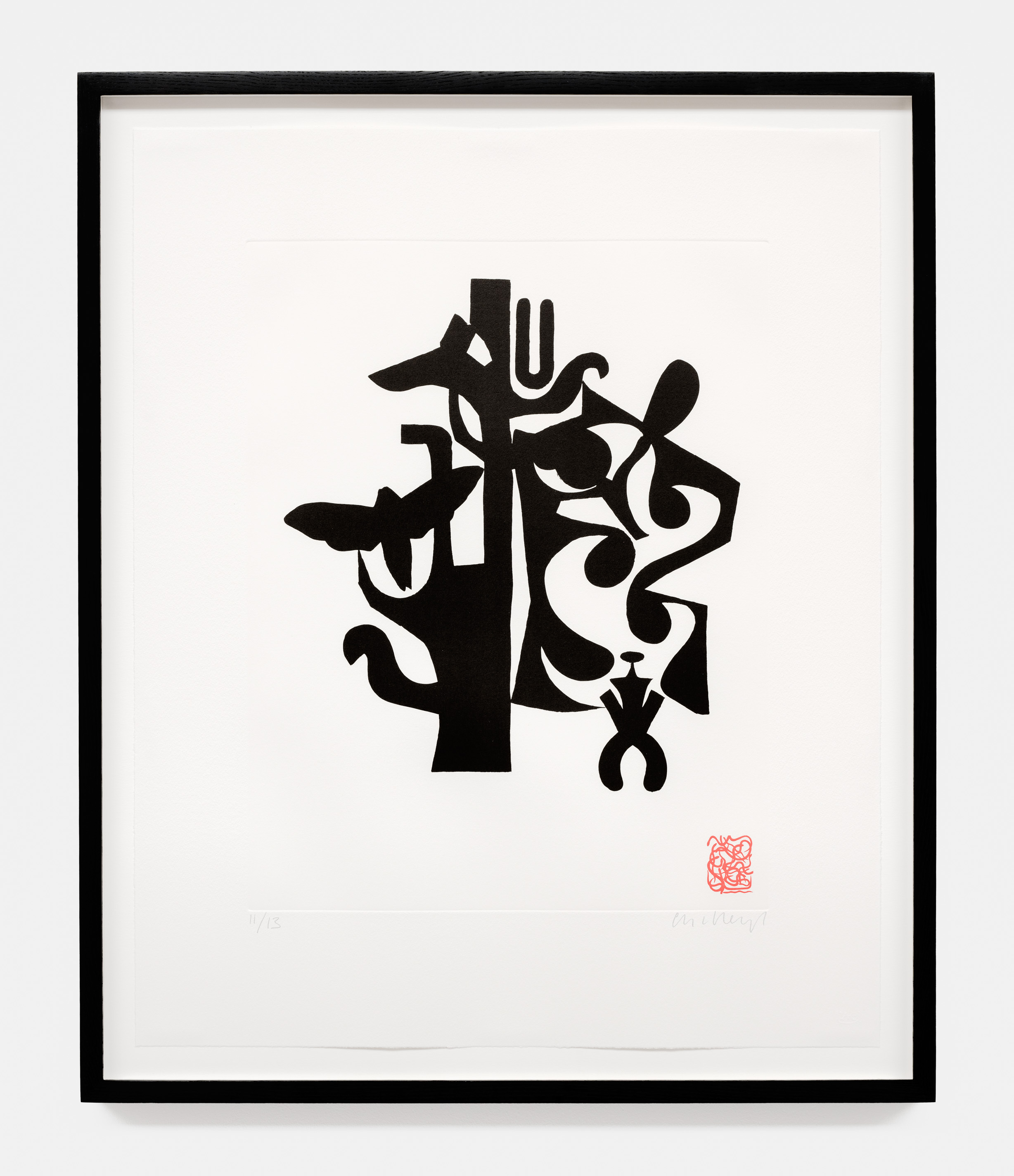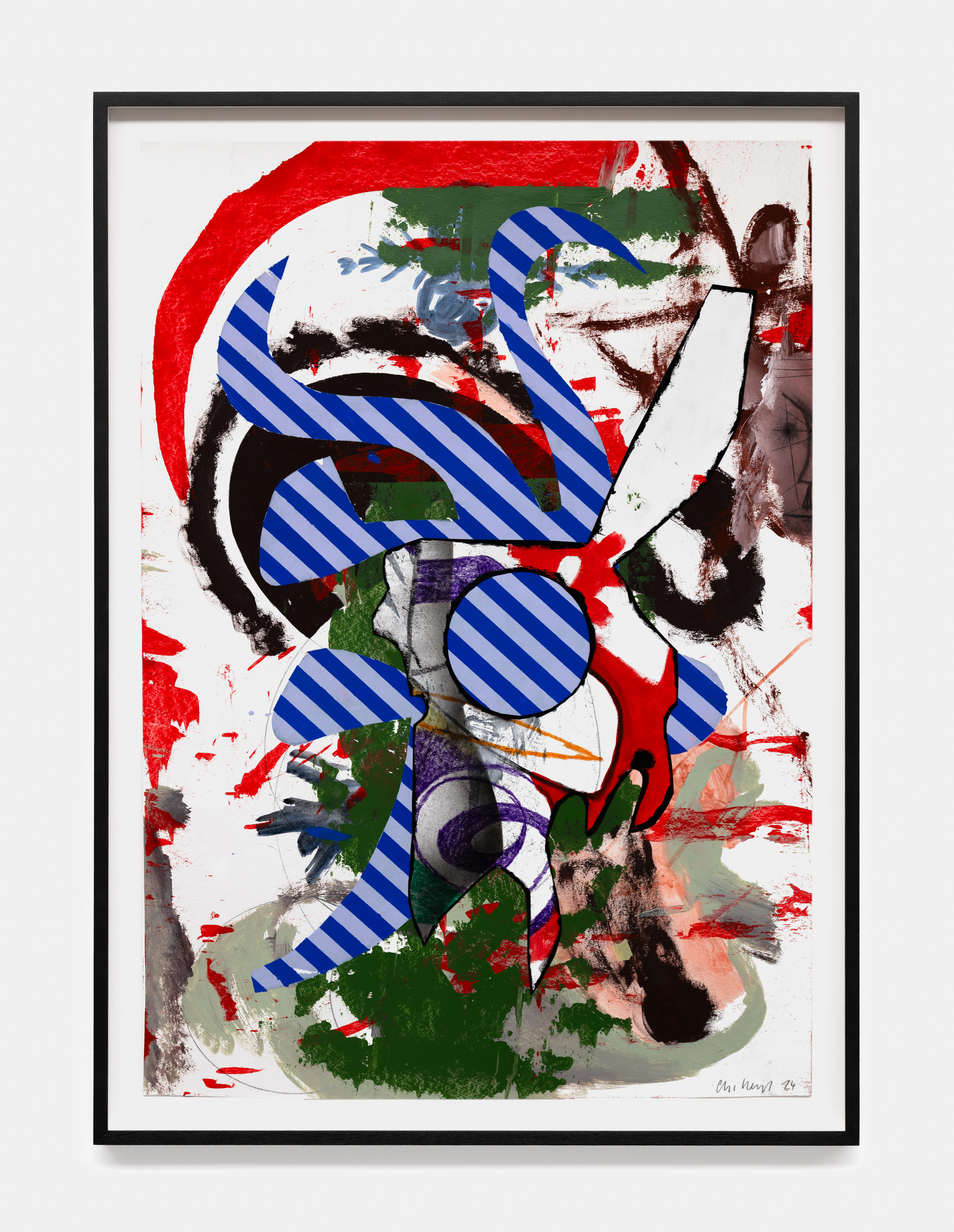 Improvisational and elusive, von Heyl’s work is charged by the tension between lyricism and its undoing. Patterns and motifs — eyes, birds, pins, swirls — may recur, not as fixed symbols but as shifting visual events. Each painting generates its own internal logic — dazzling in its immediacy, rigorous in its construction, and defiantly resistant to categorisation. In Kunterbuntergang, for example, bowling pins — one of her recurring motifs — bob in and out of focus, tumbling and falling. The tondo PanAm, pushes this vitality even further: gestural dynamism collides with graphic flatness in a composition that feels both unruly and carefully calibrated. This spirit of experimentation and curiosity extends beyond the canvas. Her works on paper and etchings are not supplementary but integral — charged with the same velocity, rigour, and subversive play. Agile, intuitive, and texturally rich, they offer parallel inquiries into the possibilities of image-making.