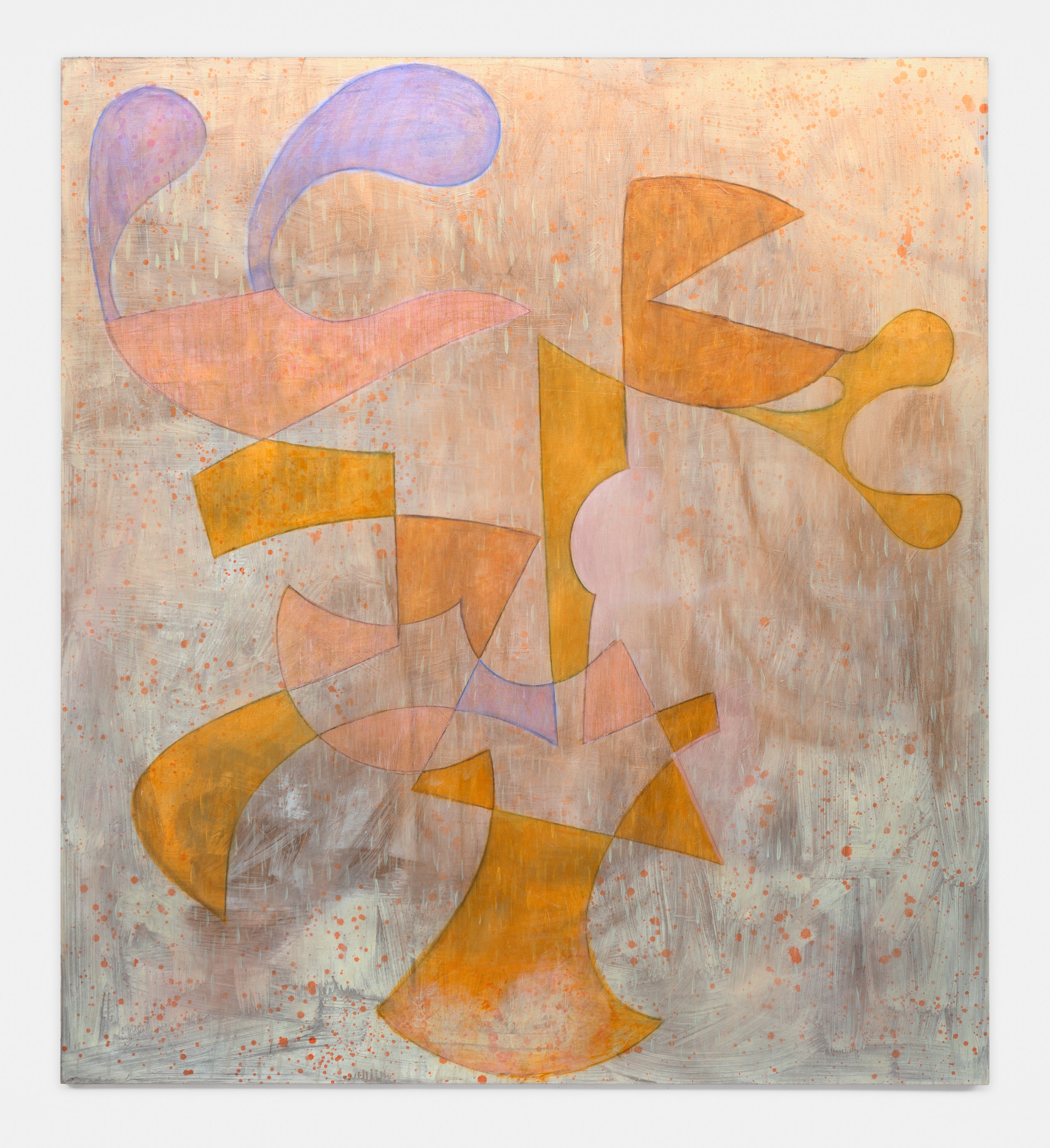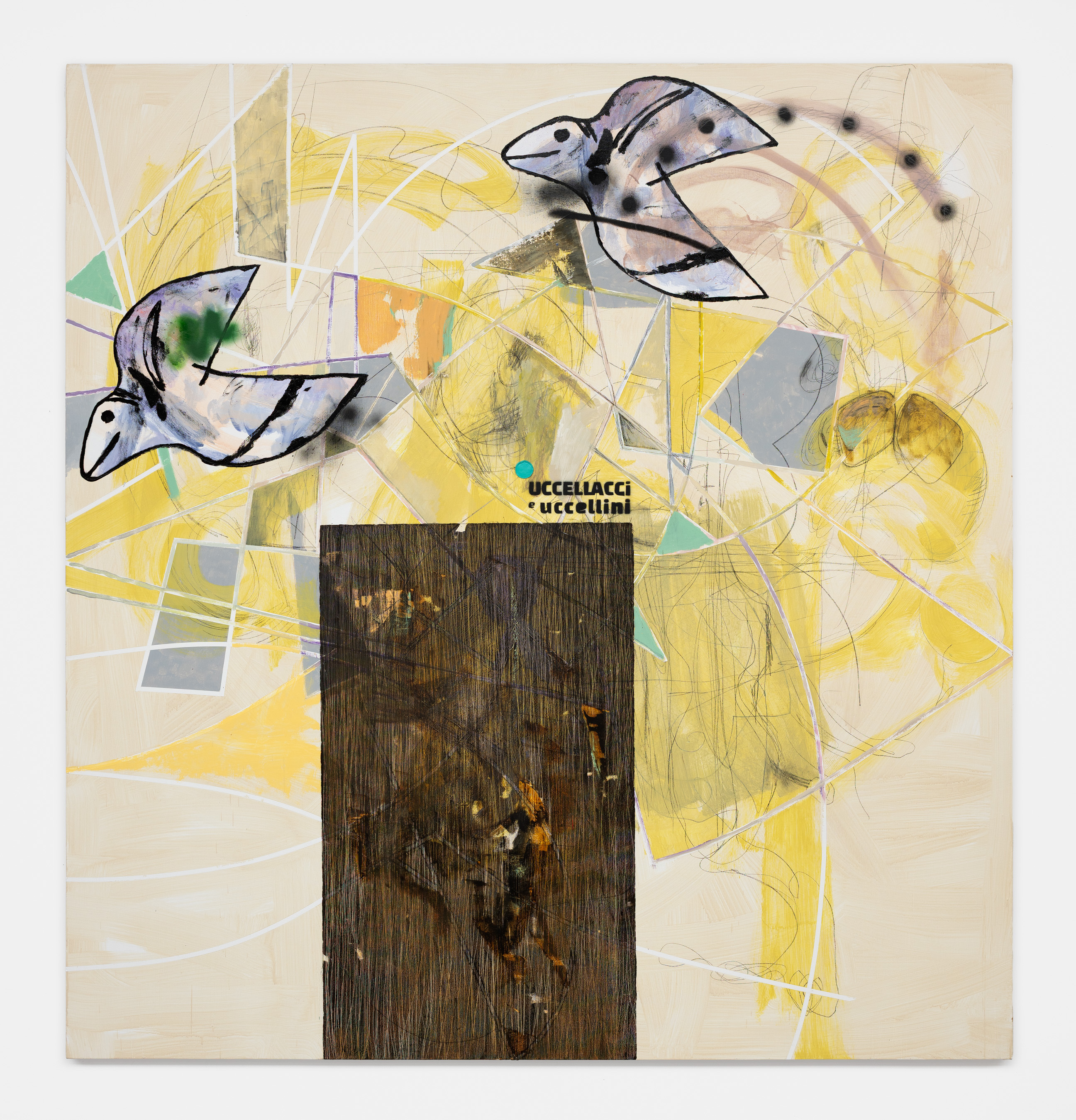 Restraint, too, has its place. Some works soften exuberance in favour of tonal clarity and compositional stillness, where reduction becomes a form of intensity. Yet even these paintings remain irreverent, never solemn or doctrinaire. Decreation, for instance, smuggles in a witty undertone. This subtle provocation extends to von Heyl’s titles, which offer glimpses into a thought-world that teases without revealing. Whether borrowing from Rilke’s lyricism or adopting the deadpan register of generic prose, von Heyl’s fleeting allusions shimmer at the surface. Uccellacci e uccellini, named after Pasolini’s film The Hawks and the Sparrows, depicts two birds mid-flight — an unusually direct gesture in von Heyl’s elliptical lexicon. A central theme in the film — the protagonists’ attempt to decipher “the language of birds” — echoes her own interest in encrypted communication. This theme surfaces again in Speak in Spores, whose title evokes a vegetal mode of communication, inspired by how trees and fungi communicate underground. This biosemiotic view — where forms “speak” in nonhuman registers — mirrors von Heyl’s own aesthetic: complex, open-ended, vibrational.