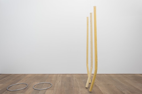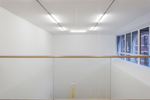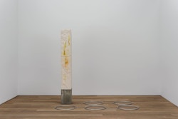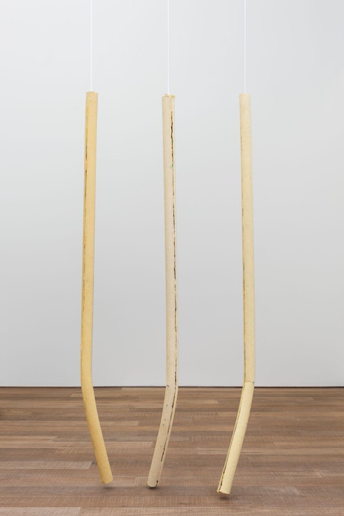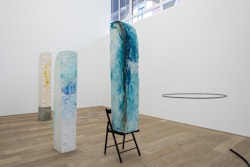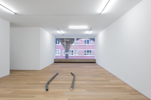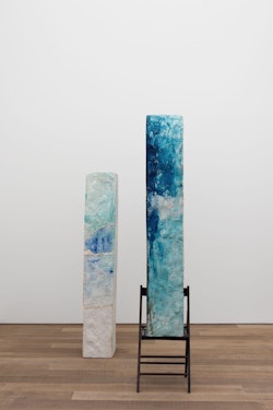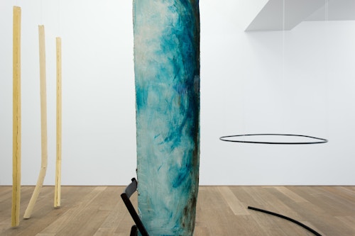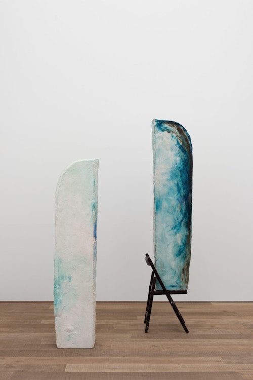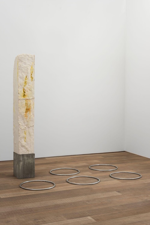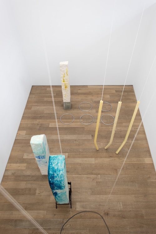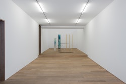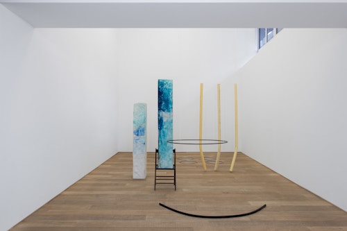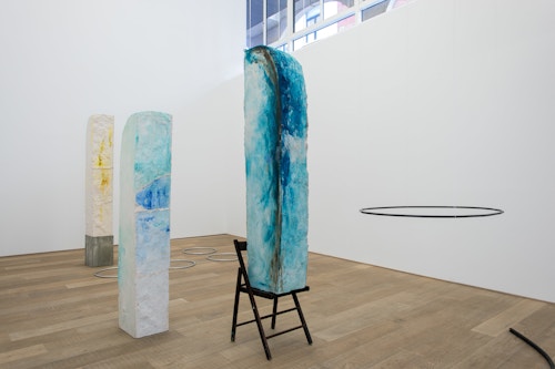 For CHERE: Sculpture, her first exhibition with the gallery, Kläs has conceived an installation of vertical monoliths, hanging works, and floor pieces at the end of the ground floor space. Her monoliths in pigmented resin have an anthropomorphic dimension, and there is a raw, enigmatic quality to their irregular forms. A single drawing punctuates the sculptural presentation. The balcony on the first floor space, which Kläs has chosen to leave empty, gives another perspective on this concentrated encounter.