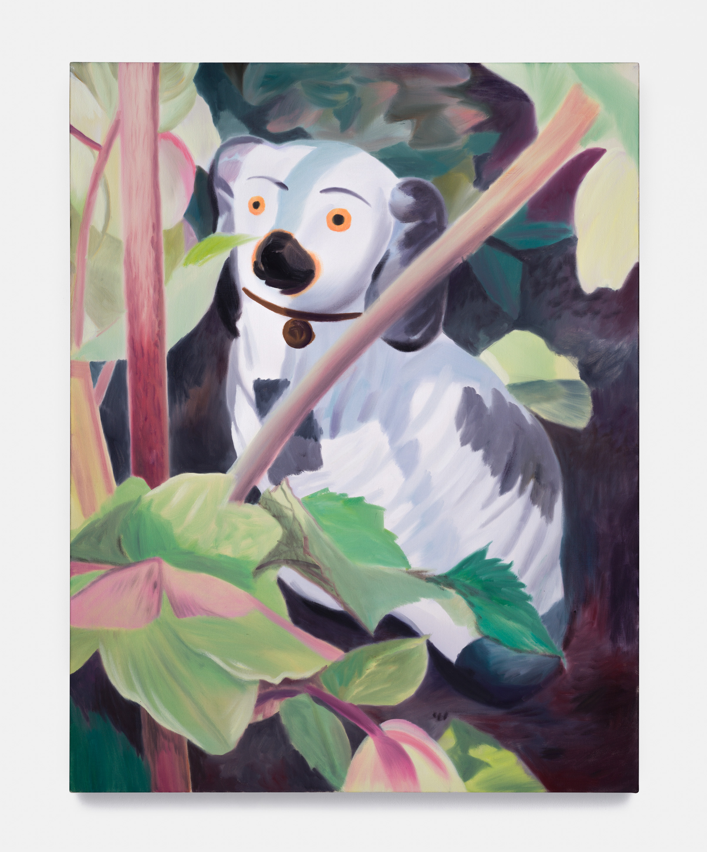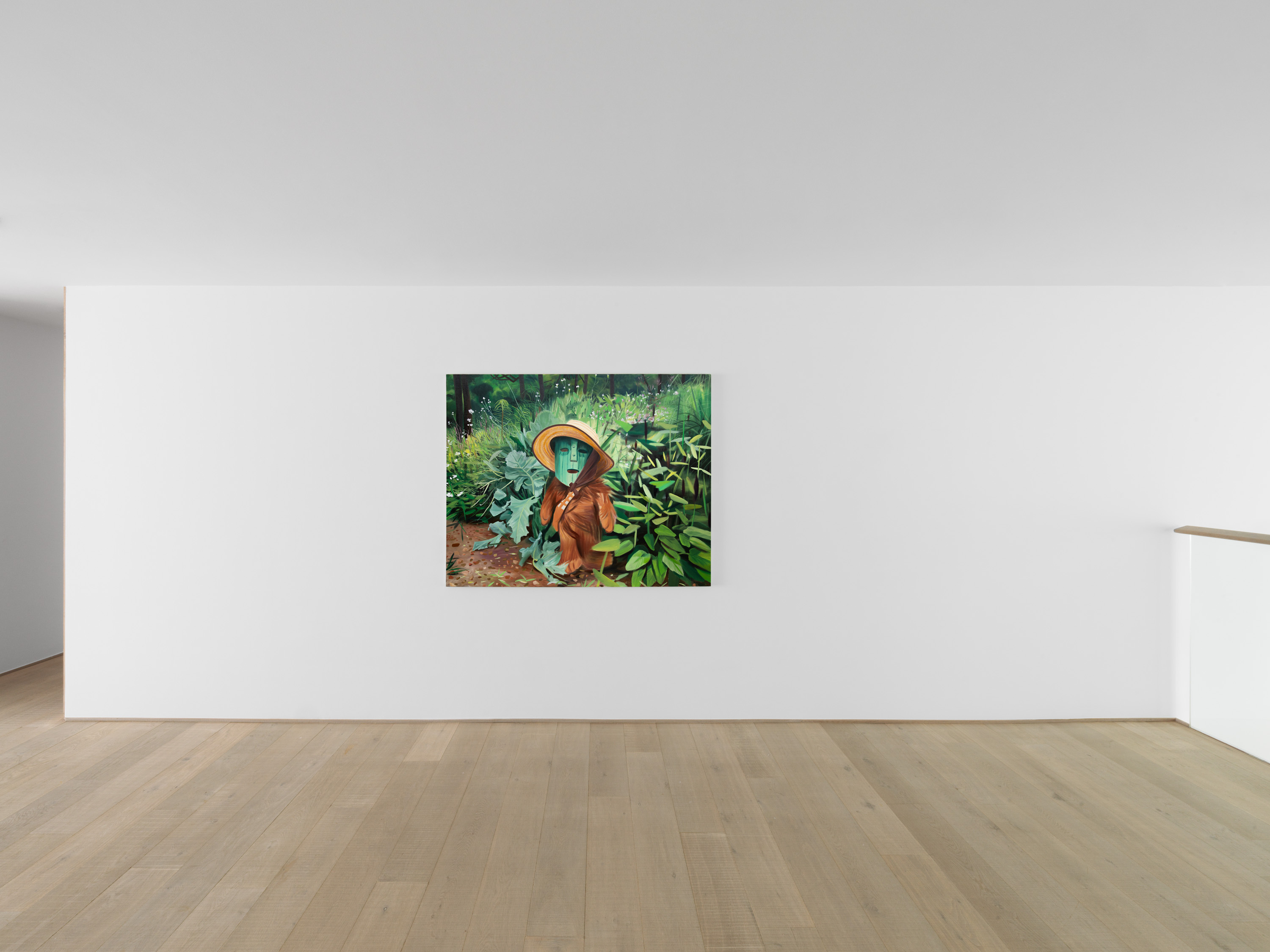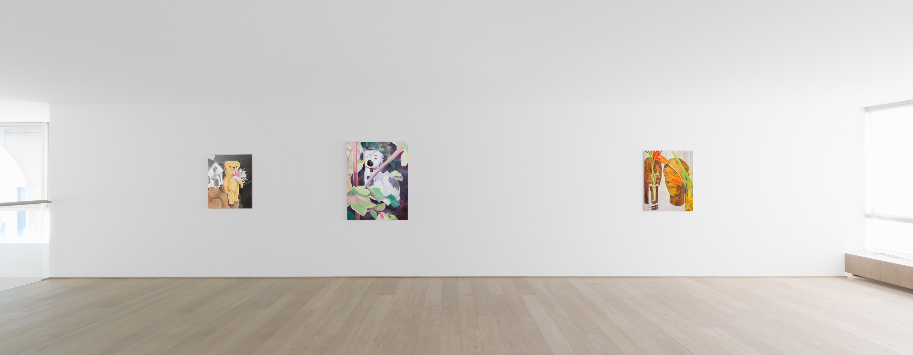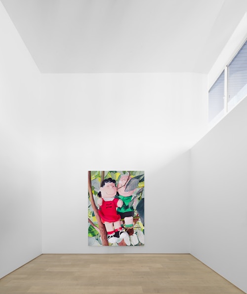 Imai’s process is rooted in direct observation and typically begins with the arrangement of real-life objects—both indoors and outdoors—into carefully staged tableaux. These composed scenes form the basis of her visual world, drifting between reality and the otherworldly, and echoing Freud’s notion of the uncanny (das Unheimliche). Imai’s process as such is poignantly exemplified in LOVERS (2025), a monumental painting depicting Charlie Brown and Lucy toys nestled in a tree outside her window. Here, the unusual arrangement of the figures becomes imbued with an uncanny atmosphere, heightened by the work’s spatial dissonance and sense of arrested motion. The scale becomes a conduit for emotion: the over-enlarged toys elicit both tactile intimacy and an unsettling distance, as if the viewer is drawn into a private world while simultaneously held at its threshold.