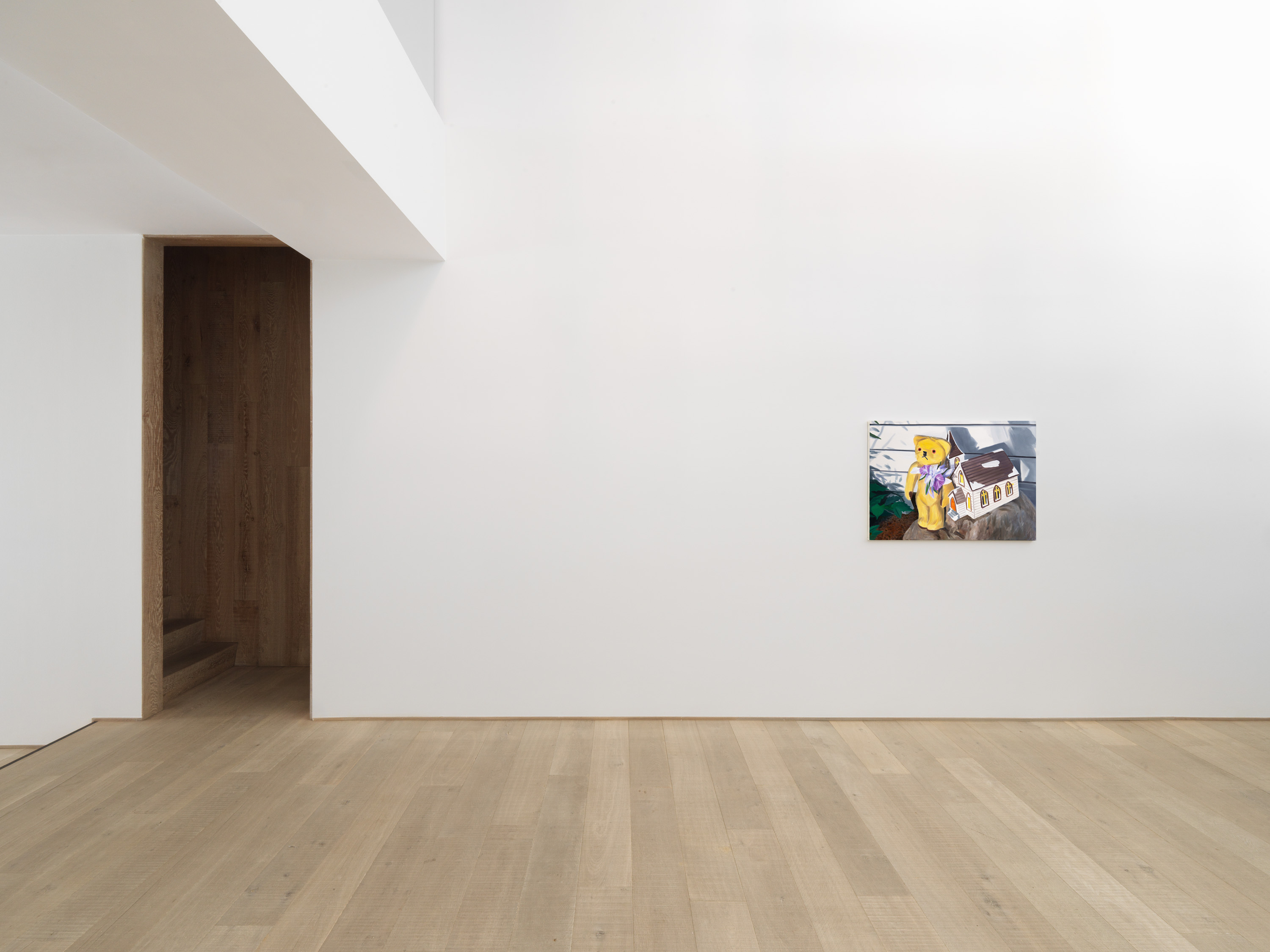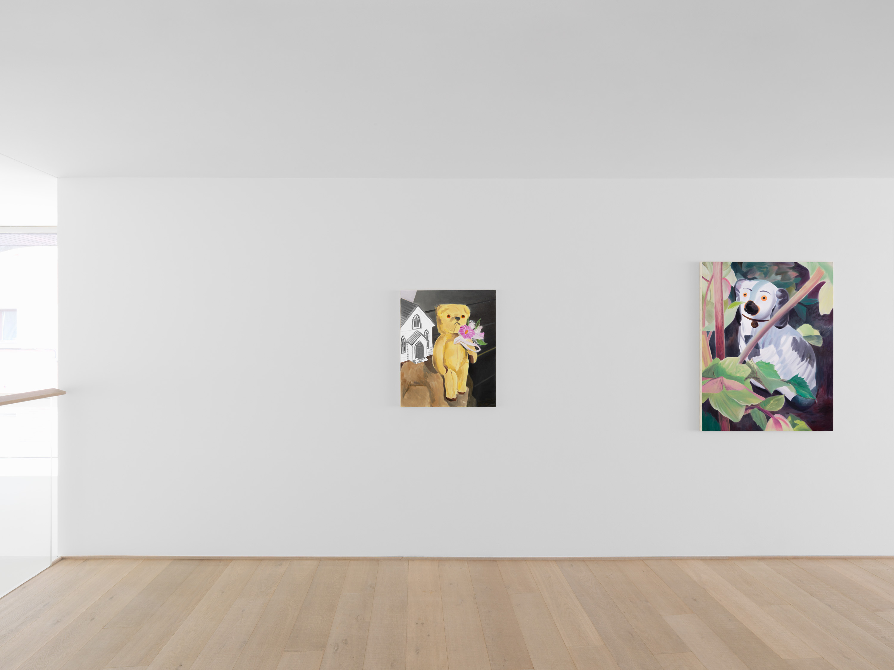 This subtle disorientation also permeates CONEY ISLAND (2025), in which two teddy bears in bathrobes sit quietly on a deserted winter beach, a shuttered amusement park looming in the distance. Inspired by Imai’s visit to New York, the painting evokes a melancholic stillness—a sense of narrative suspended. Though absent of human figures, the bears appear inwardly animated, their postures suggesting introspection or silent dialogue. As Imai notes, “An amusement park only functions when there are children playing—it is a symbol of peace. An amusement park without human presence therefore creates a dangerous atmosphere.” Her compositions often juxtapose starkly contrasting registers, which coexist within the same frame.