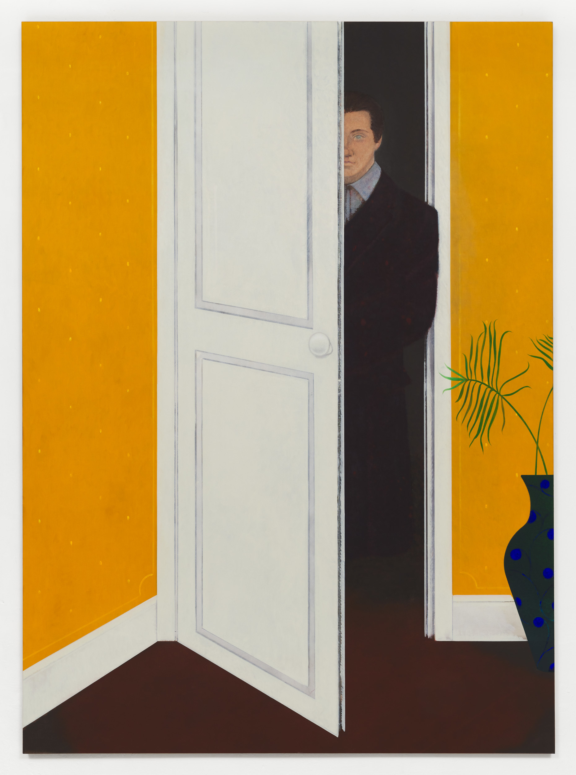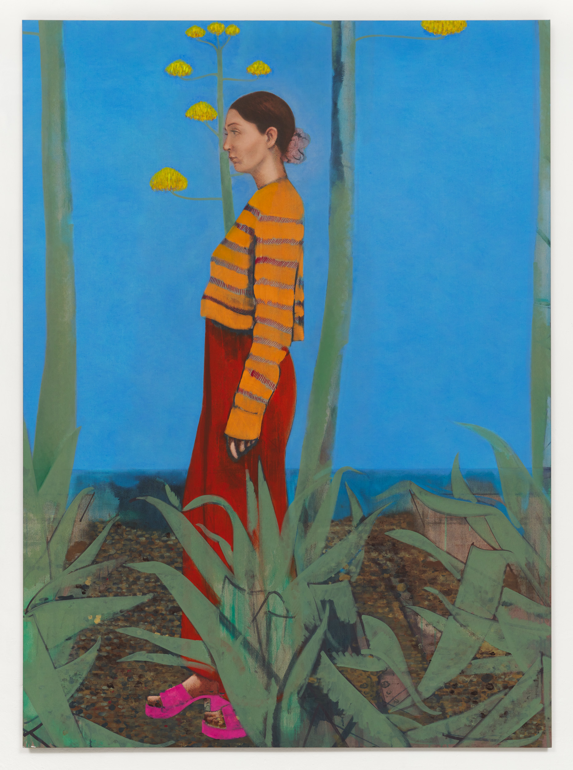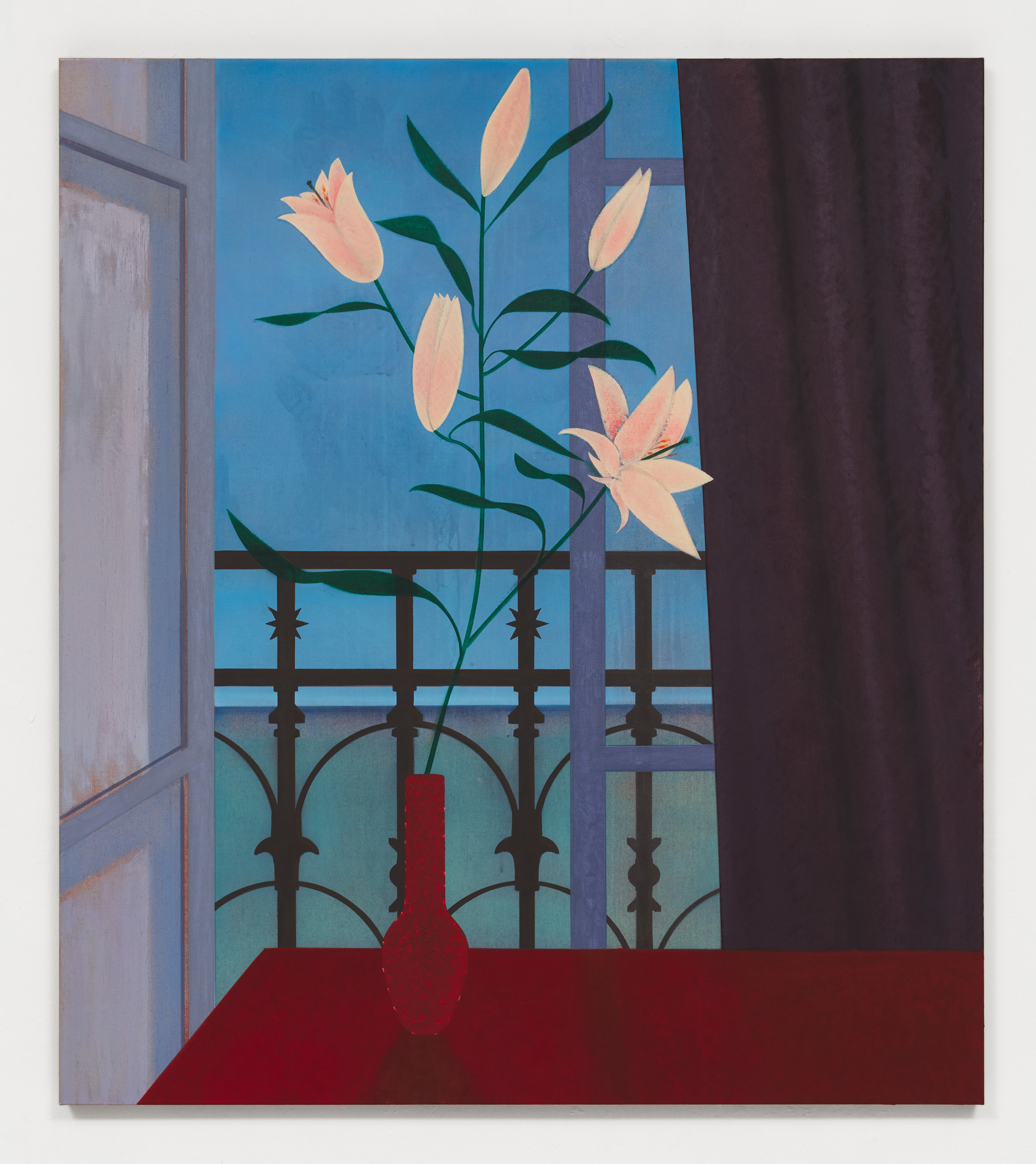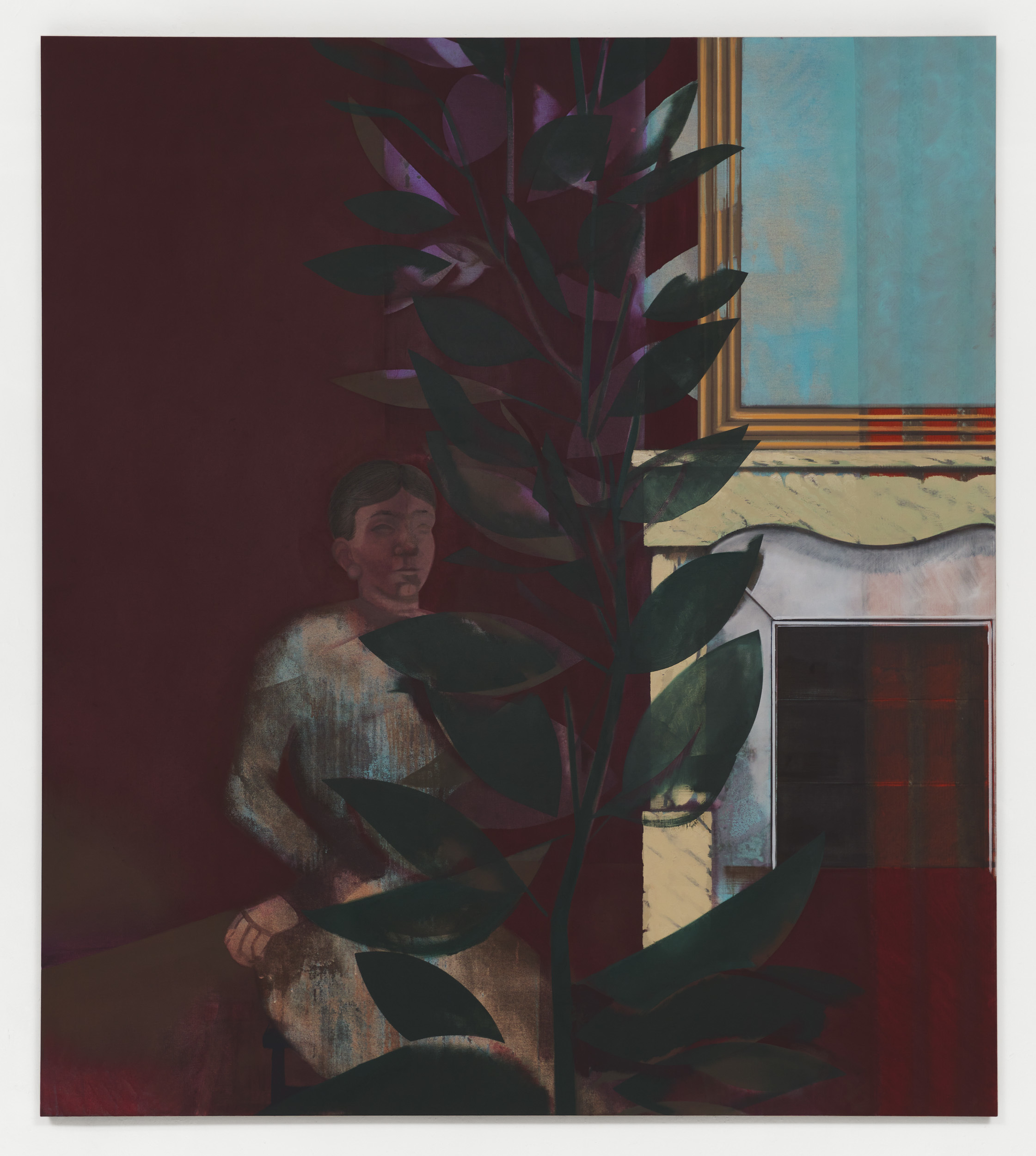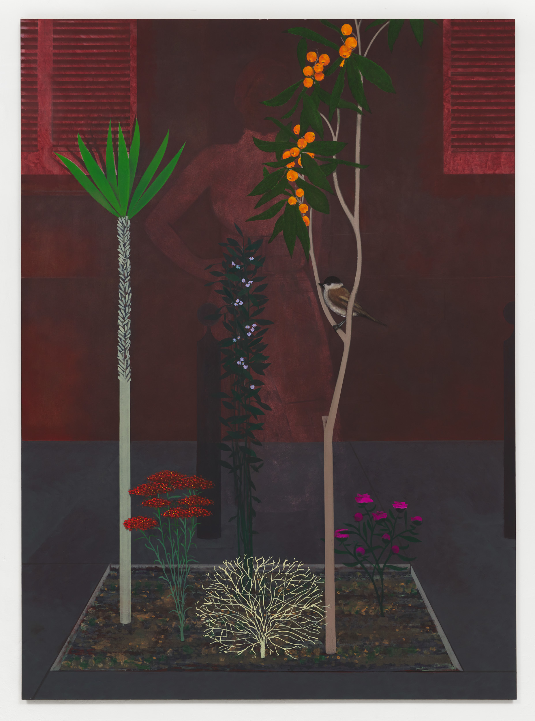 The ghostly female form that can also be seen in La Nonnette offers an insight into Nitsche’s practice. He is an artist who works and reworks his images, repeatedly adding and subtracting colours and elements. The compositions evolve over time and, in some instances, are completely transformed. Shadowy vestiges of previous details can occasionally be glimpsed in the paint layers, all of which hint at a narrative in relation to the complex genesis of the works. Nitsche’s paintings are also exercises in colour and composition, with his style alternating between hard-edged, colour-blocked schemes and delicate brushwork. The tonal relationships, which can be complimentary or contrasting, play a defining role in the creation of atmosphere. Evocative shades of brown, aubergine and grey in combination with vivid hues of green, yellow or pink, for example, only serve to underscore the historical and contemporary dialectic in his work. This push and pull between past and present ebbs and flows in Nitsche’s practice. At times, the art historical references have a clear presence, as evidenced by Le Chant, which is partly inspired by the colour and structure of La Répétition de chant (1917) by Edgar Degas. At other times, the allusions simmer below the surface, as in Rue de Rome, a streetscape that, despite the present-day attributes, has an almost bygone feel. Other works contain a latent symbolism. Agave plants, which are native to South America, can live for thirty years and flower just once in their lifetimes before dying. In Mexican culture, the flowers symbolize love and fidelity, while the roots are a sign of stability in marriage. Fans were once synonymous with a secret language of love. Rubber plants (ficus elastica), as seen in La Petite Visite, are emblematic of abundance, happiness and wealth; oranges with fertility and prosperity; roses with love; lilies with devotion or purity; black cats with good (or bad) luck; the mésange nonnette (poecile palustris) bird with simplicity, spontaneity, marital happiness and fidelity; and butterflies with change, transformation and immortality, amongst other things. Yet for all such inferences, Nitsche’s work remains autonomous, personal and firmly rooted in the here and now.